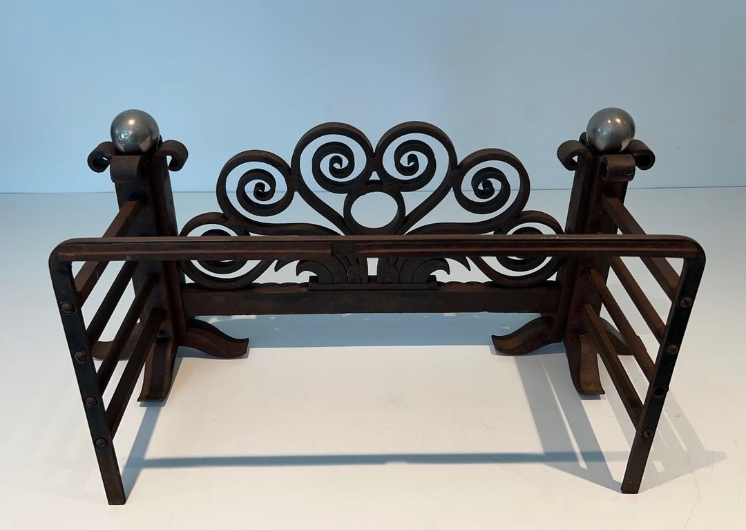 This exceptional log cradle or pair of andirons exemplifies the grandeur of French Art Deco ironwork at its peak, executed in the monumental vocabulary pioneered by Edgar Brandt (1880–1960), the unrivalled master of decorative wrought iron during the interwar period. Measuring 80.5 centimetres in width, the piece commands attention through sheer scale alone, yet it is the density and sophistication of its ornamental programme that truly sets it apart.