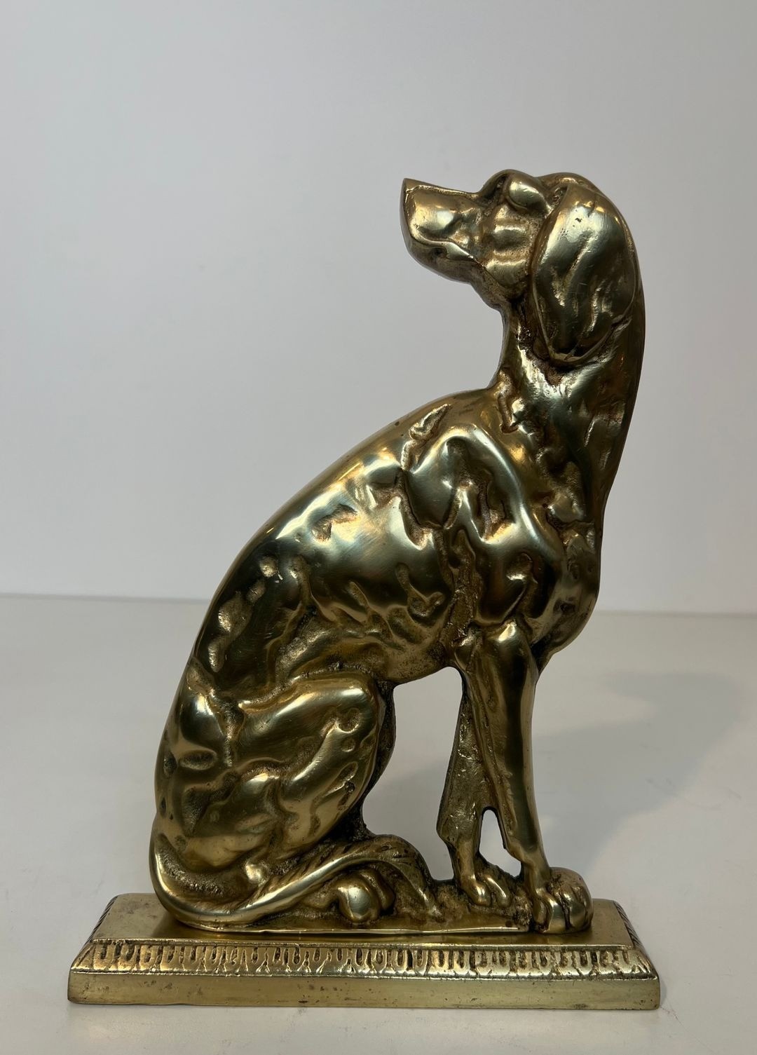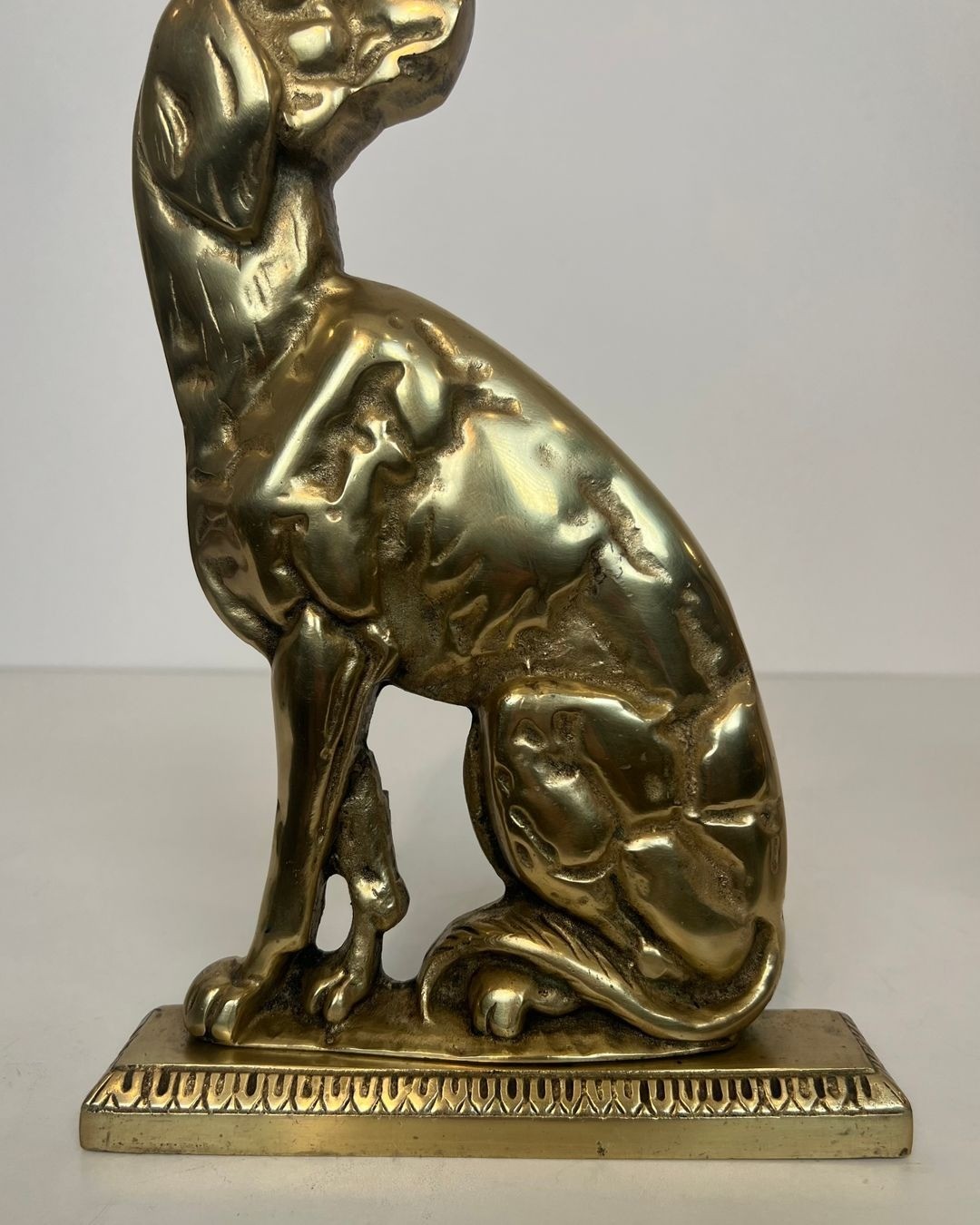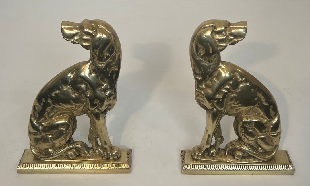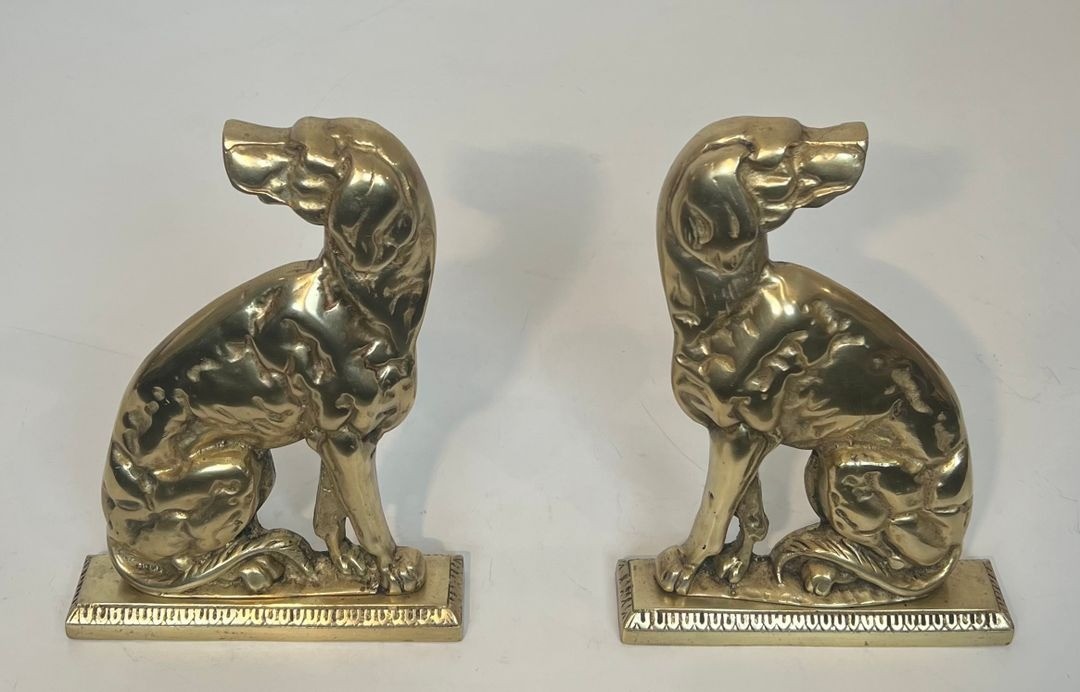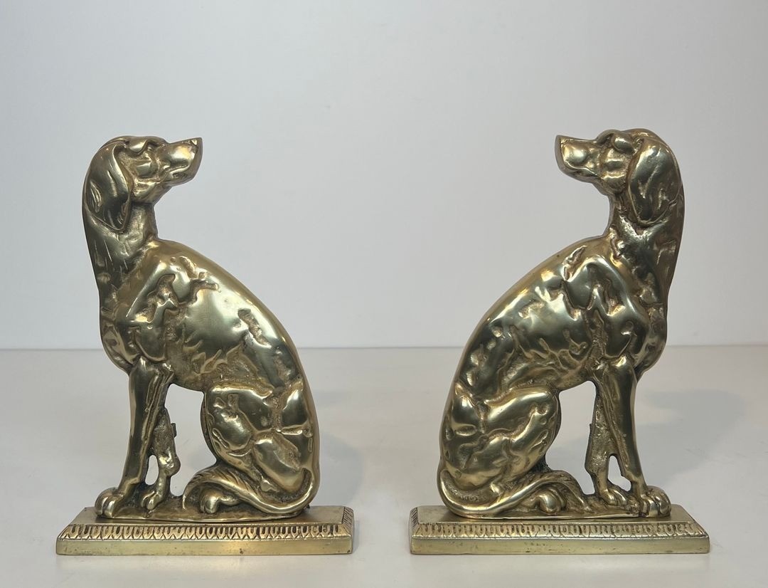 French bronziers of the 1920s and 1930s frequently chose the dog as a motif for luxury furnishings, echoing its prominence in the decorative arts of the period alongside other favored animals of the Art Déco menagerie. The present pair, with its strongly stylized modelling and robust casting, represents a characteristic example of this production.