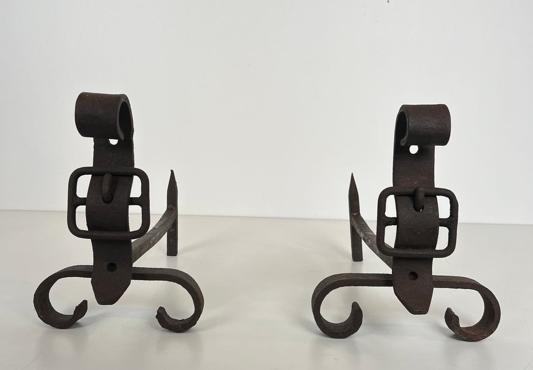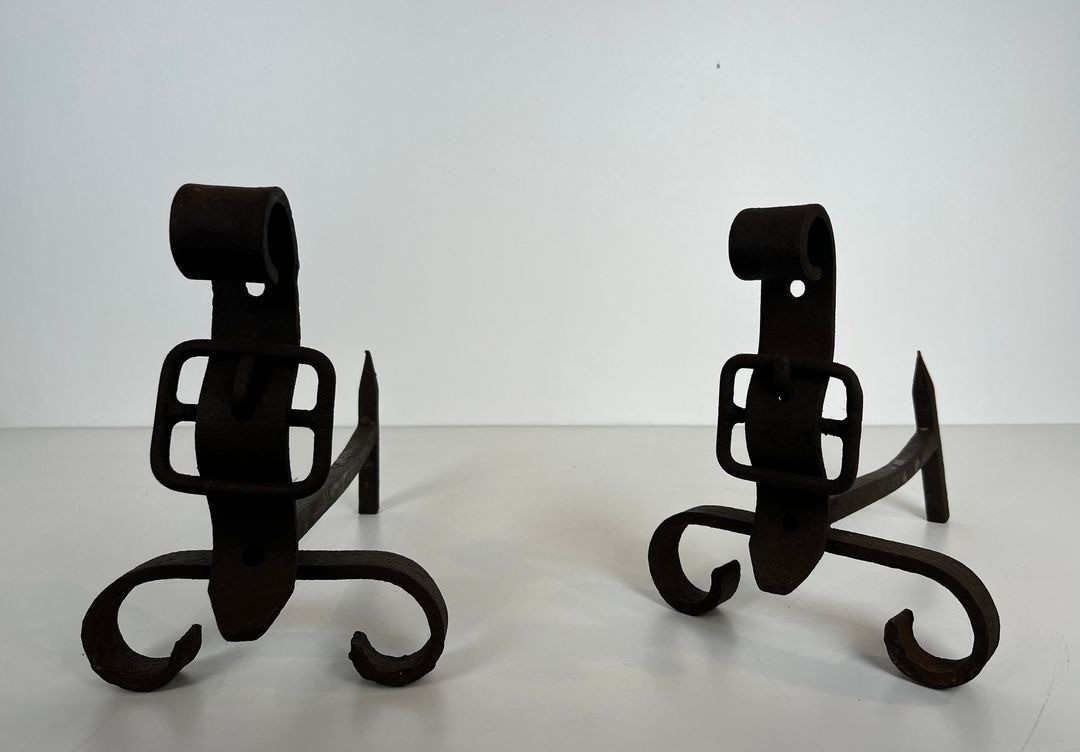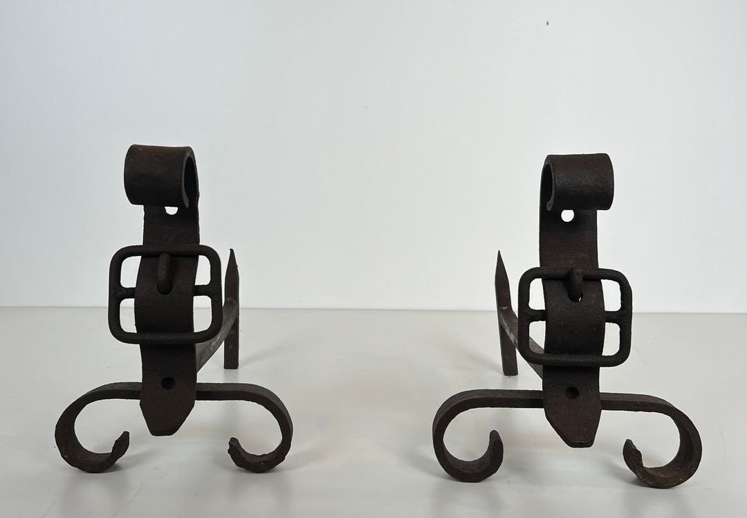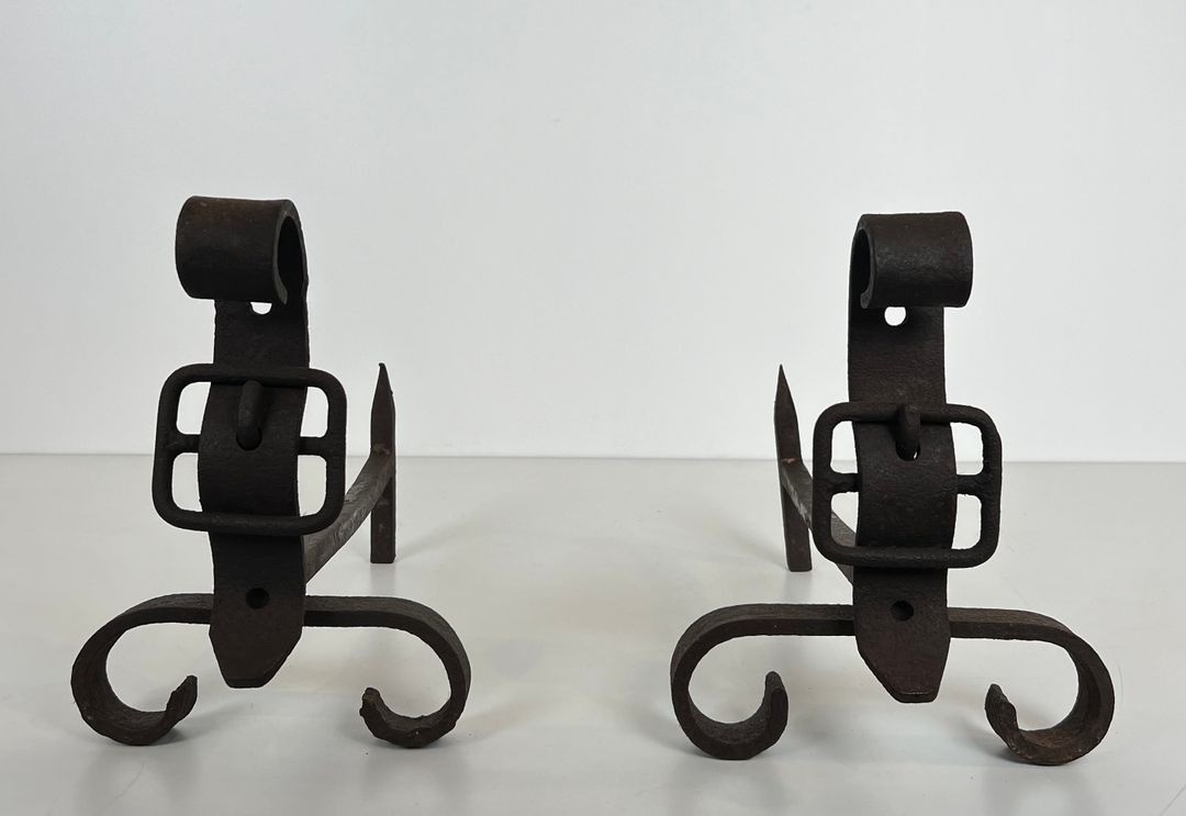 Pair of andirons of modernist design, each composed of a cast iron belt-buckle finial above a wrought iron upright with decorative scroll feet and rear log-support spurs. W. 24.5 × D. 42.5 × H. 31 cm. French work. Circa 1950.