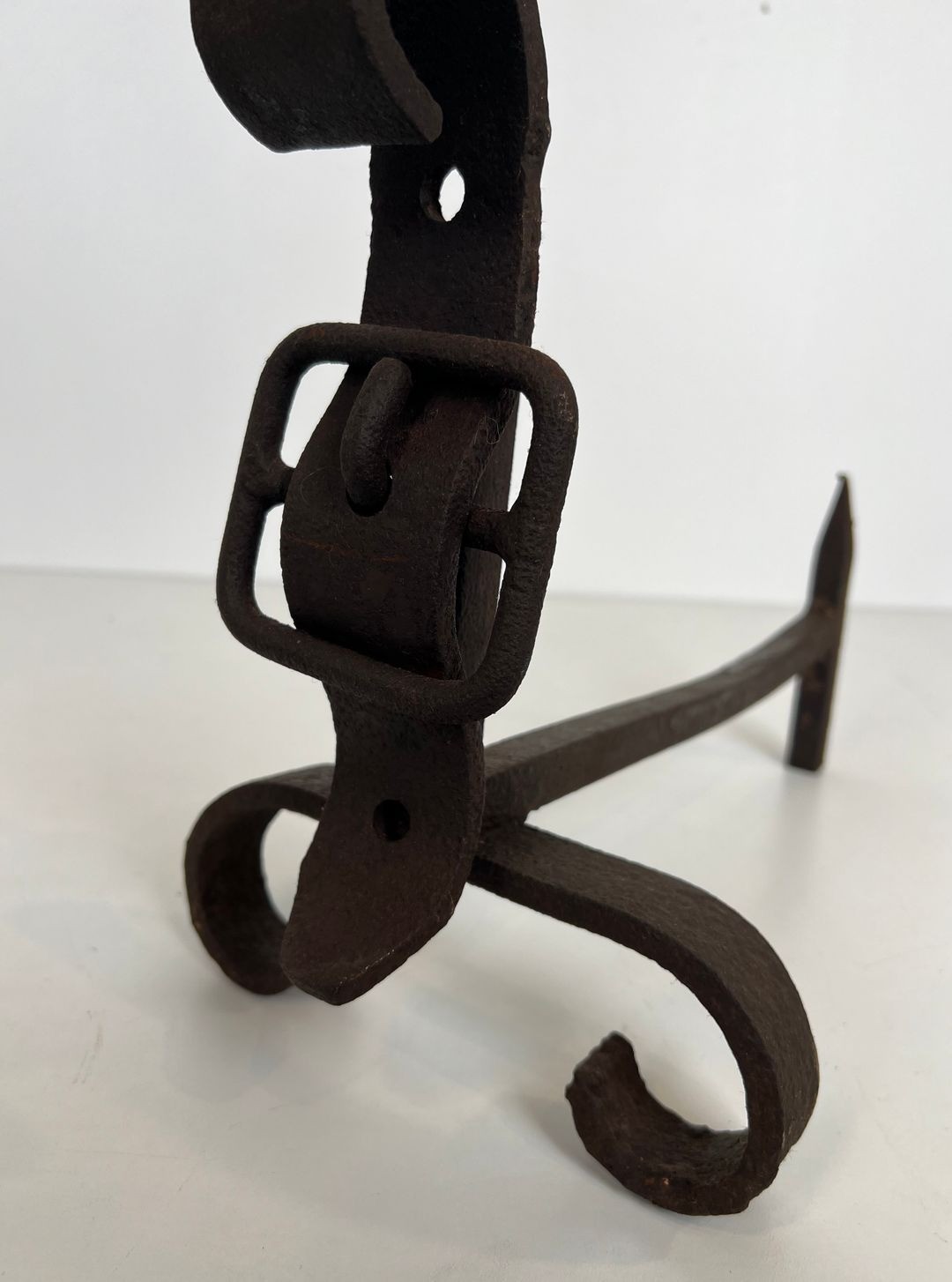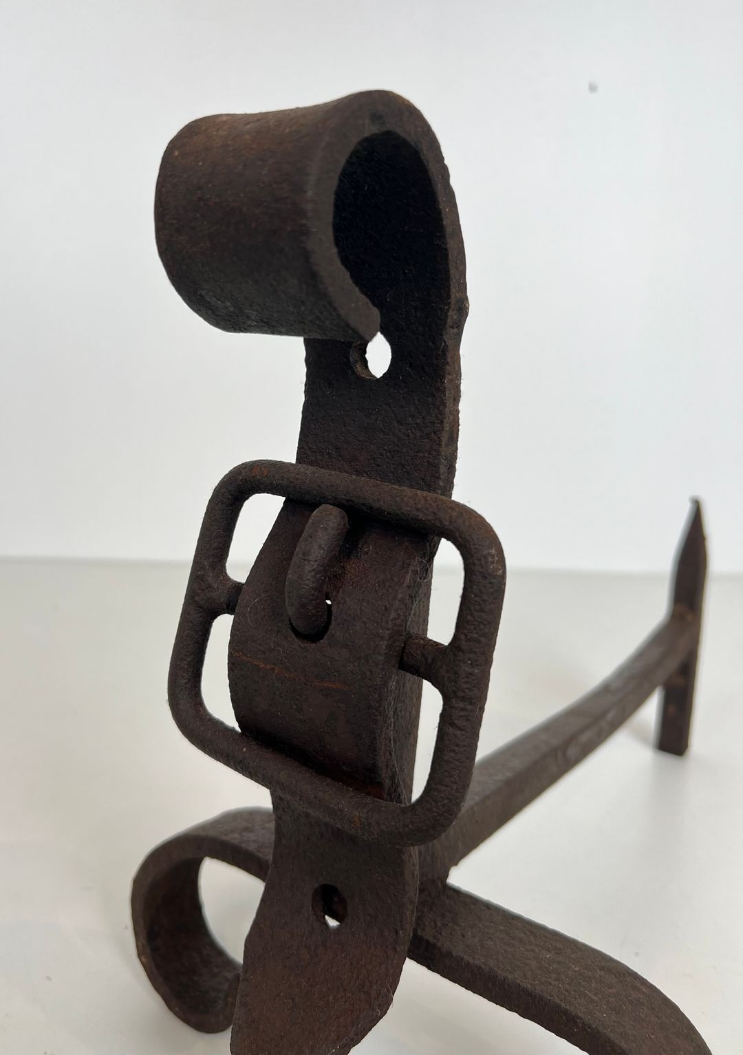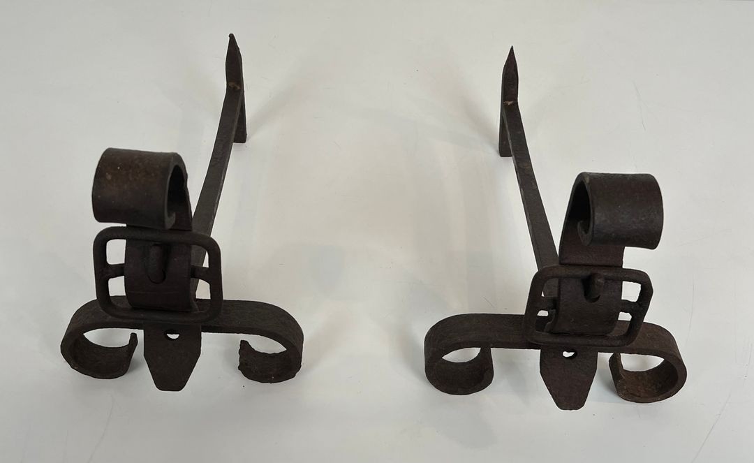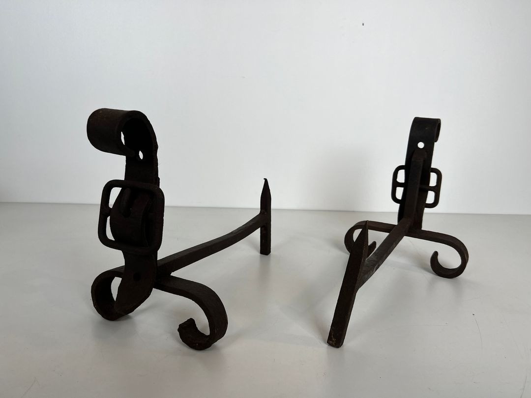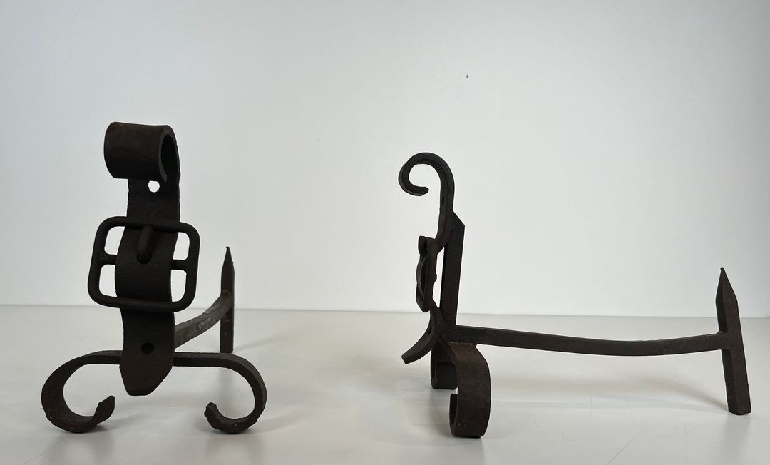 Pair of Modernist Cast Iron and Wrought Iron Belt-Buckle Andirons