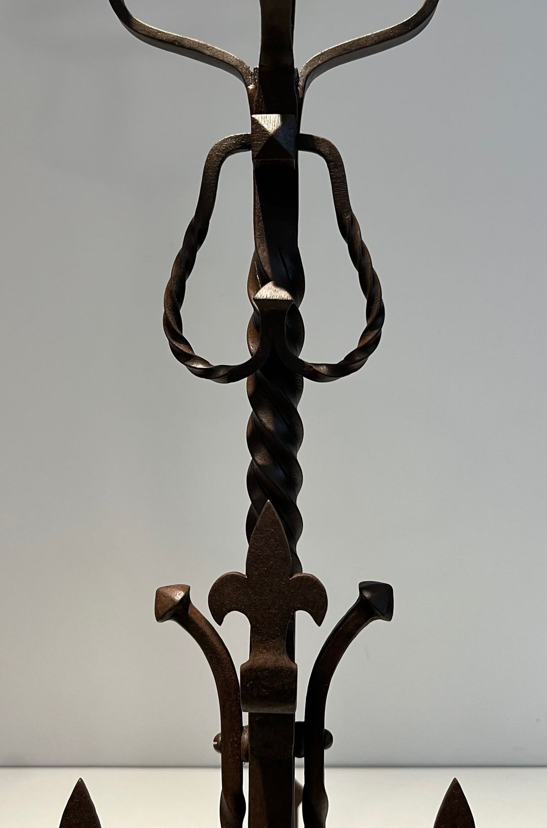 These exceptional landiers — the tall, multi-tiered andirons whose name recalls the great fireplace irons of the medieval French household — represent one of the most impressive types of decorative ironwork in the French tradition. At nearly a metre in height, this pair occupies the monumental scale appropriate to the great château fireplaces for which the Gothic Revival taste of the late 19th century provided the ideal setting.