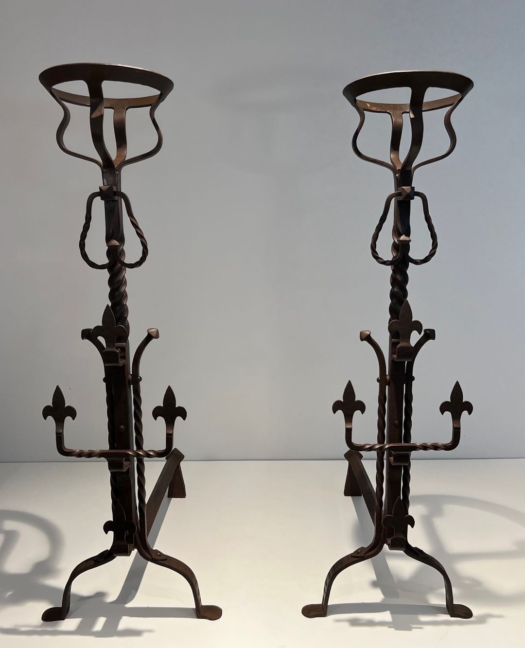 Objects of rare presence and historical resonance, these landiers would command any substantial room — whether a genuine period fireplace or a contemporary interior that draws upon the architectural vocabulary of the French Middle Ages.