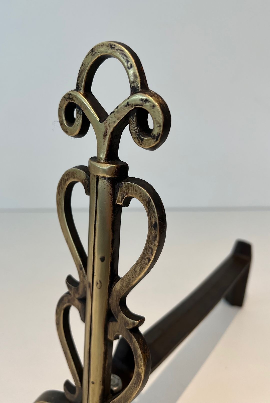 Pair of brass and wrought iron andirons in the style of Raymond Subes, each upright featuring a central lyre-form motif with flanking scrollwork and a triple-scroll finial, set on semicircular arched bases. France. Circa 1940.