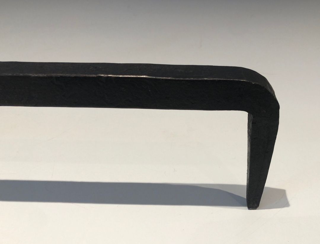 At nearly sixty centimetres in height, this pair of wrought iron andirons makes a statement of considerable authority. Each piece is built on a slender tapering shaft — almost columnar in its verticality — that rises from a base of four equally splayed feet disposed in a radial cross form, grounding the composition with a classic heraldic stability. This four-footed base is itself an architectural form of great antiquity, recalling the stands of medieval iron torchères and the decorative ironwork of Gothic ecclesiastical interiors.