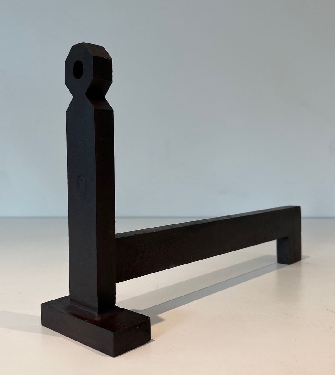 At just 24 cm in height, these are compact andirons suited to a modest or secondary fireplace, or to a setting where the piece will be appreciated as a small sculptural object on its own terms. Their scale in no way diminishes their conceptual rigour: the composition is as resolved and considered as a much larger work, and the precision of the square sections and right-angle junctions speaks to a maker with a clear vision and a disciplined hand.