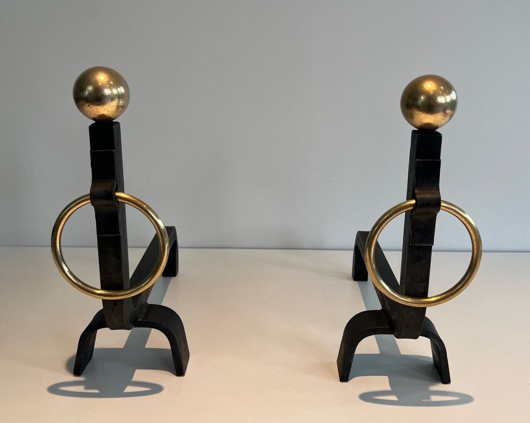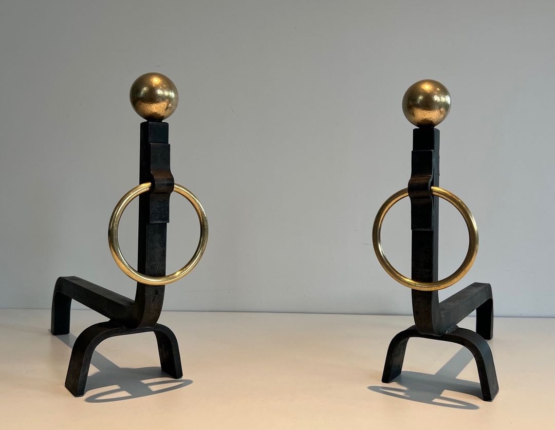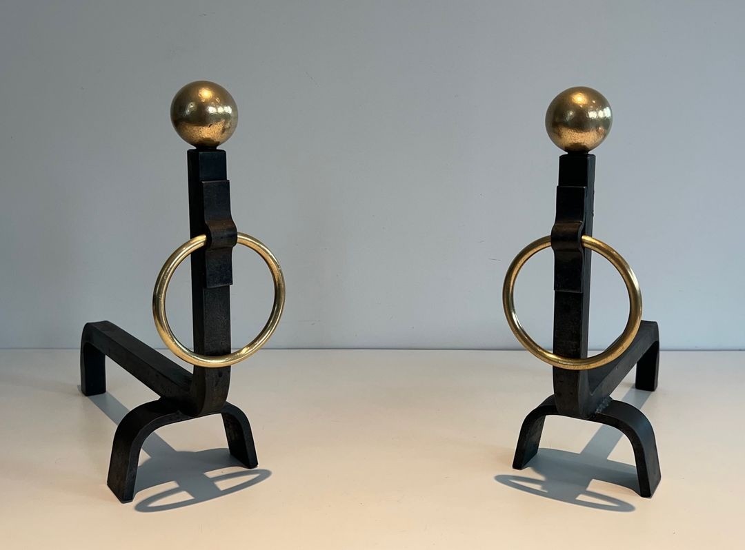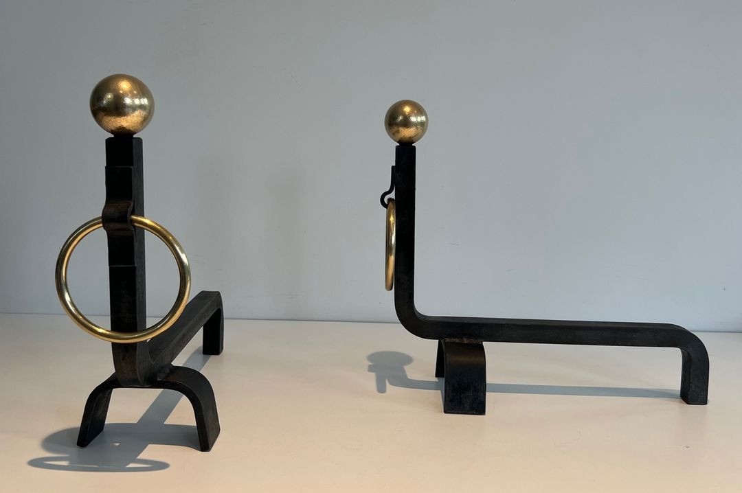 In very good overall condition, with the black iron retaining its original matte finish and the polished brass showing a warm, even patina consistent with age and careful use. A distinguished pair of andirons that will serve both as functional hearthside accessories and as works of decorative metalwork in their own right, particularly suited to an interior in the French modernist tradition.