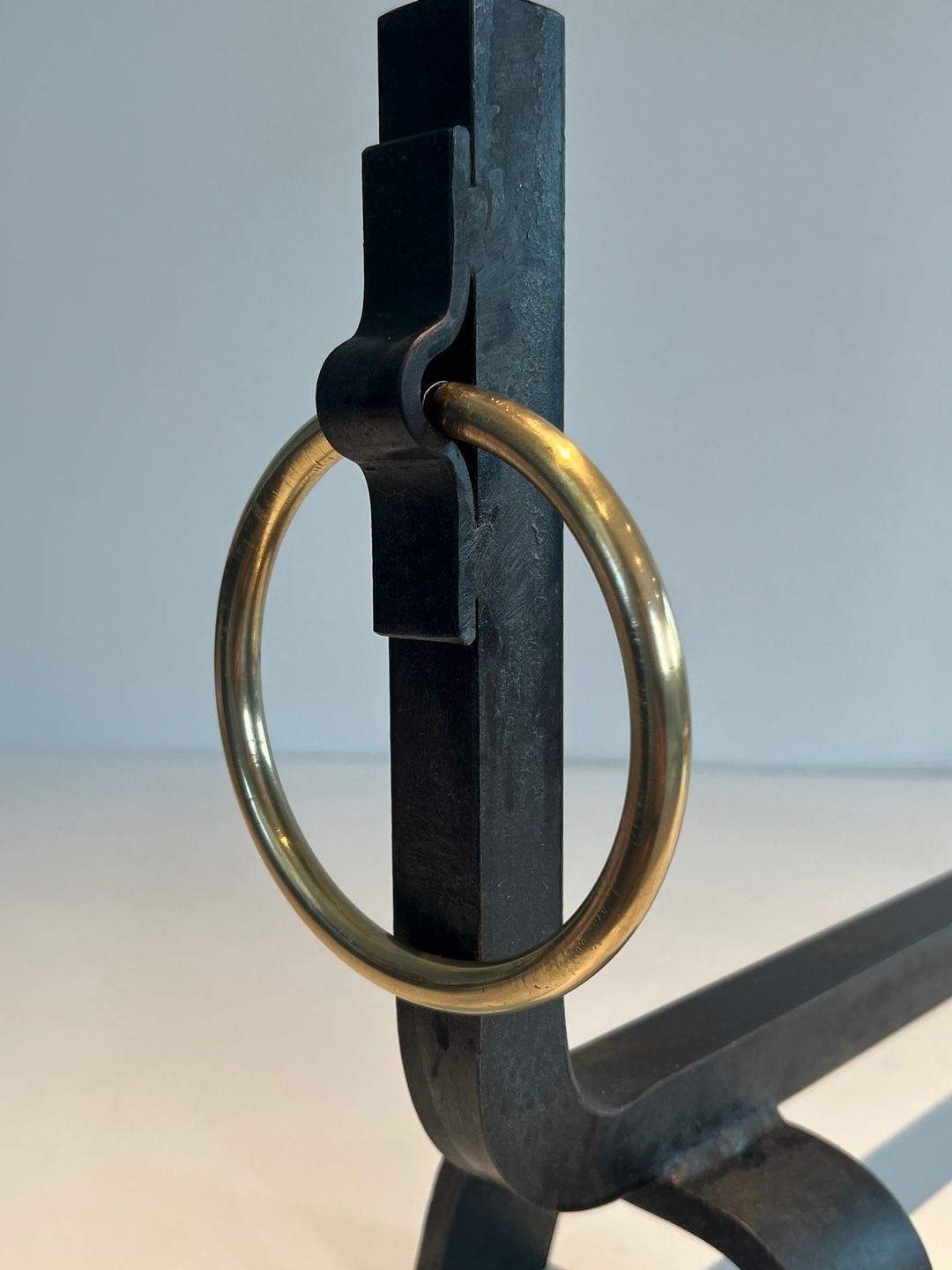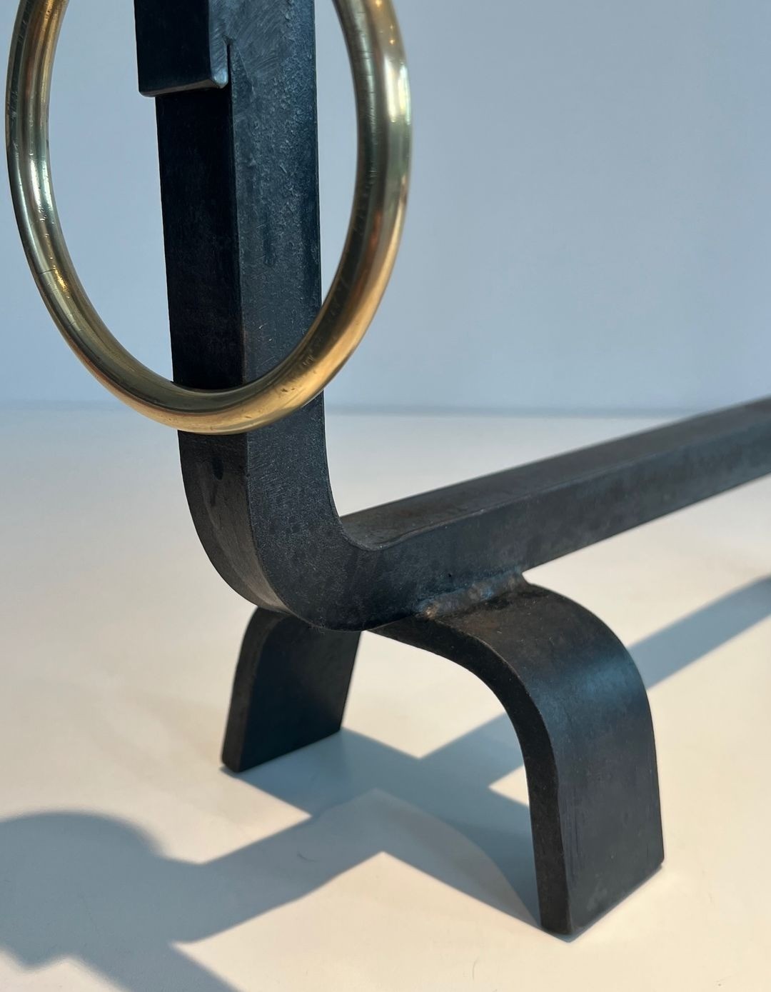 The ball-and-ring composition at the head of each upright is particularly characteristic: the ring, of burnished brass with a satisfying weight, is mounted at mid-shaft, while the ball finial above completes the vertical with a note of confident simplicity. The arched foot bases, shaped in flat wrought iron bent into a double curve, provide a stable and elegant support, their silhouette echoing the clean arcs of the Directoire and Restoration periods whilst remaining thoroughly modernist in spirit.