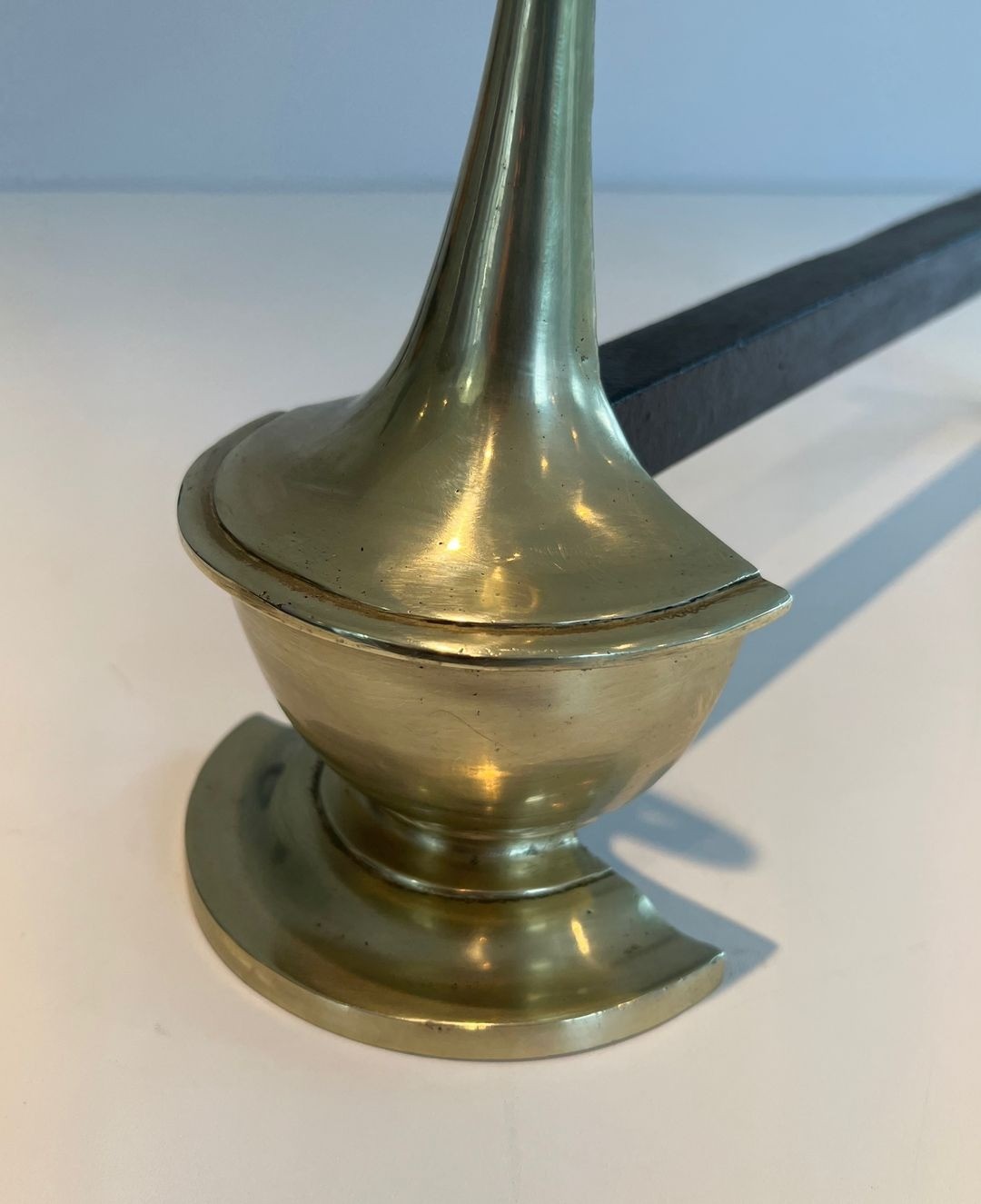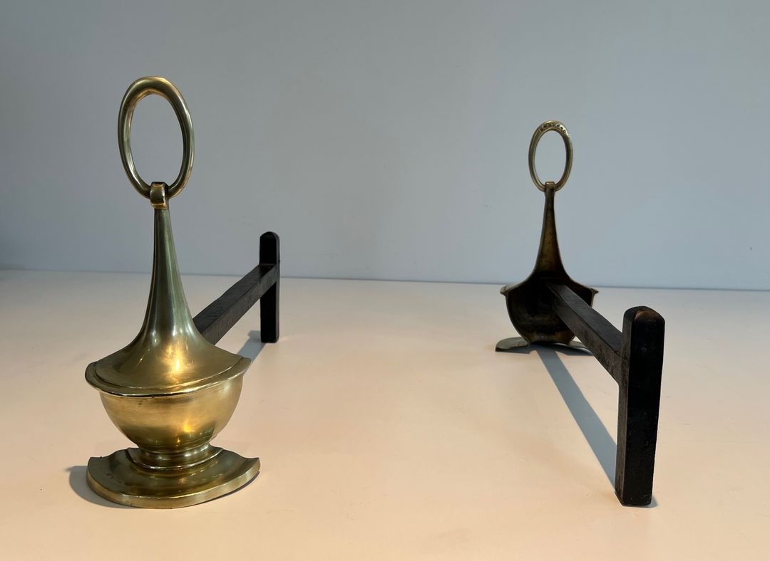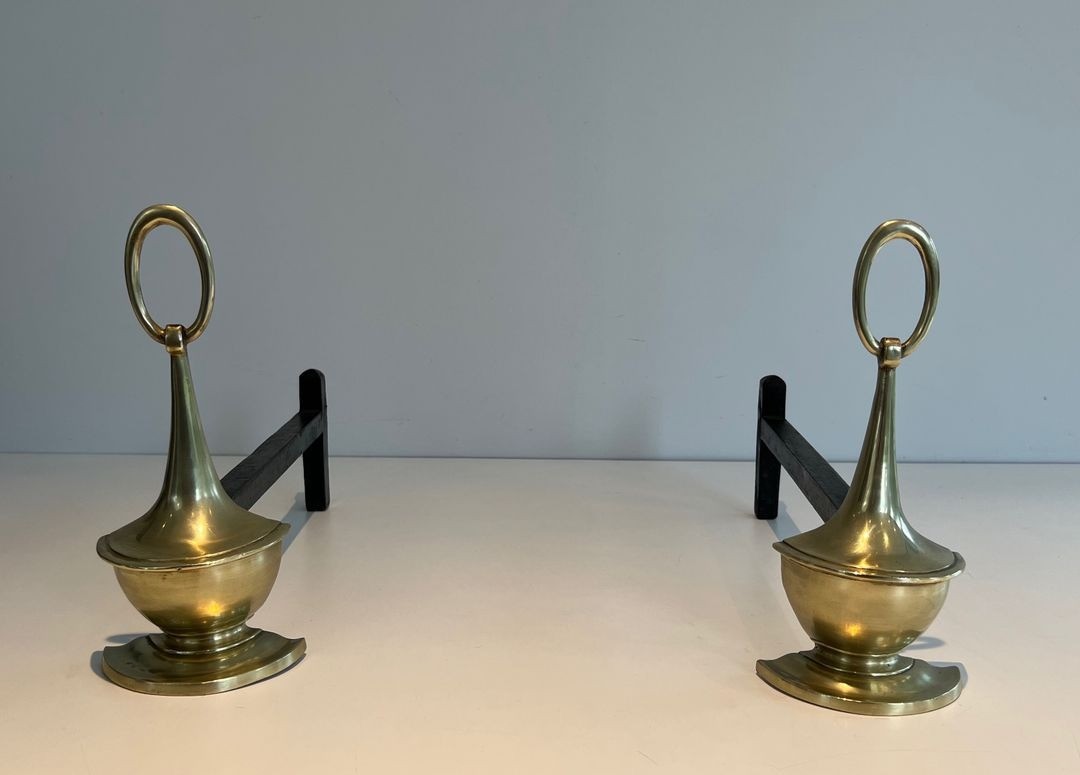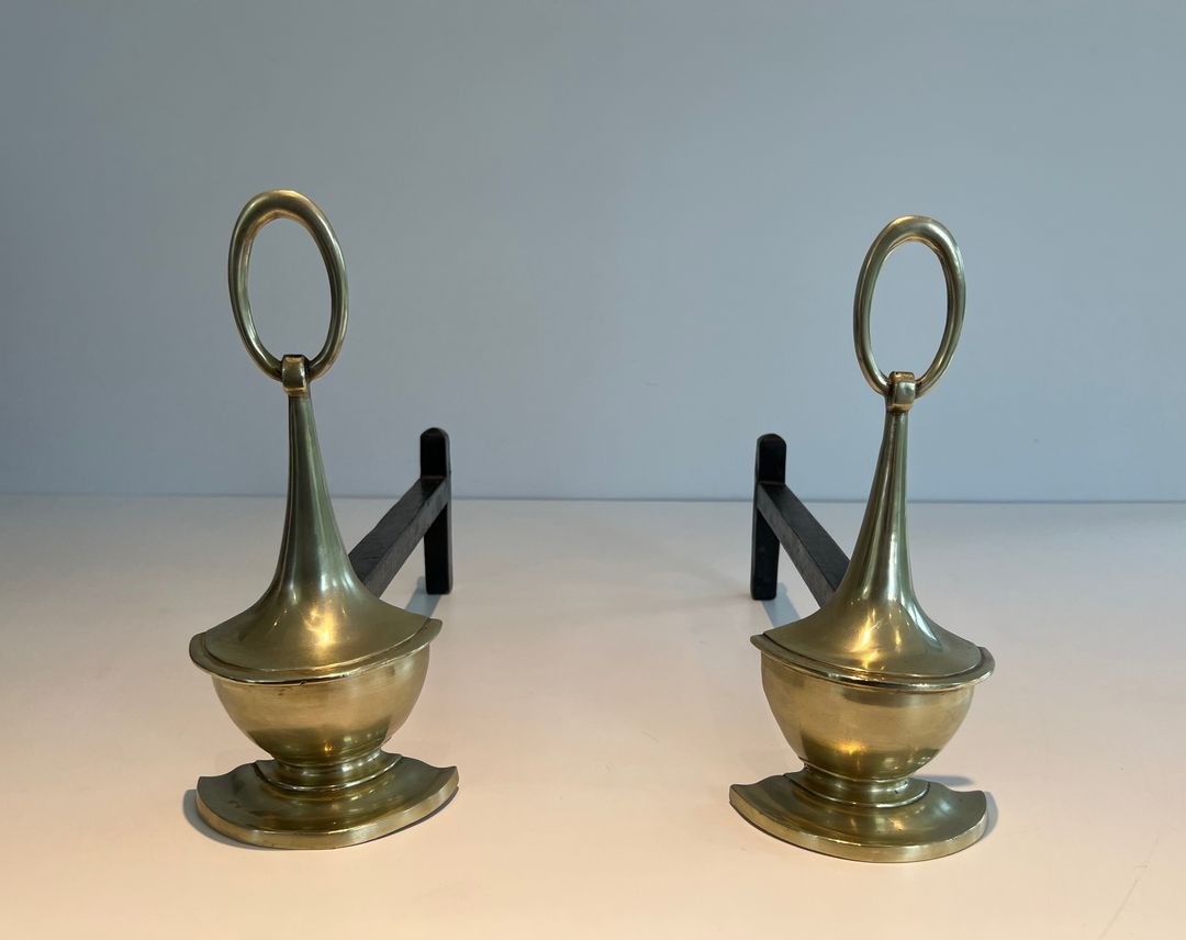 These andirons embody the enduring fascination of neoclassical decorative art with the forms of Graeco-Roman antiquity. Each is modelled as an antique oil lamp — the hemispherical body and circular foot evoking the bronze and terracotta lamps of the classical world — surmounted by a bold oval ring handle derived from the vocabulary of English Regency and French Empire metalwork, where the ring handle served as one of the defining motifs of the period. Cast and finished in polished bronze, the pieces have the warm, golden brilliance of English foundry work of the mid-twentieth century.