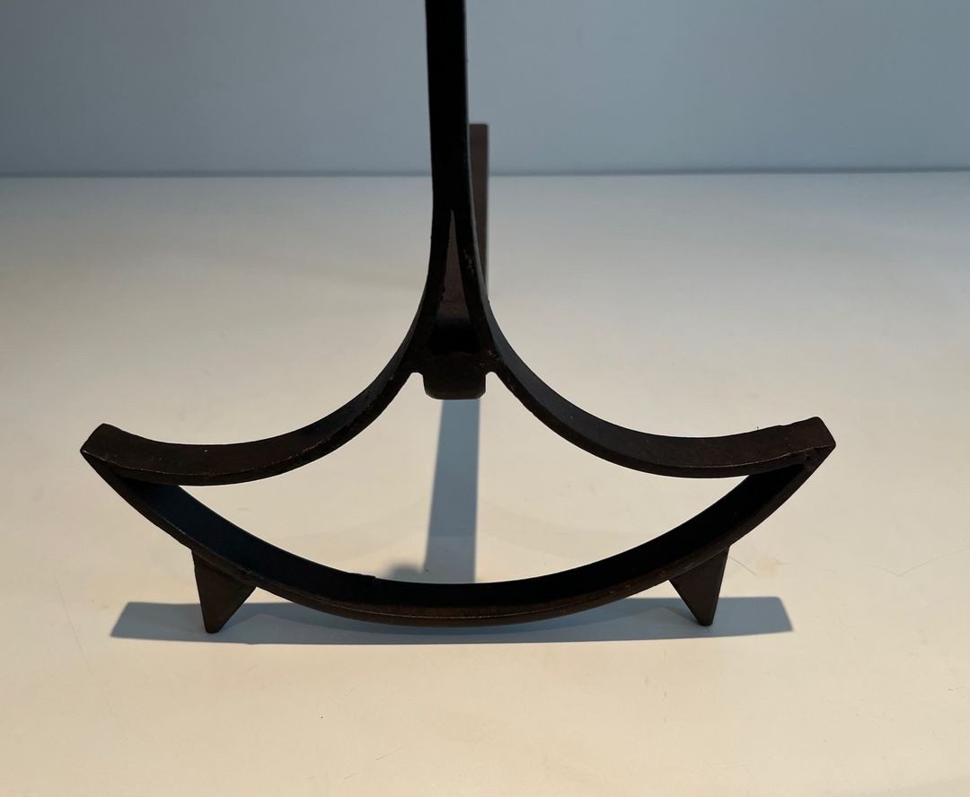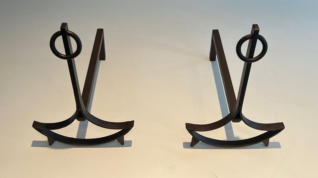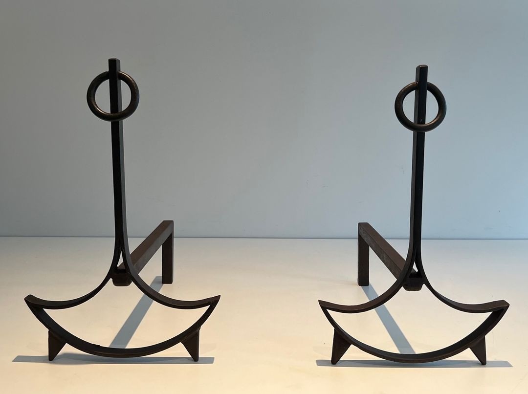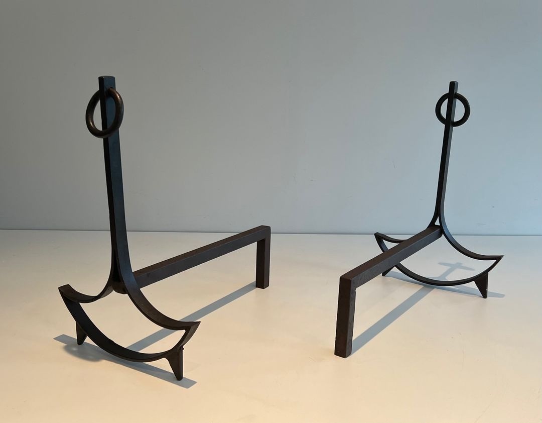 A pair of French modernist wrought iron andirons, each upright formed as a straight shaft surmounted by a small circular ring finial and rising from a boldly swept crescent-shaped base whose arching arms spread wide to either side. France. Circa 1940. W. 25.5 × D. 39.5 × H. 40.5 cm.
