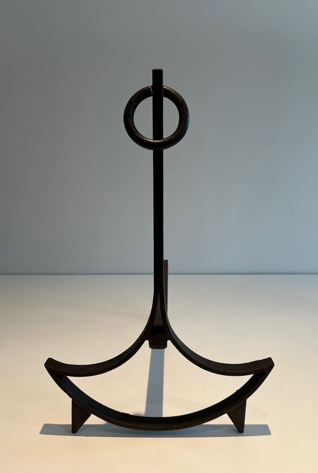 In these andirons the blacksmith’s art achieves a result of remarkable graphic clarity. Each upright rises as a clean, unadorned shaft, its summit crowned by a small but purposeful circular ring that has served as a motif of metalwork elegance since antiquity. Below, the base describes a bold sweeping arc — a wide crescent whose curved arms spread generously to either side before curling gently downward at their ends — lending the composition an anchor-like authority and a strong sense of grounded weight belied by the slenderness of the shaft above.