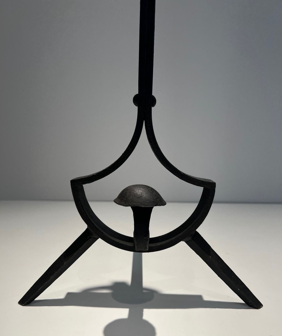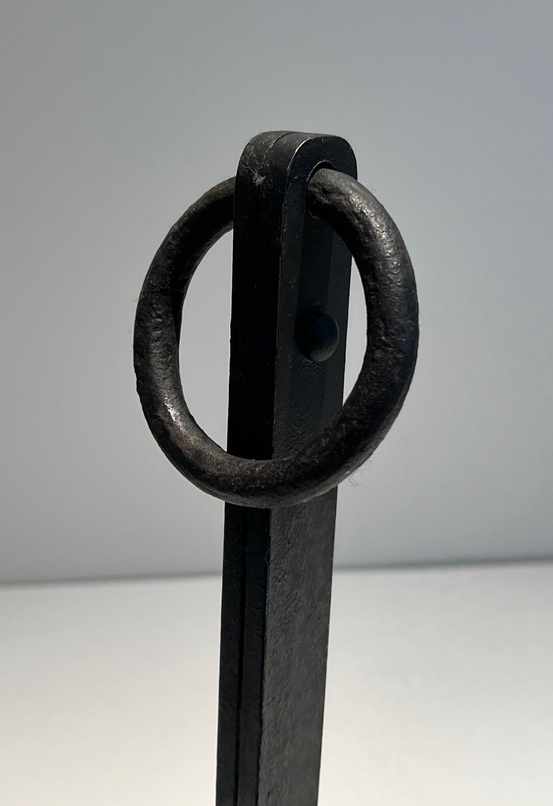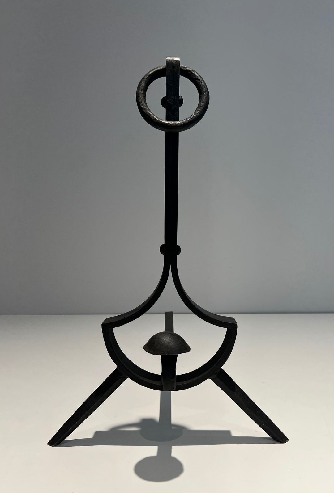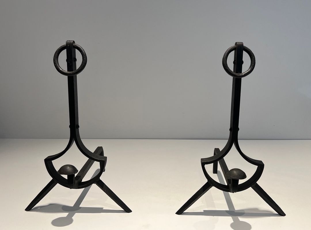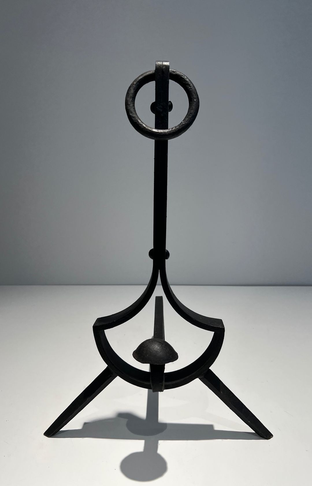 A pair of French modernist wrought iron andirons, each comprising a straight vertical shaft surmounted by a circular ring finial and raised on a dynamic splayed tripod base. France. Circa 1940. W. 31.5 × D. 41 × H. 49 cm.