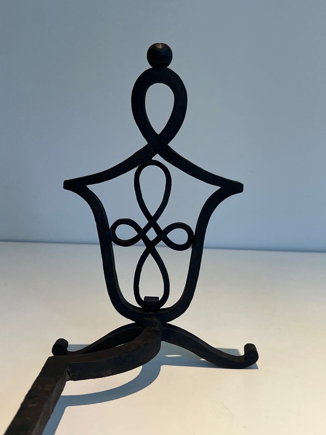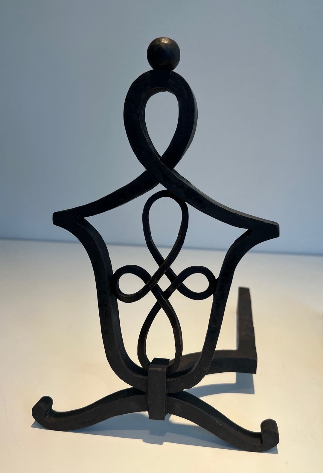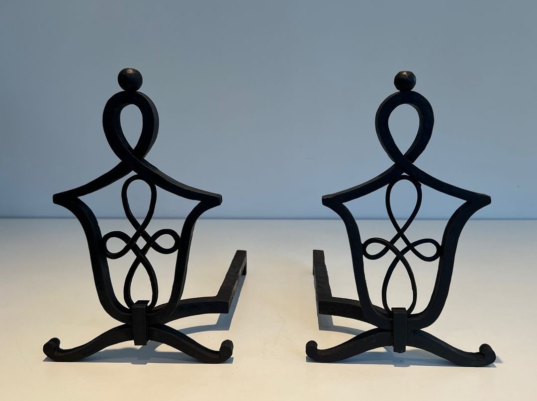 Pair of wrought iron andirons in the manner of Raymond Subes, each upright formed by intricate interlaced oval loops arranged in a symmetrical latticework composition, surmounted by a small ball finial, on splayed scrolled feet with angled log dogs. France. Circa 1940. W 7.09 × D 12.44 × H 11.02 in — W 18 × D 31.6 × H 28 cm.