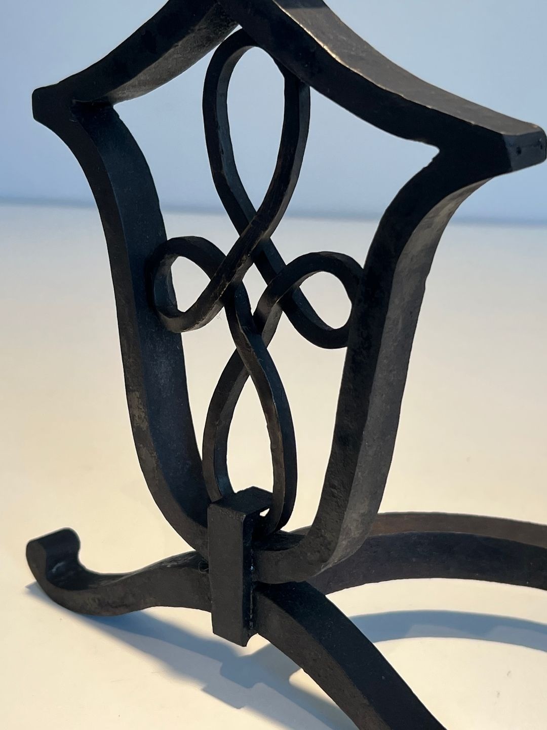 The pair is in good condition, the original forged iron surface retaining a rich dark patina consistent with age and fireside use. The interlaced elements are intact with no breaks or deformations. The scrolled base feet are sound and the overall structural integrity is fully preserved. The pieces present well as a closely matched pair.