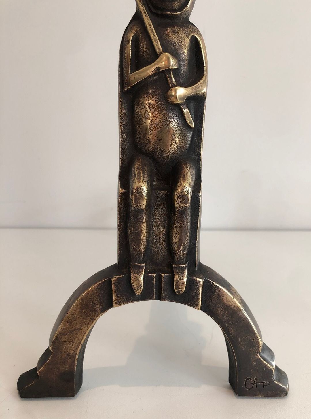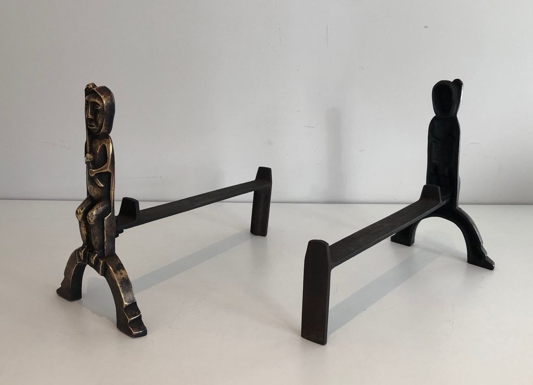 Anton Prinner (Budapest, 1902 – Paris, 1983), born Anton Pinner, arrived in Paris in the 1920s and established himself as a distinctive figure within the School of Paris. Drawn to archaic and non-Western sculptural traditions, he developed a personal idiom of bold, compact figuration with strong overtones of shamanism, animism, and mythic narrative. His monogram — found on these andirons — is attested on a range of his sculptural and decorative works from the 1930s onwards. The present pair represents an unusual and compelling intersection of his sculptural practice with the applied arts.