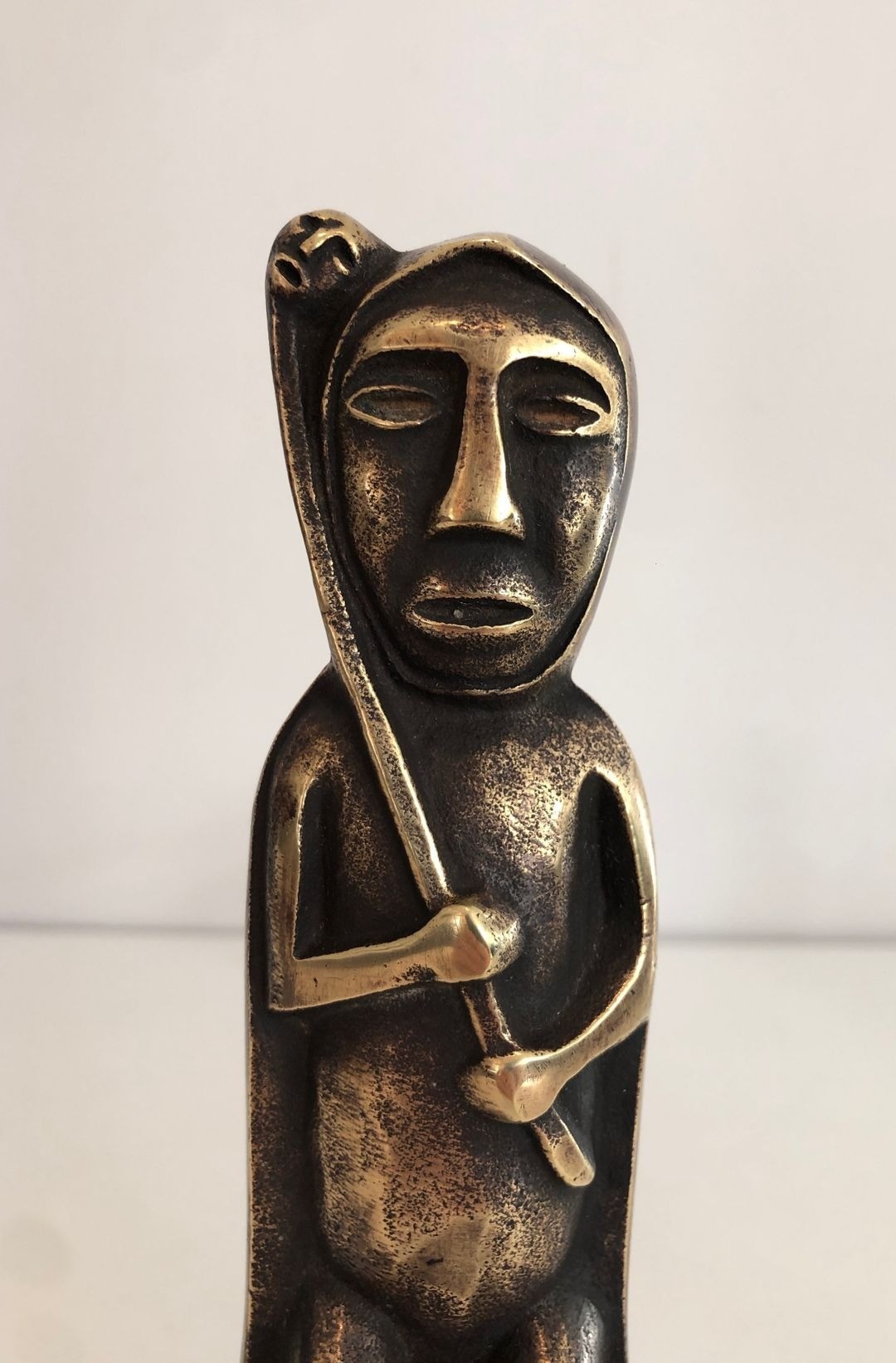 Exceptional pair of patinated bronze andirons, each upright modelled as a seated shaman figure in bold primitivist style, raised on wide arched legs with iron log bars, monogrammed by the sculptor Anton Prinner. France. Circa 1930. W 6.3 × H 13.58 in — W 16 × H 34.5 cm.
