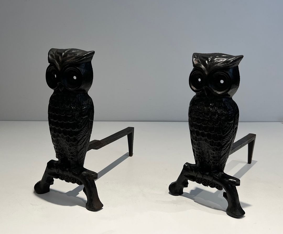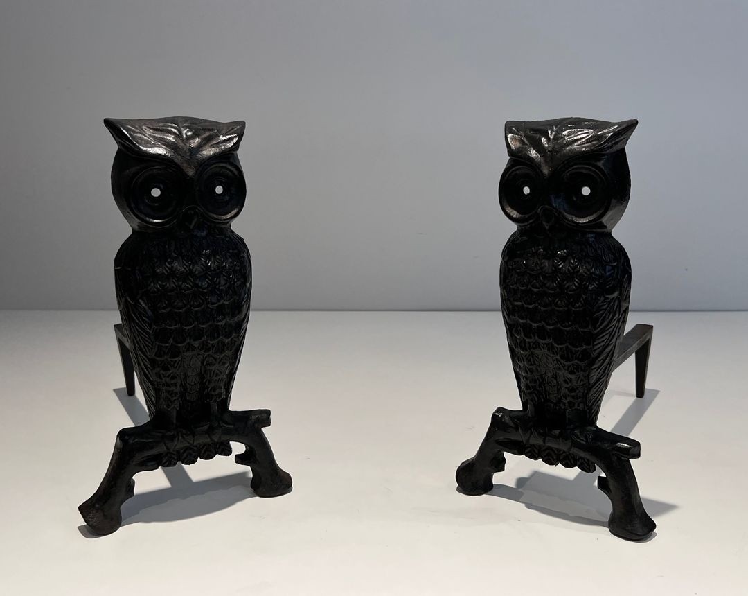 The owl, symbol of wisdom and attribute of Minerva in the classical tradition, has long been a favoured subject for decorative metalwork in France. Figural andirons representing birds, animals, and mythological characters were produced by French foundries from the Renaissance through the nineteenth and twentieth centuries, the owl form enjoying particular popularity among collectors and interior decorators seeking to combine warmth and wit at the fireside. This pair, datable to circa 1970, belongs to a distinguished lineage of French decorative cast-iron work.
