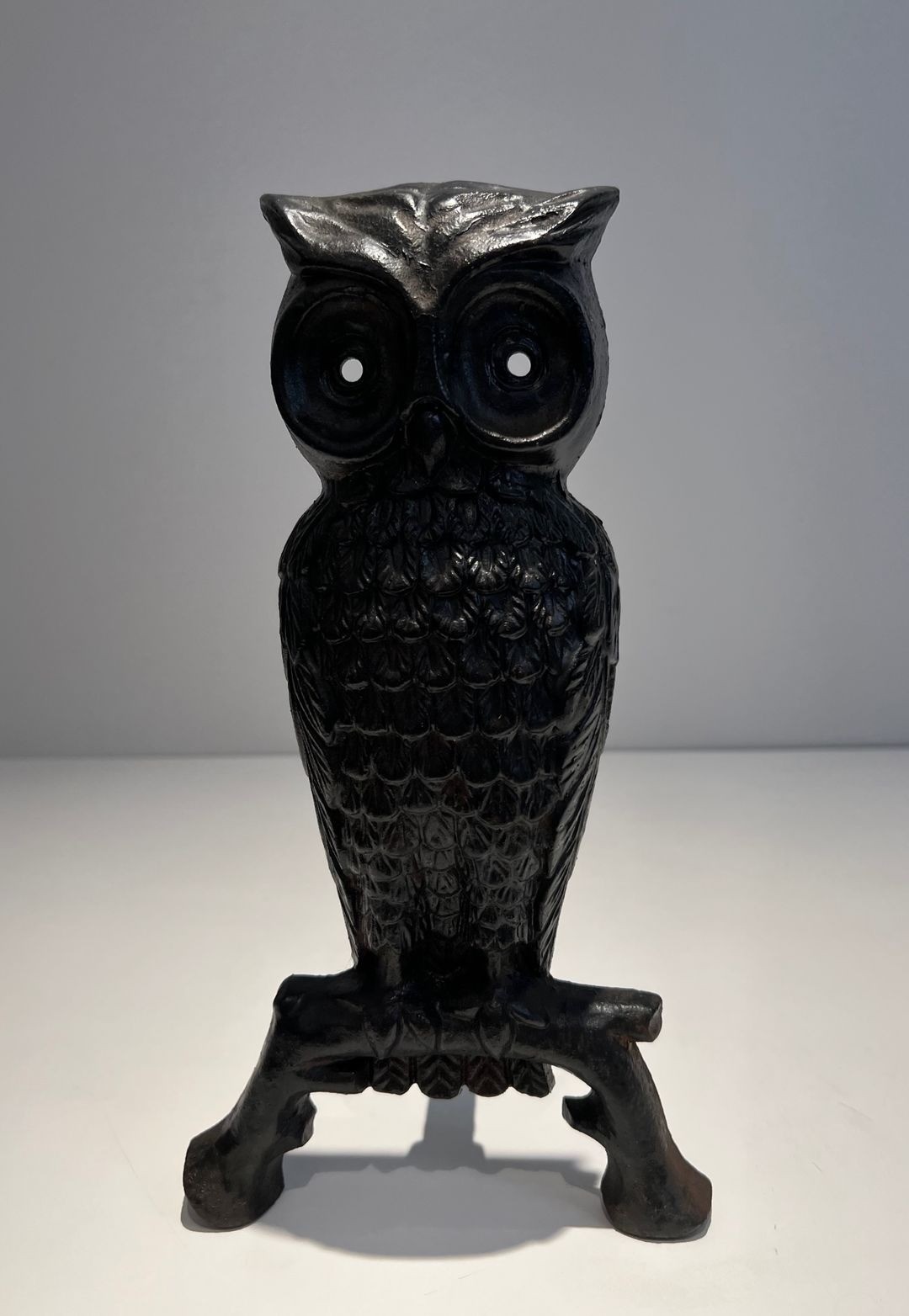 Cast in iron and finished in a uniform matte black, the andirons achieve a rich, dense surface quality that enhances the sculptural modelling of the owl forms. The feather texturing is crisp and well-defined, suggesting production from well-maintained moulds, while the overall casting quality is consistent and solid throughout. The wrought iron log bars are cleanly forged and firmly attached, their proportions well-matched to the decorative cast figures above.