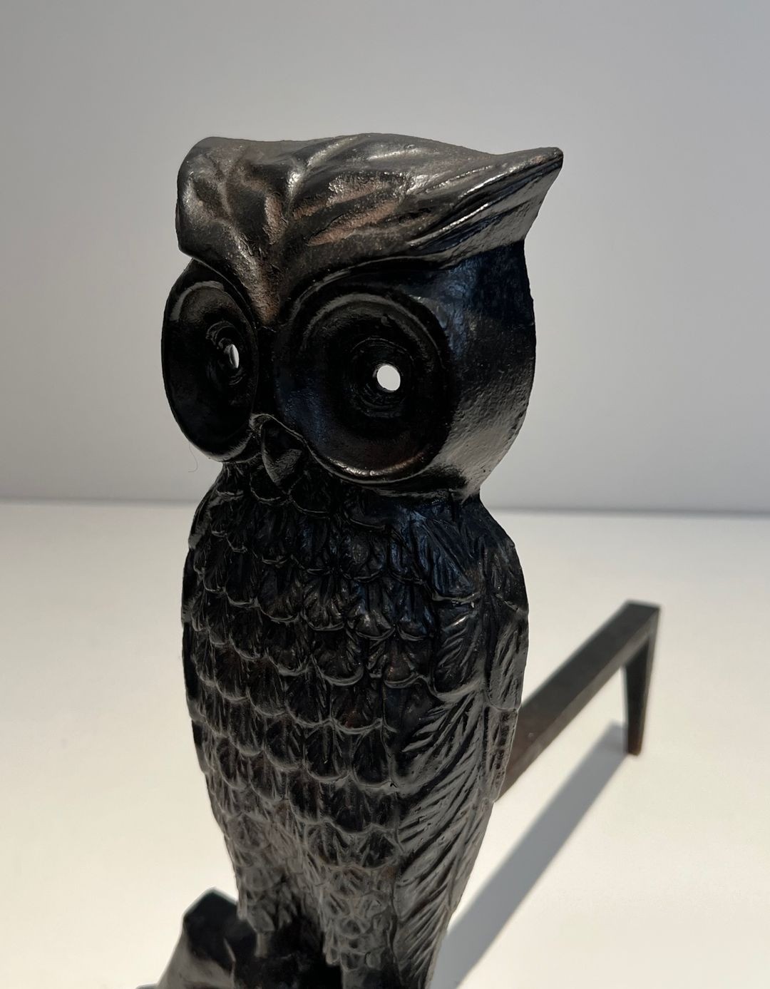 Charming pair of blackened cast iron andirons, each upright modelled as a naturalistically rendered standing owl with detailed feathering, large round eyes and ear tufts, raised on four scrolled feet with horizontal log dogs. France. Circa 1970. W 7.09 × D 13.98 × H 13.19 in — W 18 × D 35.5 × H 33.5 cm.