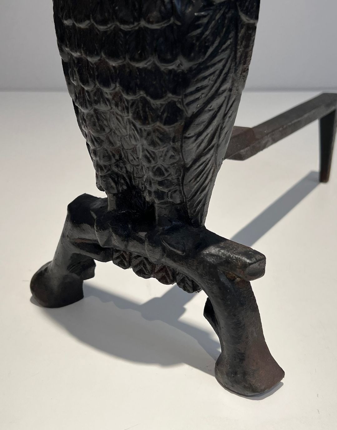 These delightful andirons take the form of a pair of standing owls, each bird modelled with considerable fidelity to nature in blackened cast iron. The bodies display close-packed feather texturing, the round heads are set with large staring eyes, and prominent ear tufts crown the figures with an expression of alert dignity. The owls stand on four-footed bases with gently scrolled feet, from which flat horizontal log dogs extend to cradle firewood with practical efficiency. The combination of naturalistic figuration with functional fireplace utility is characteristic of French decorative foundry work at its most inventive.