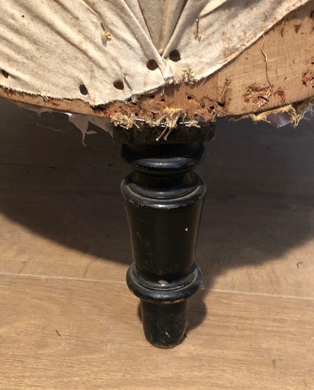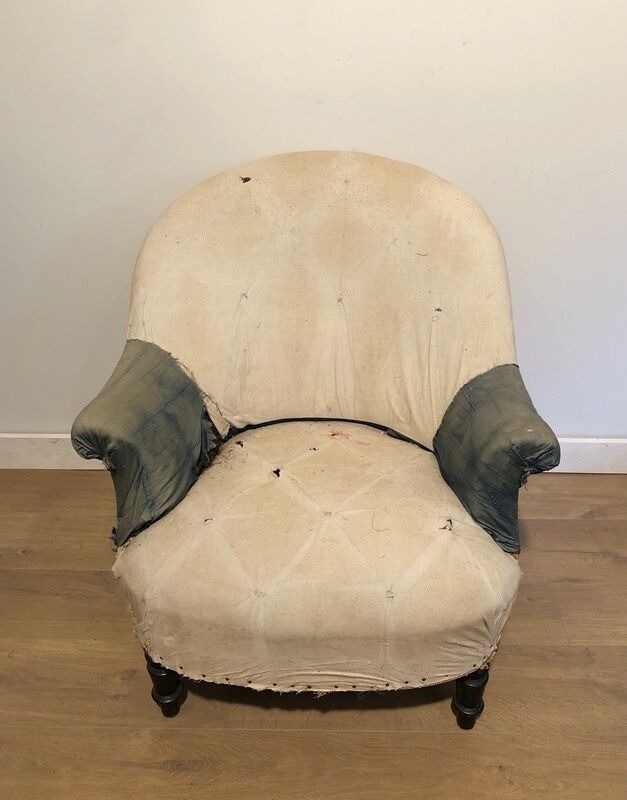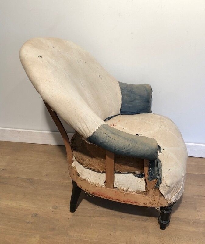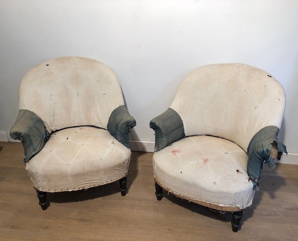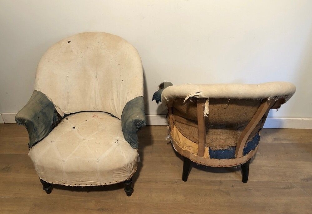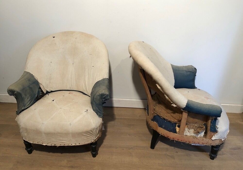 These two Napoleon III armchairs display the characteristic opulence of the Second Empire aesthetic, with their elegantly curved cabriole legs, carved wooden frames and generous proportions. Their upholstery is in need of full restoration, presenting an ideal opportunity for a bespoke fabric selection that would honor the period's spirit — brocade, damask, or cut velvet would all be historically appropriate. The structural integrity of the woodwork remains sound, making these pieces excellent candidates for a full revival.