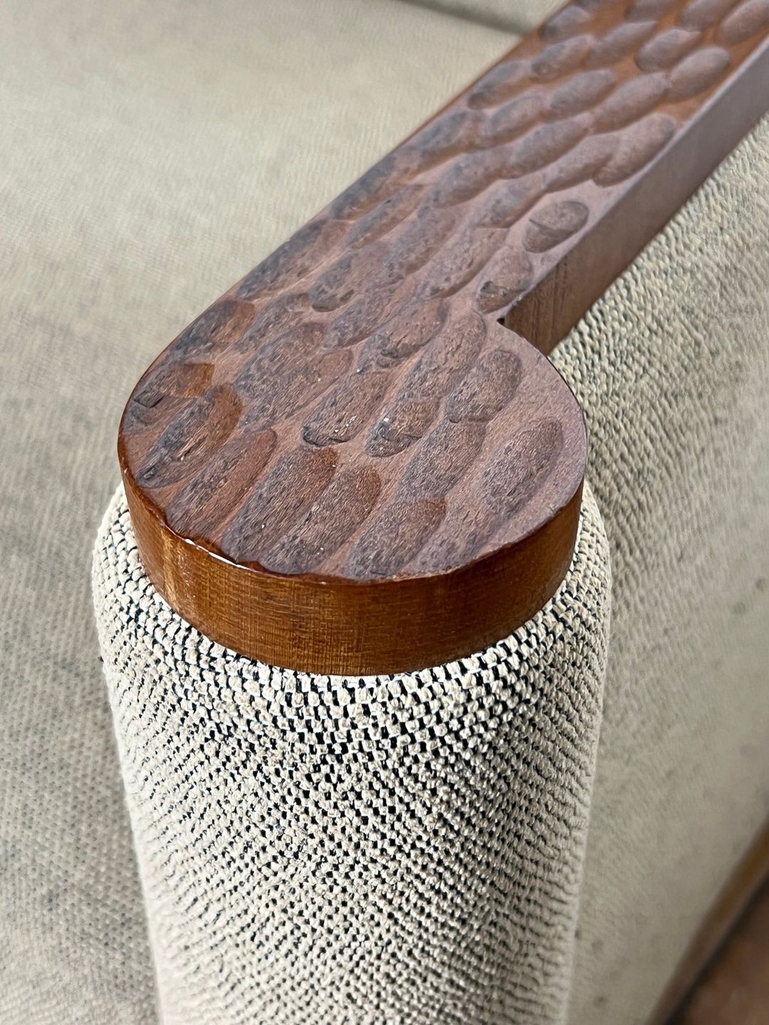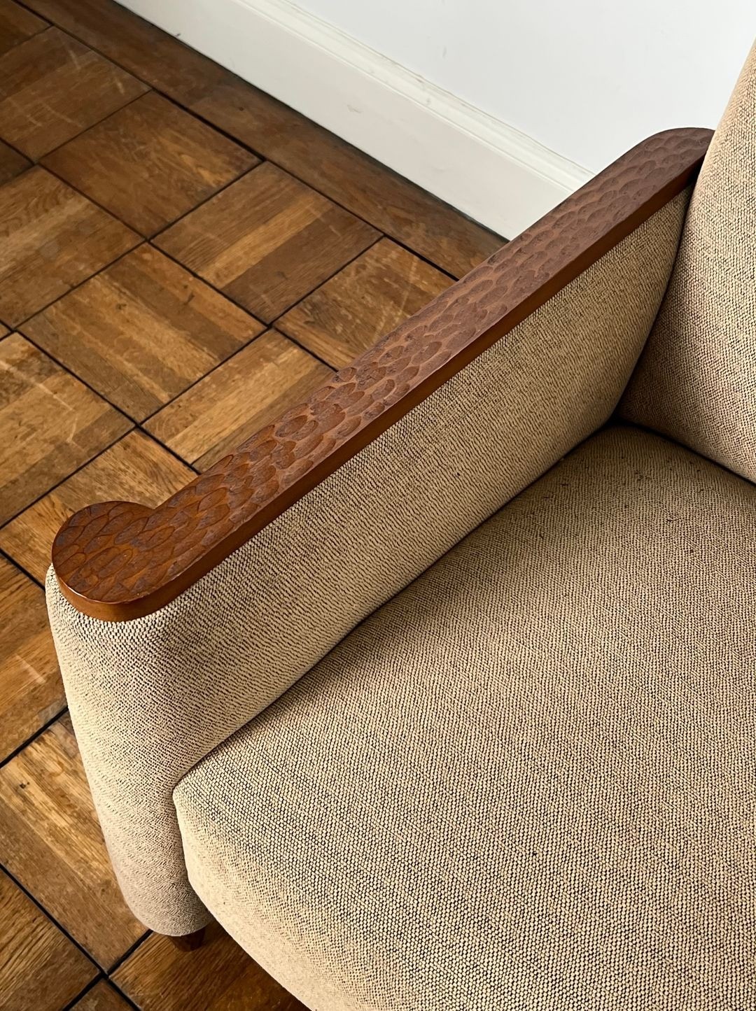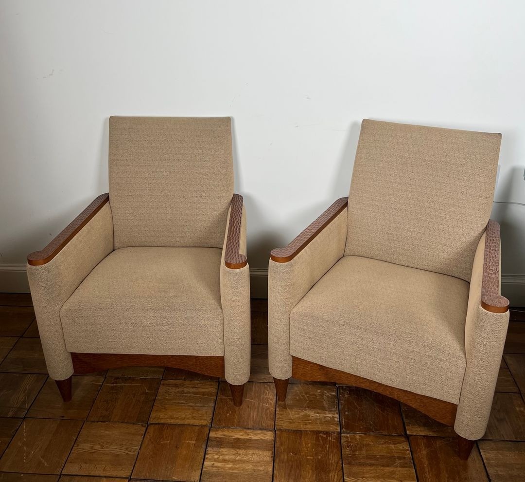 The pair amplifies this energy: two chairs worked by the same hand, bearing the same gouged grammar, create a coherent domestic environment in which material honesty and formal rigour operate together. The chiné fabric introduces a warm tonal register into the composition, its irregular distribution of tones echoing the irregular rhythm of the carved wood. Whether placed in a study, a salon, or a reception room, these armchairs assert themselves as objects with a point of view—furniture that makes a statement about the value of the handmade and the beauty of the imperfect.