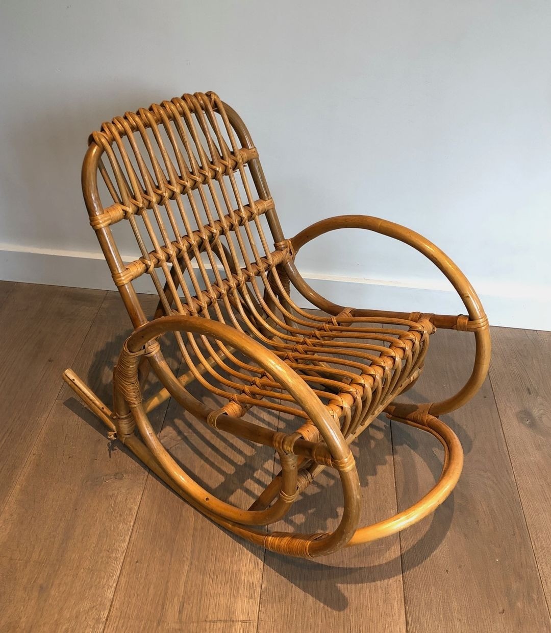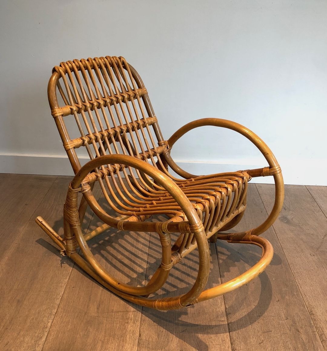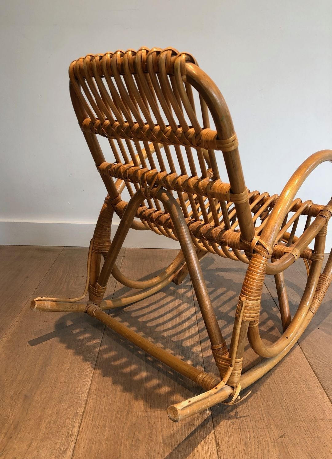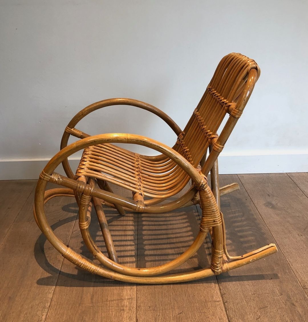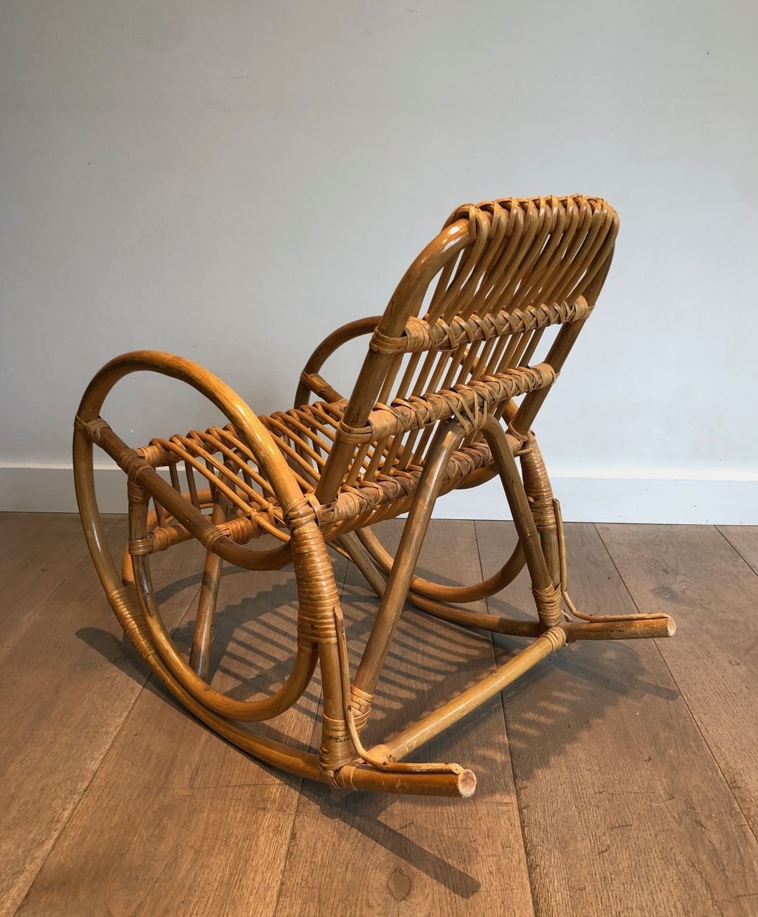 French rattan craft of the 1970s occupied a specific cultural moment. The decade was one of return — to natural materials, to craft, to objects that showed their making — in conscious reaction against the anonymous industrialism of postwar modernism. Rattan, which had been embraced in the 1950s as a modernist material and then somewhat eclipsed by plastics in the 1960s, returned with a warmer valence: natural, renewable, visibly hand-worked. A children’s rocking chair in this context was not merely furniture but a small manifesto of tactile, organic domesticity — an object that placed childhood at the centre of the home’s material culture.