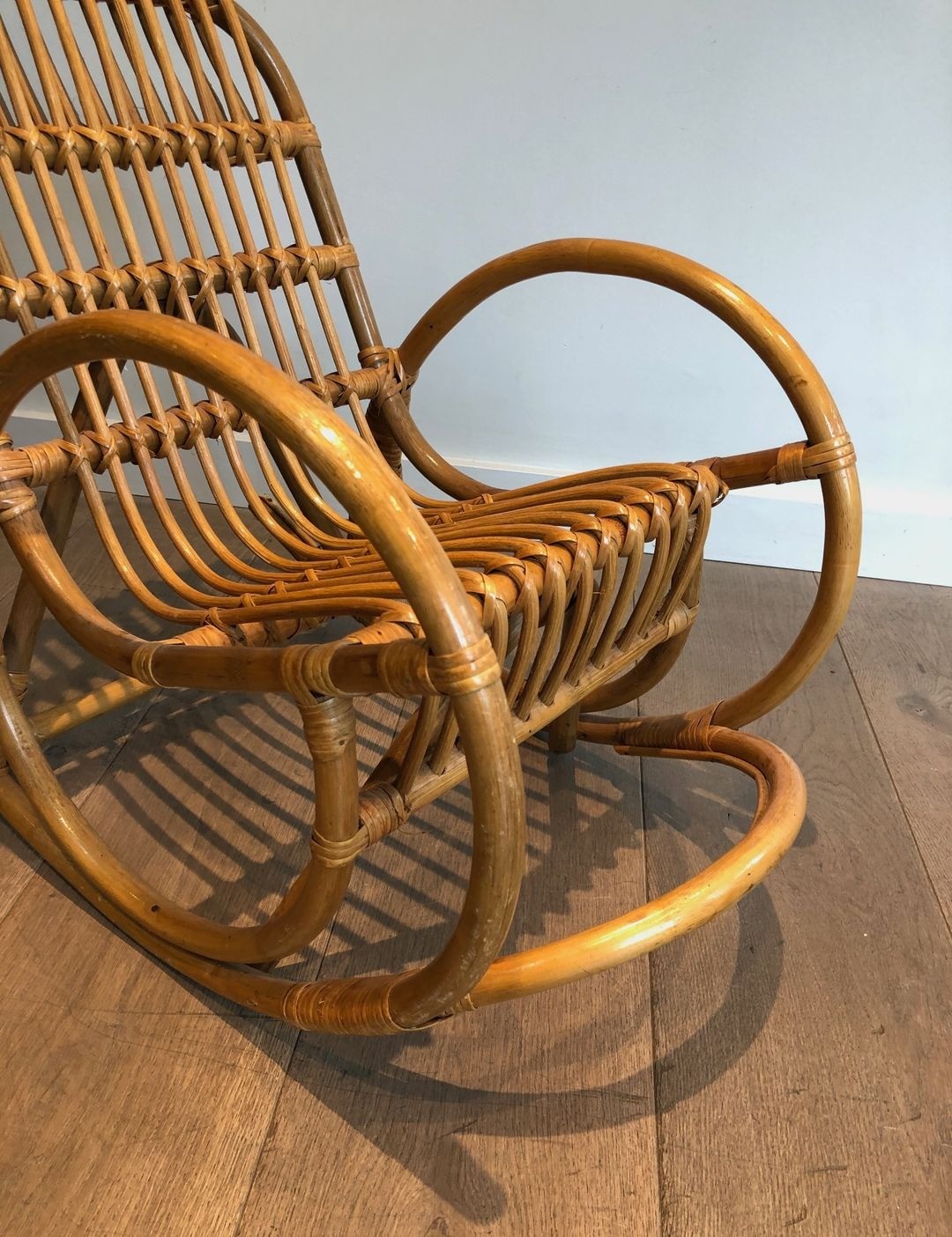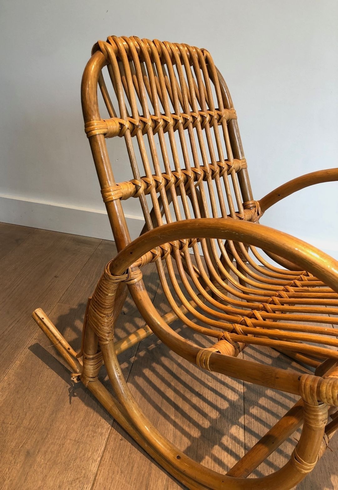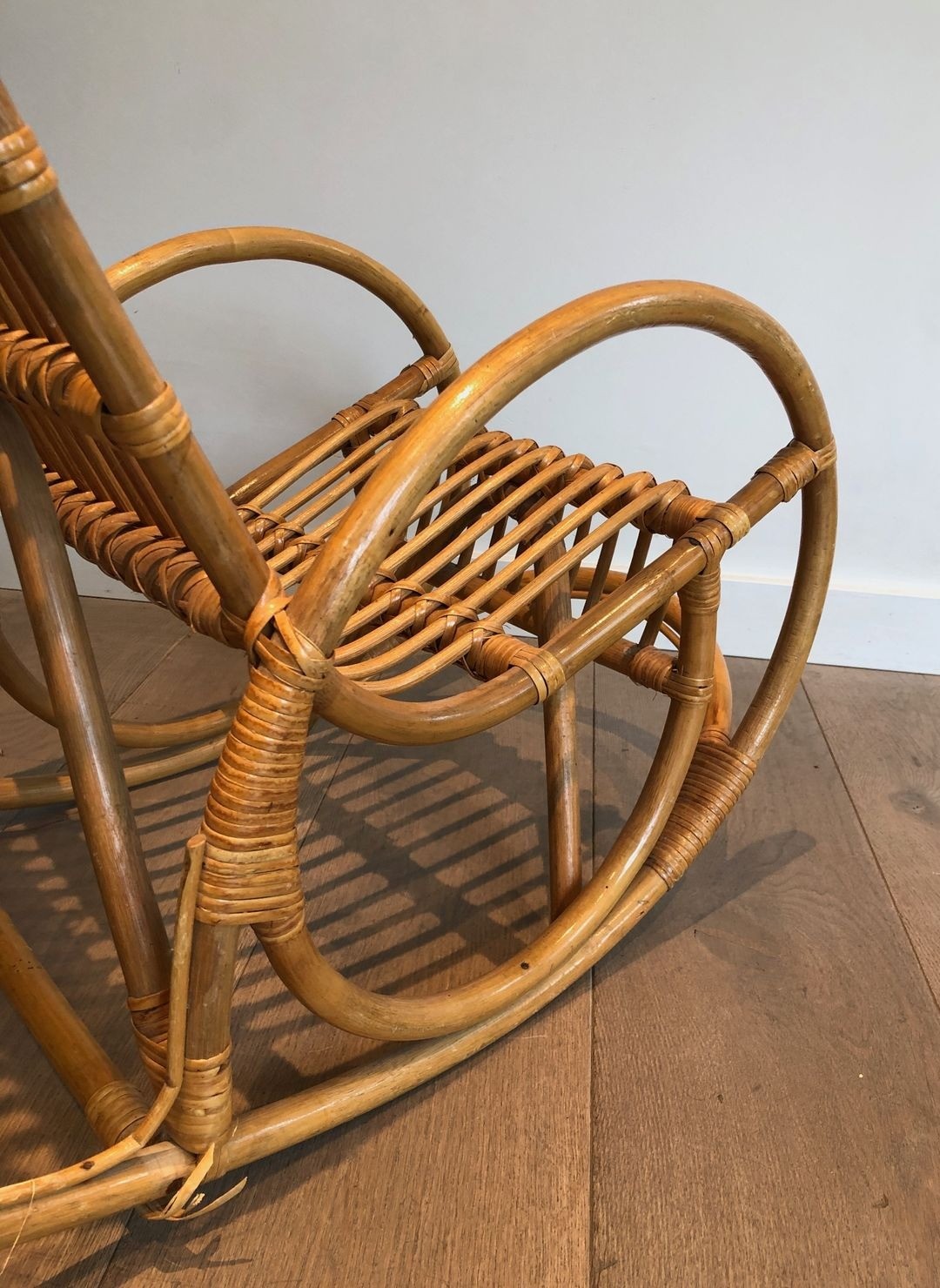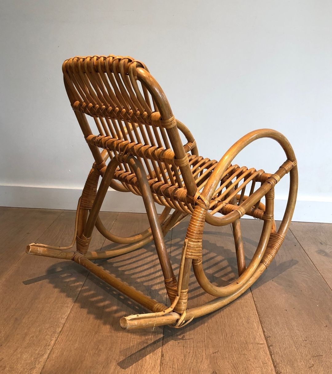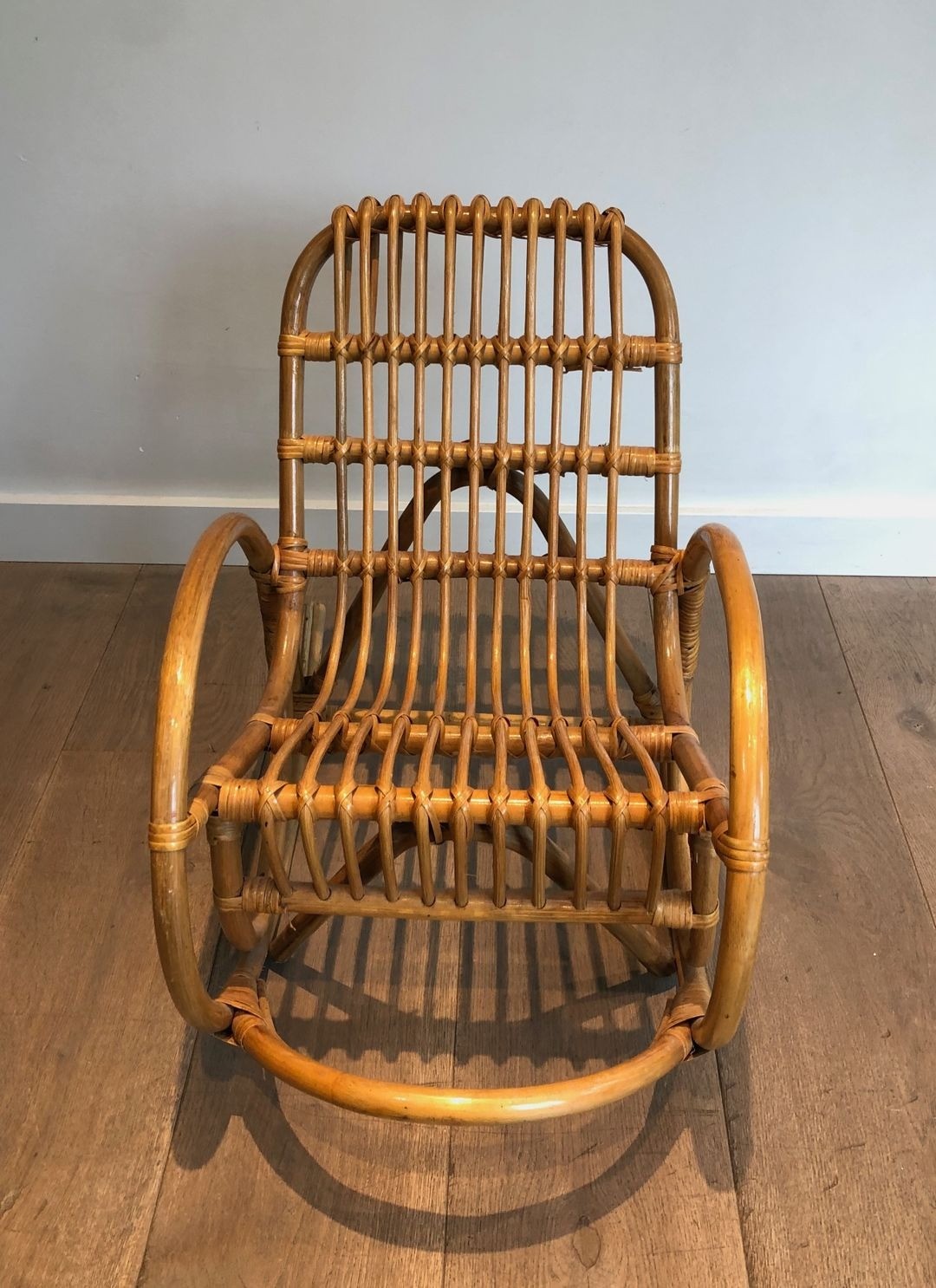 French rattan craft of the 1970s occupied a specific cultural moment. The decade was one of return — to natural materials, to craft, to objects that showed their making — in conscious reaction against the anonymous industrialism of postwar modernism. Rattan, which had been embraced in the 1950s as a modernist material and then somewhat eclipsed by plastics in the 1960s, returned with a warmer valence: natural, renewable, visibly hand-worked. A children’s rocking chair in this context was not merely furniture but a small manifesto of tactile, organic domesticity — an object that placed childhood at the centre of the home’s material culture.
