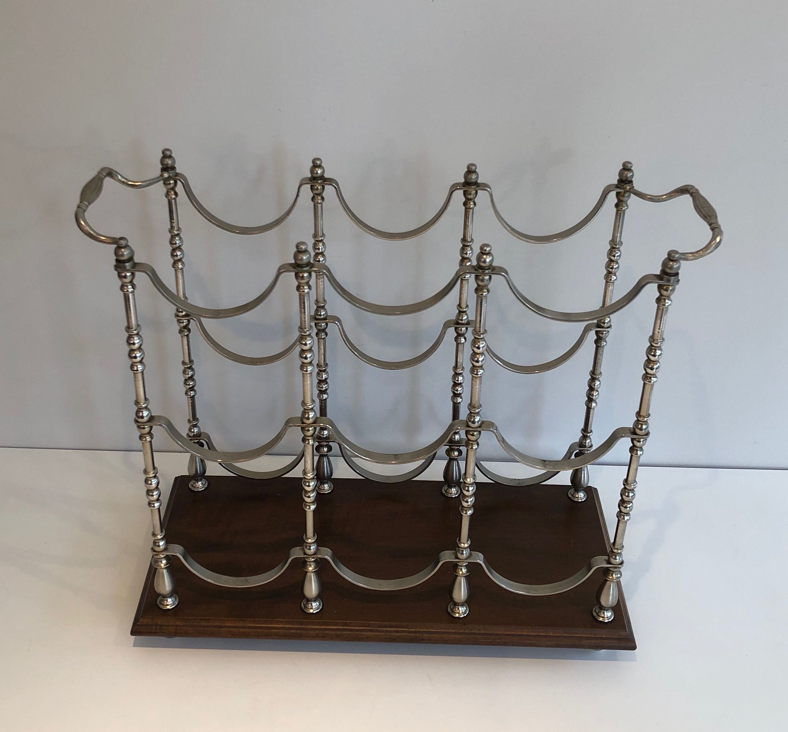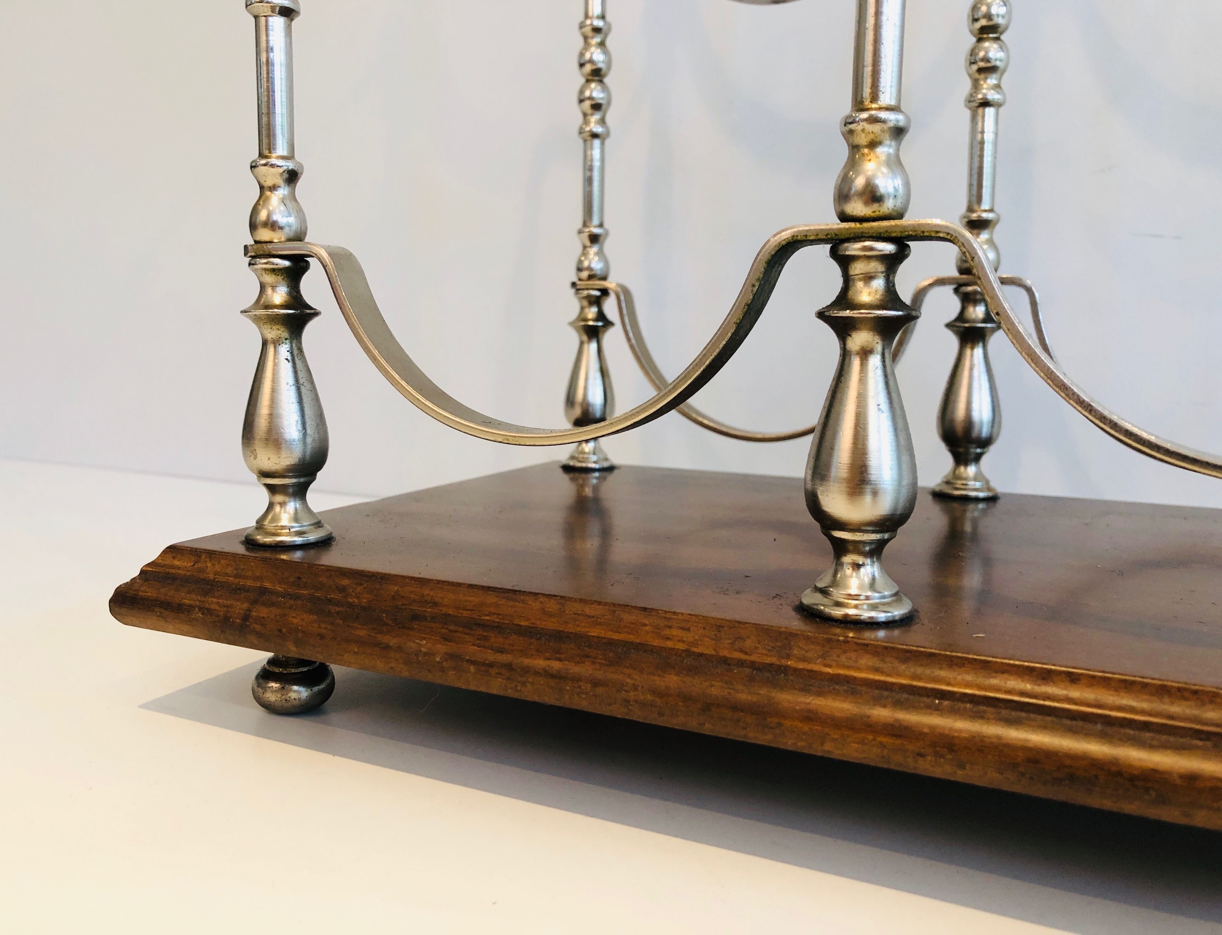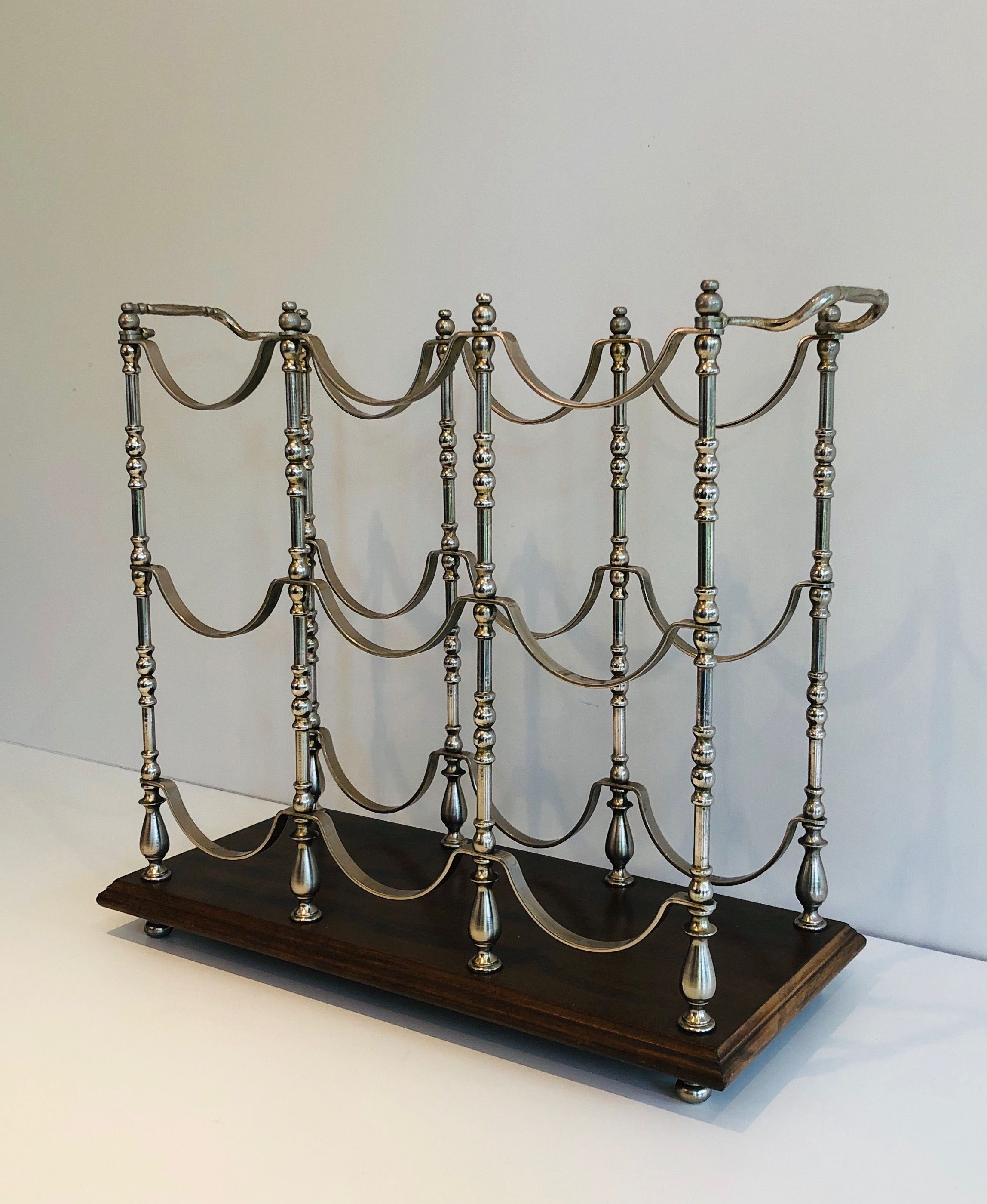 This elegant bottle holder combines a silvered metal framework with a wooden base, the interplay of gleaming silver metal and warm natural wood producing a refined material contrast characteristic of French domestic design at its most considered. The holder is designed to display and serve wine or champagne bottles in a tilted position, the angled cradle allowing easy pouring while presenting the bottle at its most elegant. The quality of the materials and the care of the construction speak to the French tradition of transforming objects of everyday use into objects of quiet luxury.