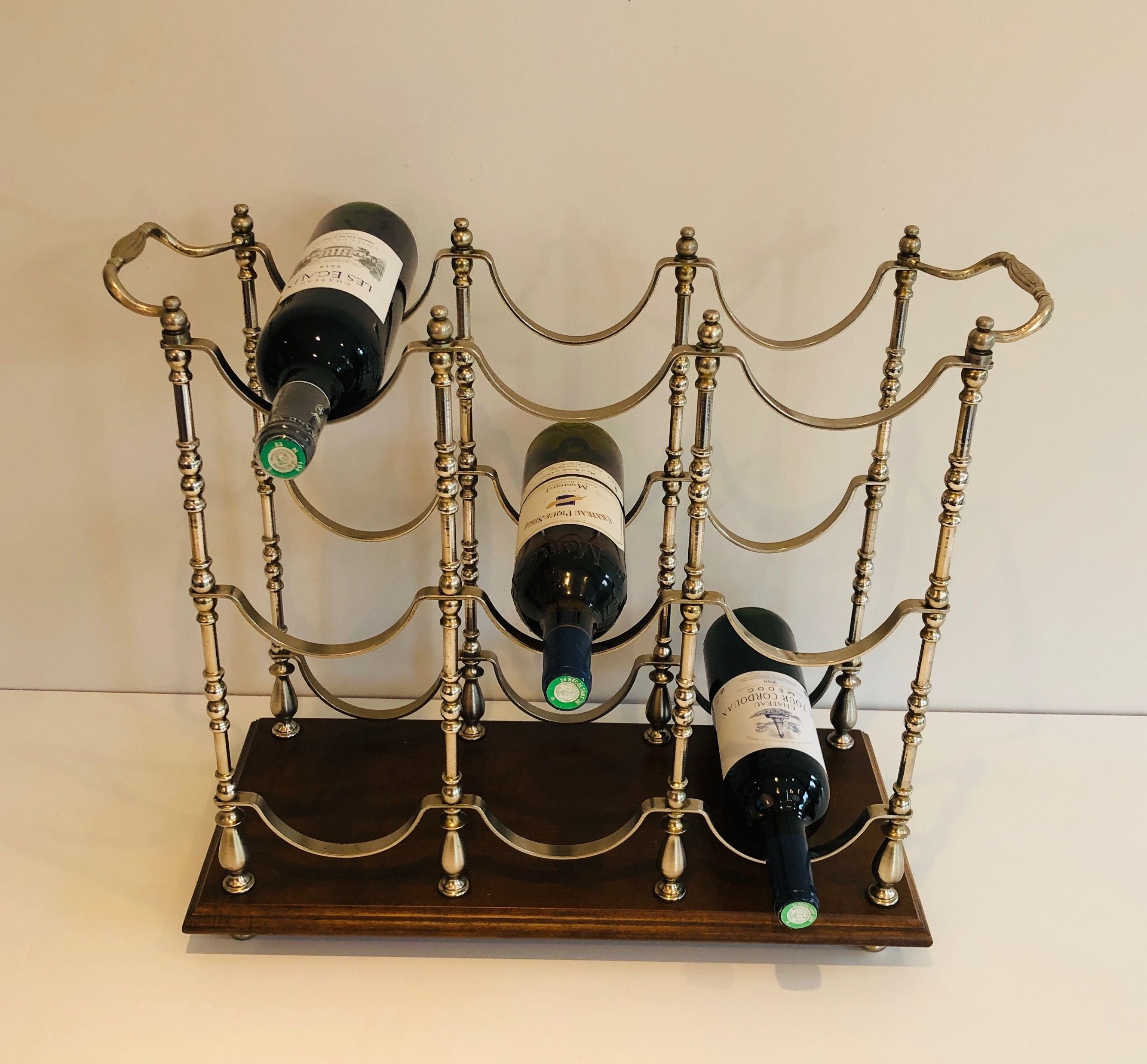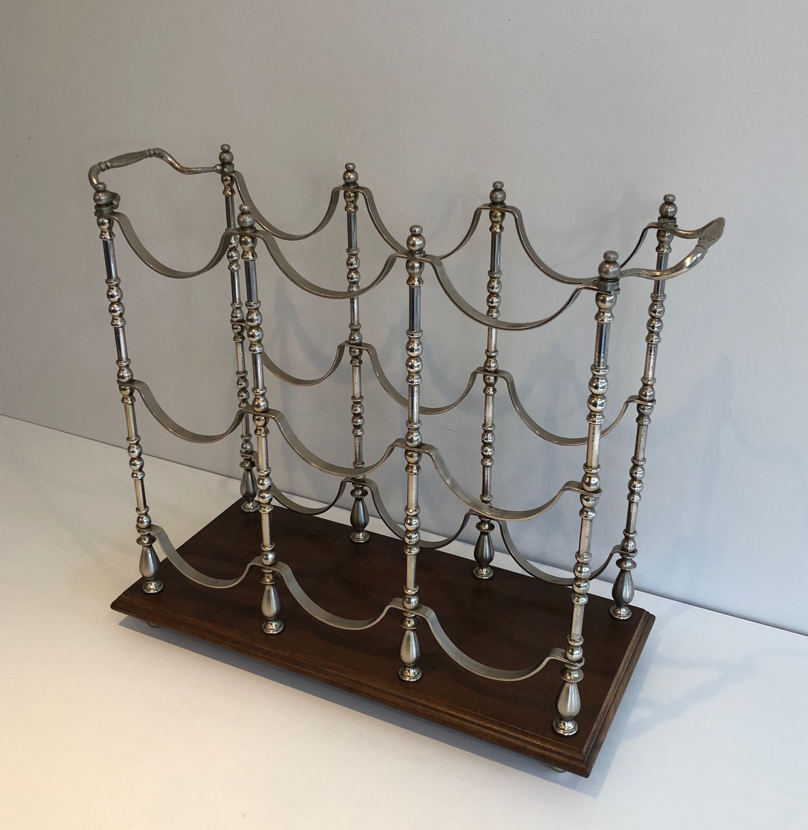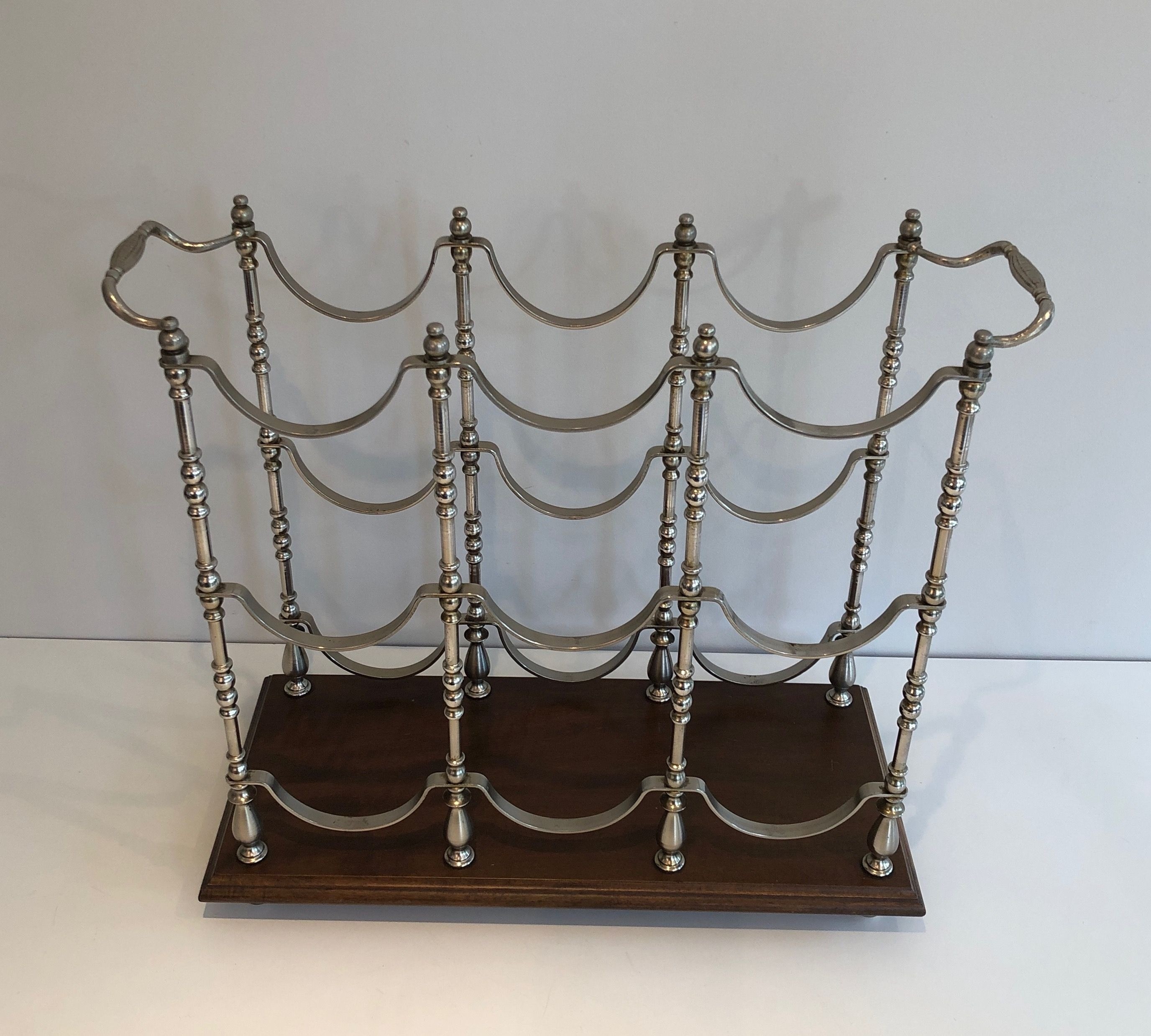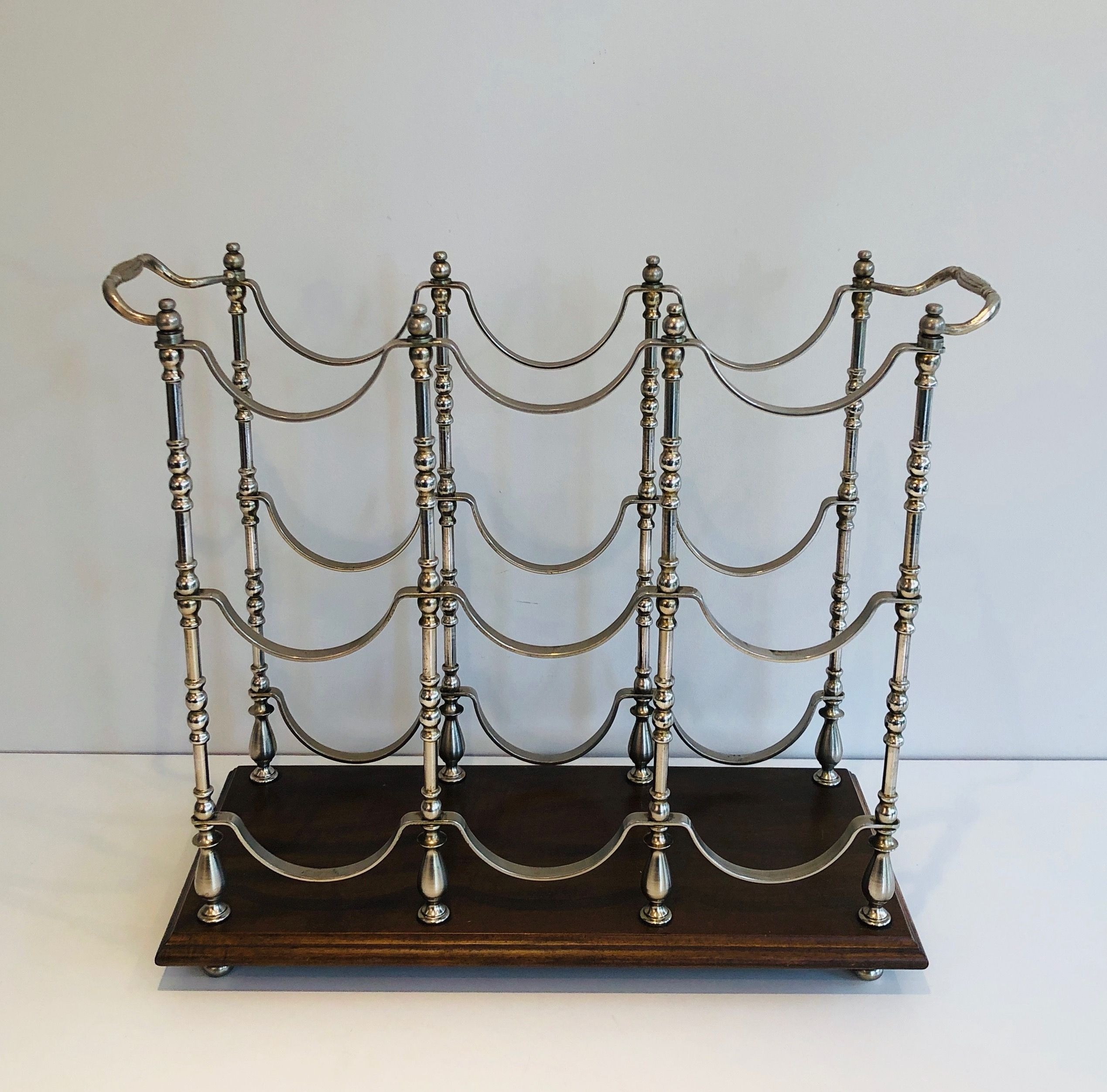 This elegant bottle holder combines a silvered metal framework with a wooden base, the interplay of gleaming silver metal and warm natural wood producing a refined material contrast characteristic of French domestic design at its most considered. The holder is designed to display and serve wine or champagne bottles in a tilted position, the angled cradle allowing easy pouring while presenting the bottle at its most elegant. The quality of the materials and the care of the construction speak to the French tradition of transforming objects of everyday use into objects of quiet luxury.