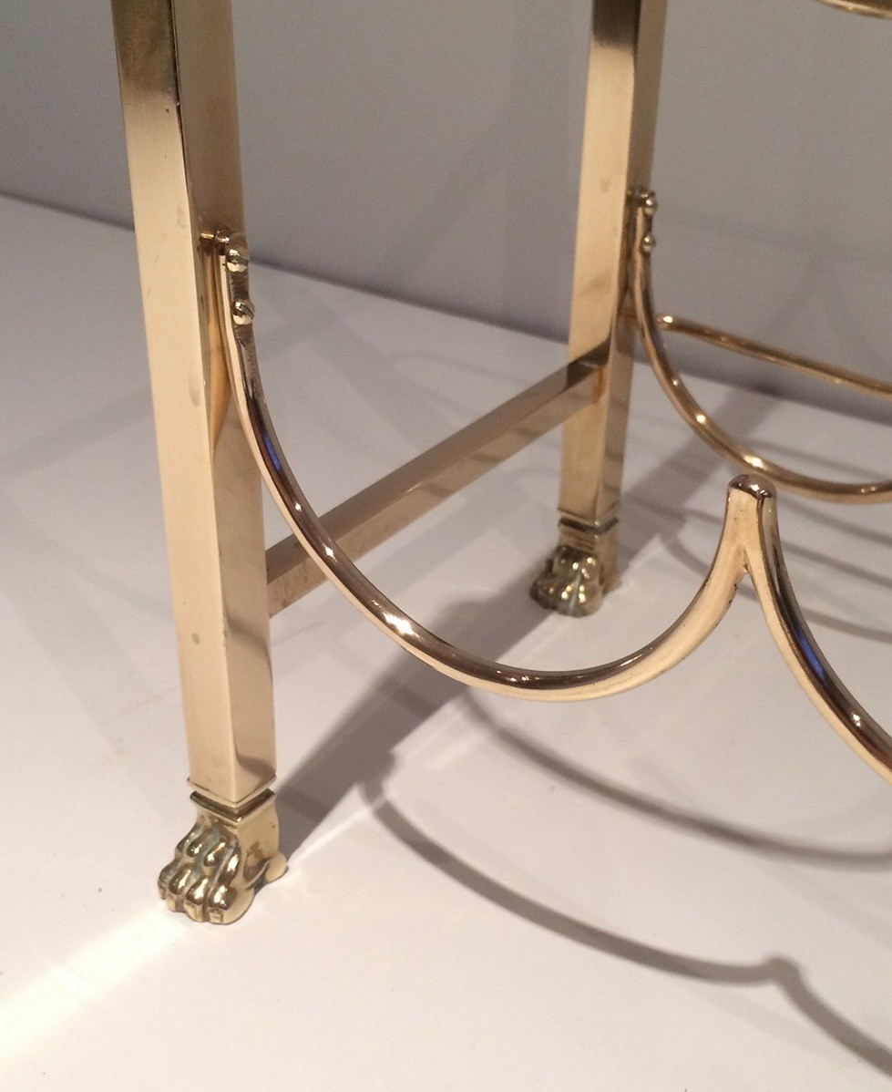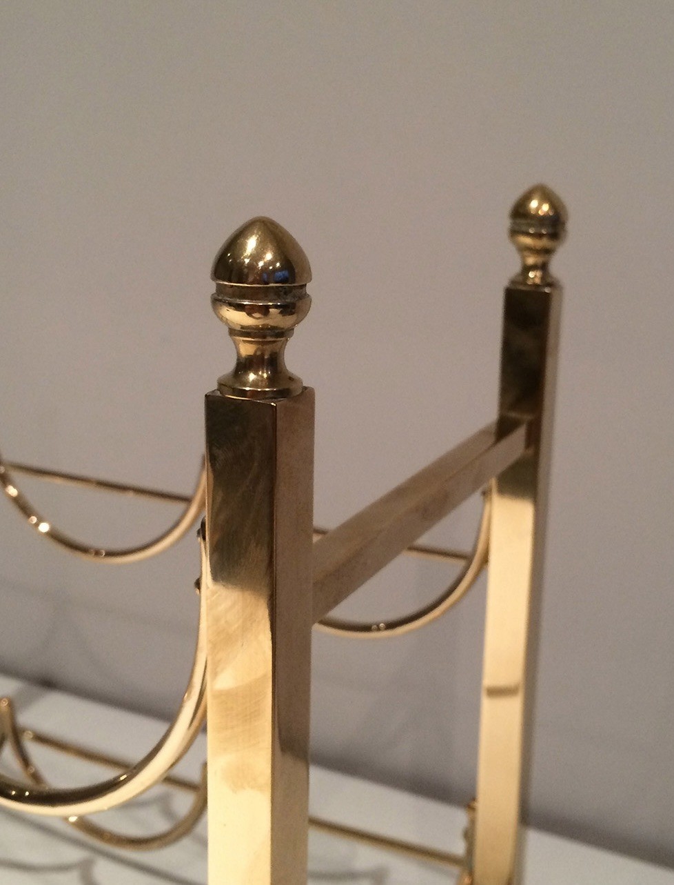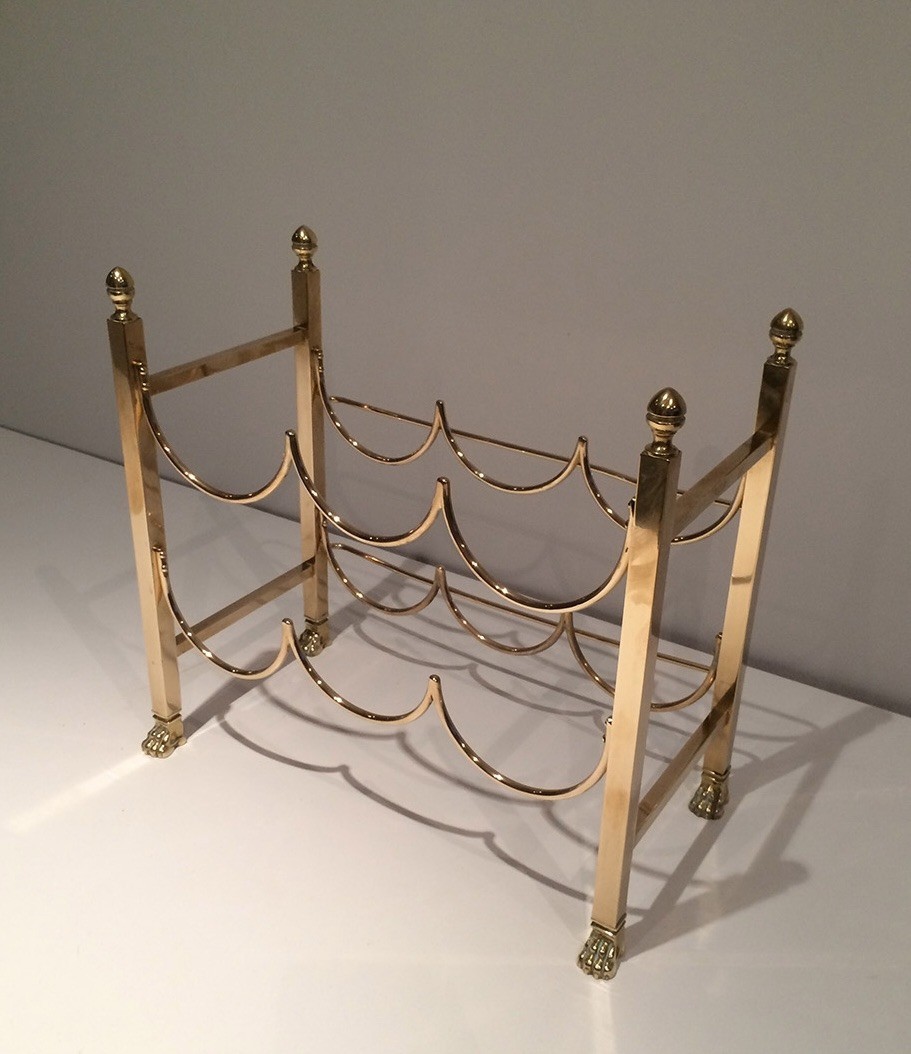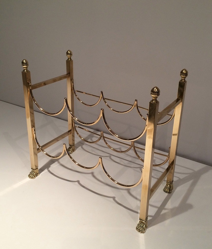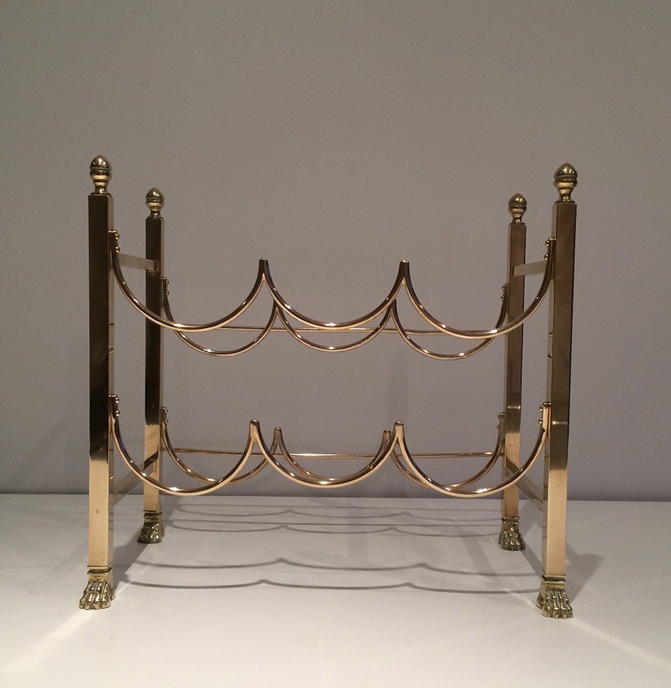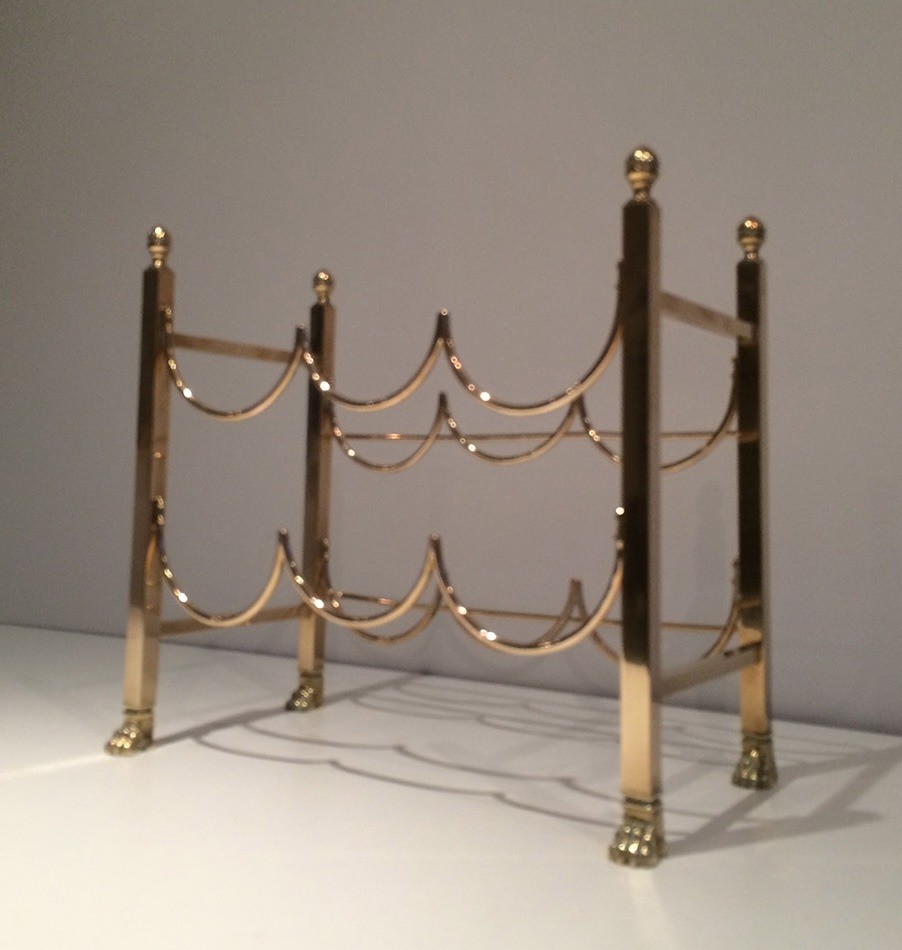 This remarkable brass bottle holder is an object that unites extraordinary functional intelligence with the decorative sophistication for which Maison Jansen was celebrated. The piece is designed to hold six bottles, their necks cradled in the metallic structure while the holder itself stands on boldly cast claw feet — an animalistic detail that lends this bar accessory an almost heraldic presence. The warm gleam of the polished brass transforms a utilitarian object into an ornament of the first order, worthy of the most distinguished cellar or salon.