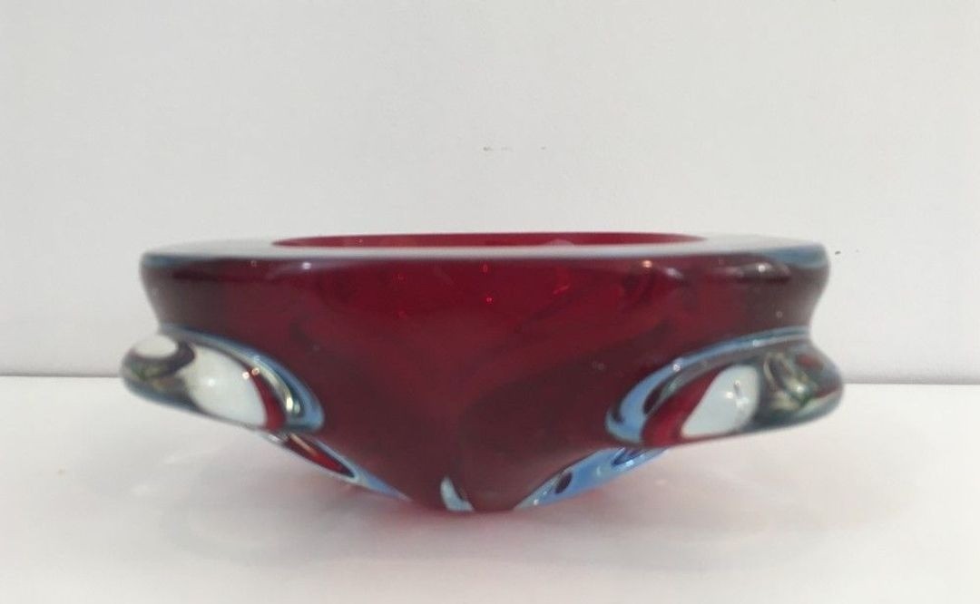 The technique employed here — layering differently coloured molten glasses to create a composite piece in which distinct colour zones remain separated and visible — is associated above all with the glassblowing tradition of Murano, the Venetian island whose workshops perfected this approach over centuries and brought it to new expressive heights in the mid-twentieth century. The Italian designers and glassblowers of the 1950s and 1960s elevated the ashtray into a form worthy of serious artistic ambition, producing pieces whose sculptural presence and chromatic intensity gave them a status independent of their original function.