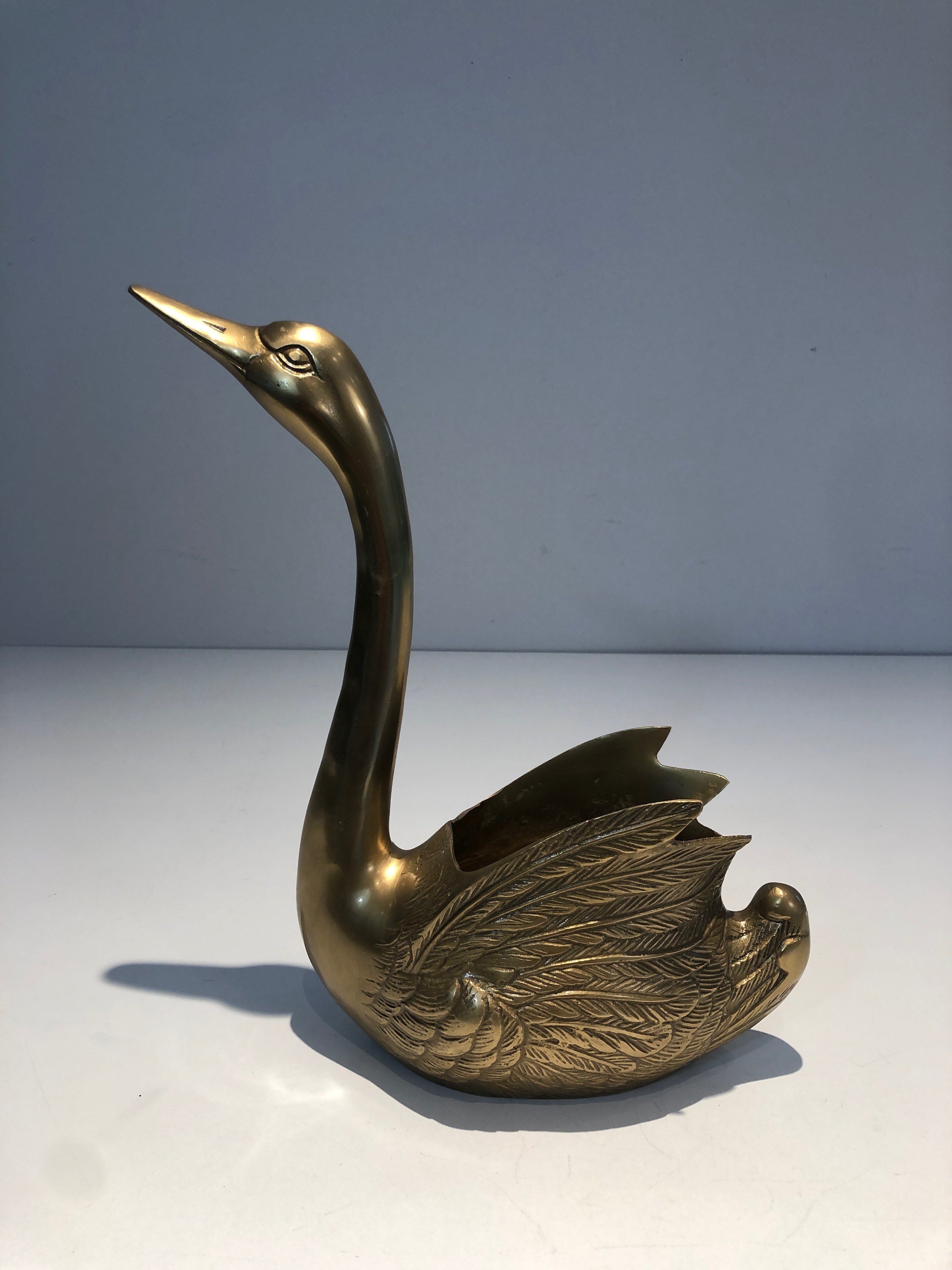 The swan has been one of the most beloved motifs in French decorative arts since the Empire period, when it became closely associated with the iconography of the Empress Joséphine and the luxurious furnishings of the Napoleonic court. From its origins as a symbol of grace, fidelity, and aristocratic refinement, the swan migrated into virtually every domain of French decorative production — textiles, furniture, bronzes, and small objects — and has remained a constant presence in French interiors ever since. This brass swan vide-poche, produced around 1970, continues this long tradition with lightness and charm.
