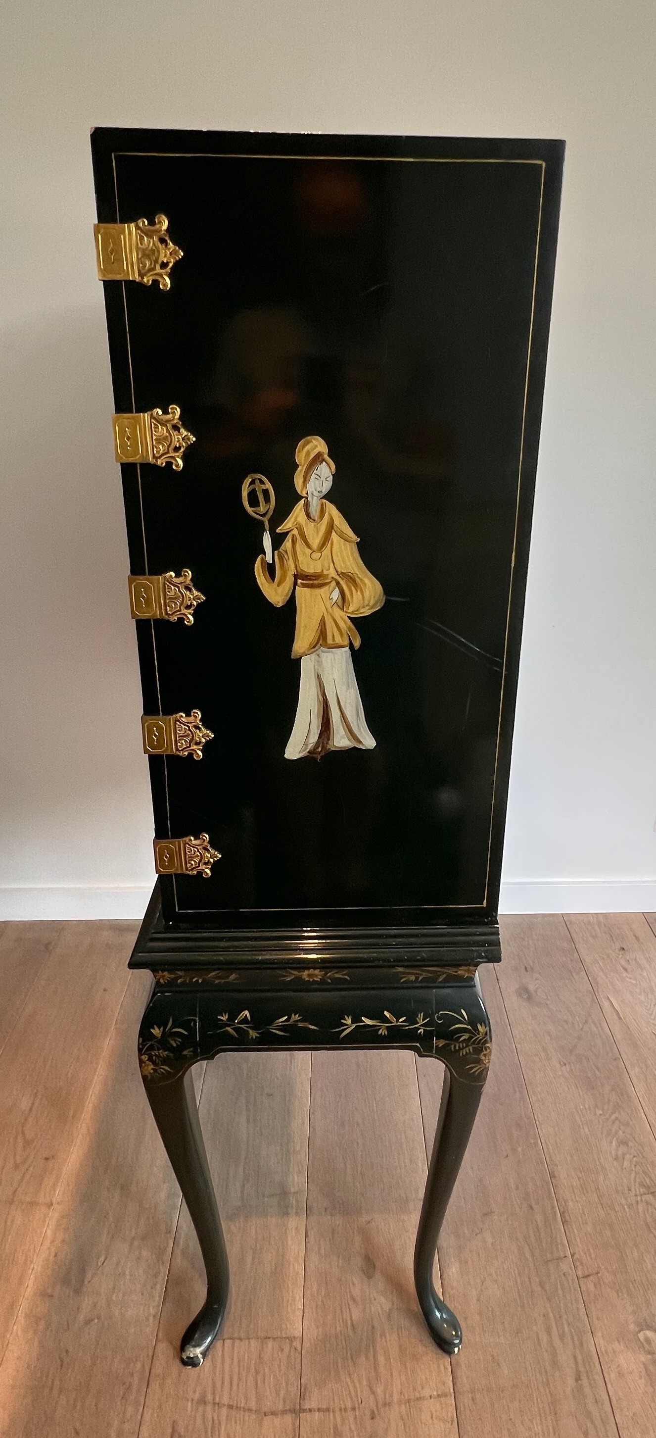 Chinese lacquered and gilt cabinet with chinese life sceenes. The inside part is made of eglomised mirrors. French work. Circa 1940