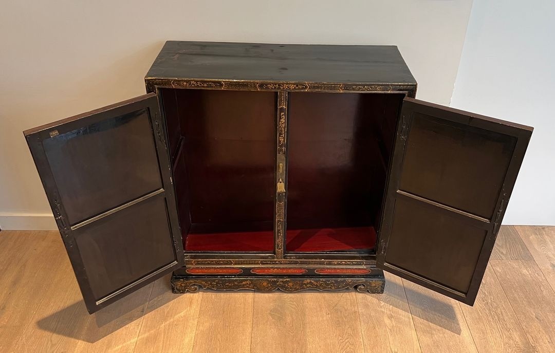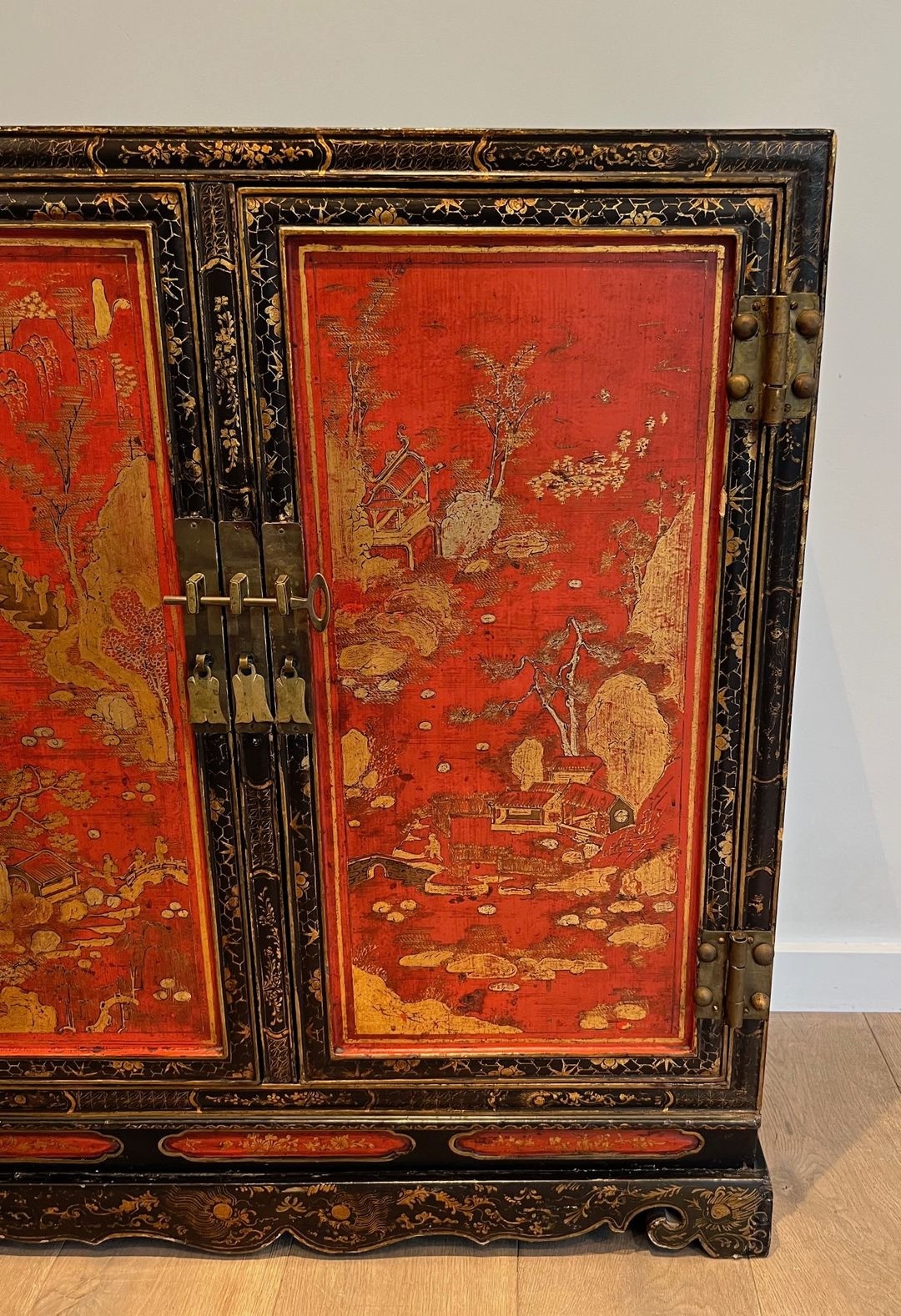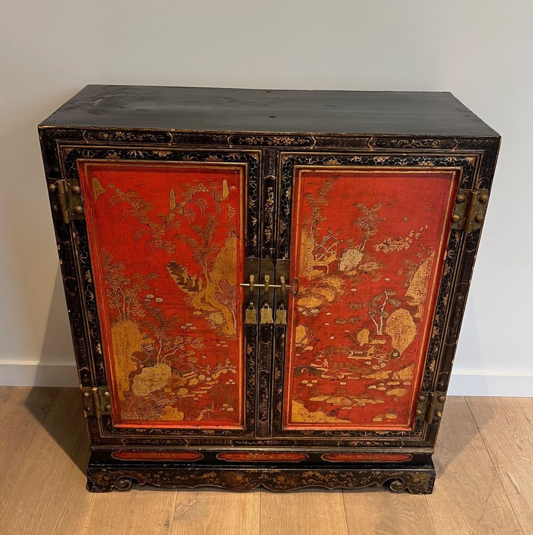 This two-door cabinet is a fine example of the synthesis. Against a field of deep black lacquer, chinoiserie scenes unfold in red and burnished gold — pagodas, figures, foliage and birds rendered with the free interpretive hand that distinguishes French chinoiserie from mere imitation. Measuring 88.5 centimetres in width and nearly as tall, the cabinet presents its two decorated panels as luminous compositions framed by the clean architectural lines of the Art Déco case.