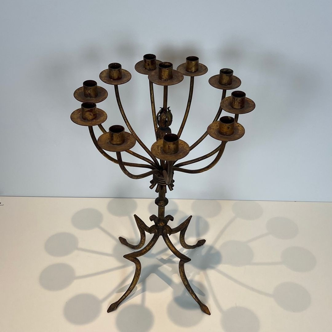This imposing eleven-light candlestick in gilt wrought iron stands as a commanding example of mid-twentieth-century French decorative metalwork. Rising to sixty-one centimetres, the piece is arranged around a central shaft from which eleven candle arms radiate outward in a disciplined yet exuberant composition. Each arm is shaped with care, terminating in a drip pan designed to receive a taper candle, while the applied gilding lends a warm, ceremonial luminosity to the overall silhouette.