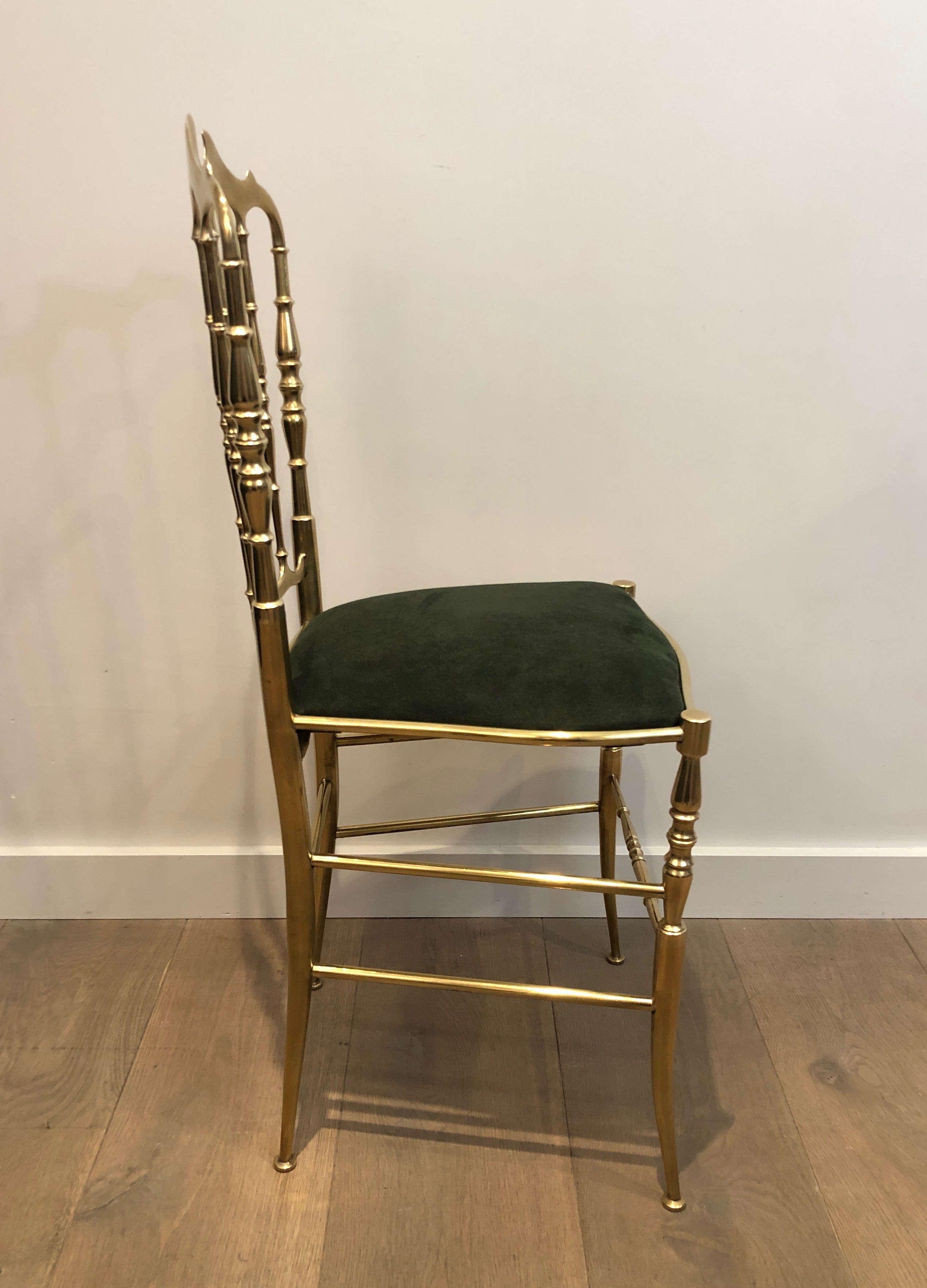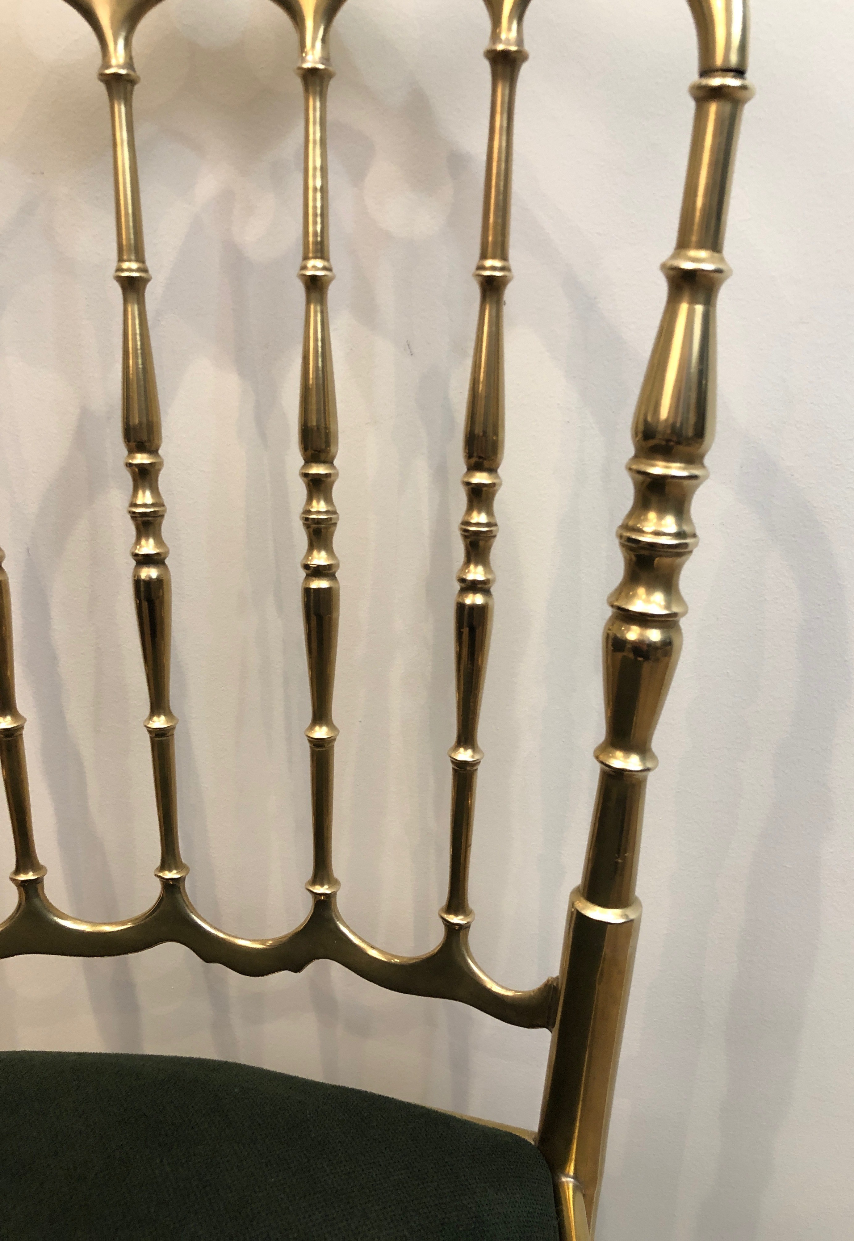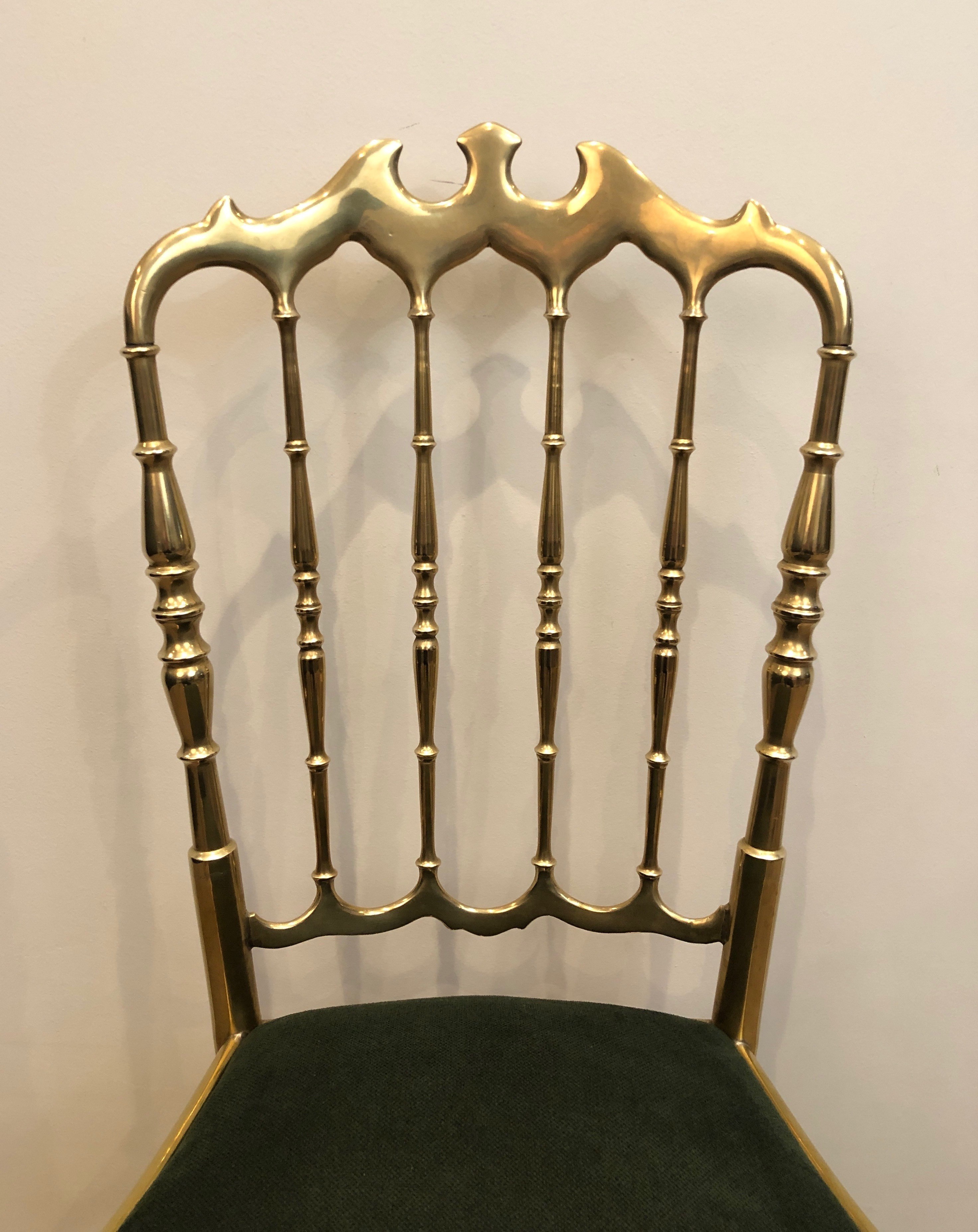 A rare and distinguished set of six brass Chiavari chairs with seats upholstered in green velvet — a refined example of the Italian craft tradition in its most luxurious expression. The Chiavari chair, with its characteristic openwork backrest, tapered legs, and delicate ladder-back structure, is rendered here in polished brass rather than the traditional wood, a transformation that elevates it from a masterpiece of artisanal carpentry into an object of precious metalwork. The green velvet seats provide a chromatic complement of great elegance to the gleaming metal.
