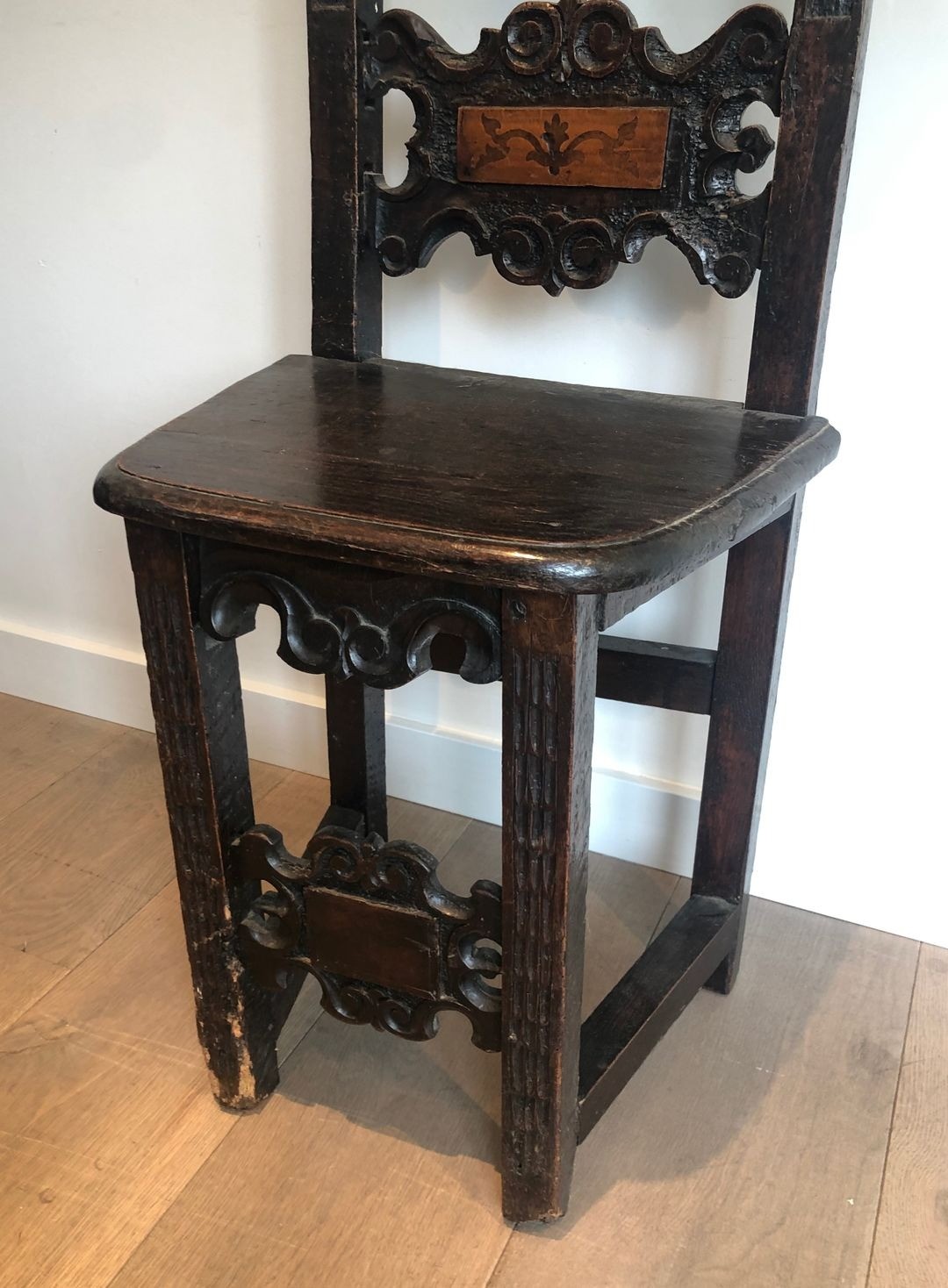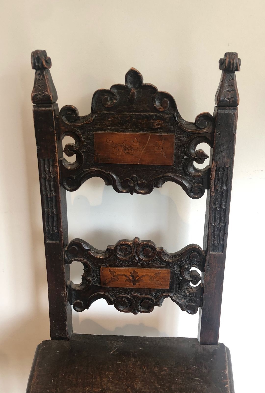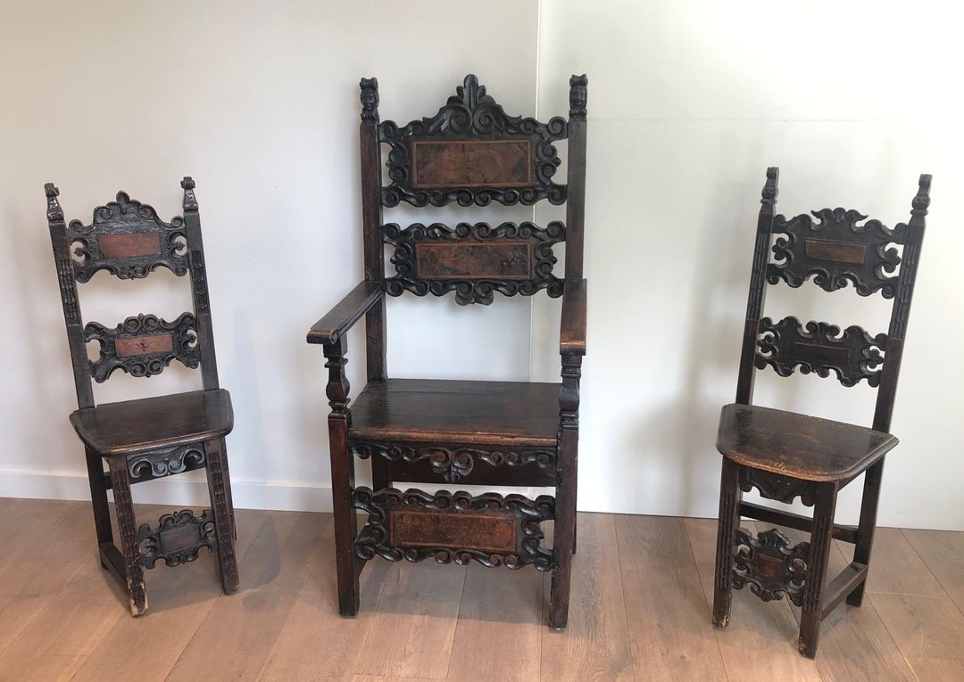 This suite of three seats—one armchair and a pair of chairs—in dark walnut stands as a rare survivor from the Italian Renaissance of the seventeenth century. The armchair, rising to 137 centimetres, commands the room through the authority of its high back, a structural gesture inherited from medieval thrones and refined through two centuries of Italian palatial culture. The walnut, dark and close-grained, carries the deep lustre of four hundred years of age, its surface a record of use and care that no restoration could replicate.