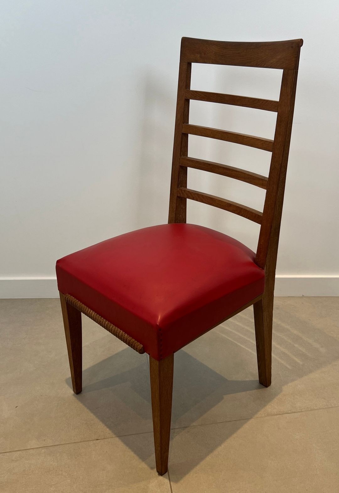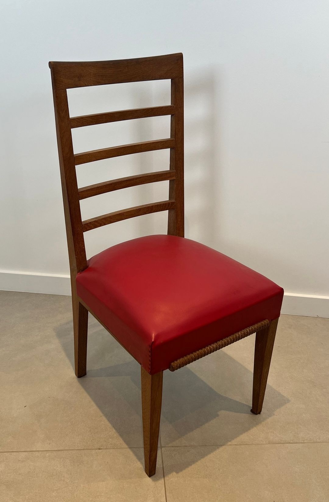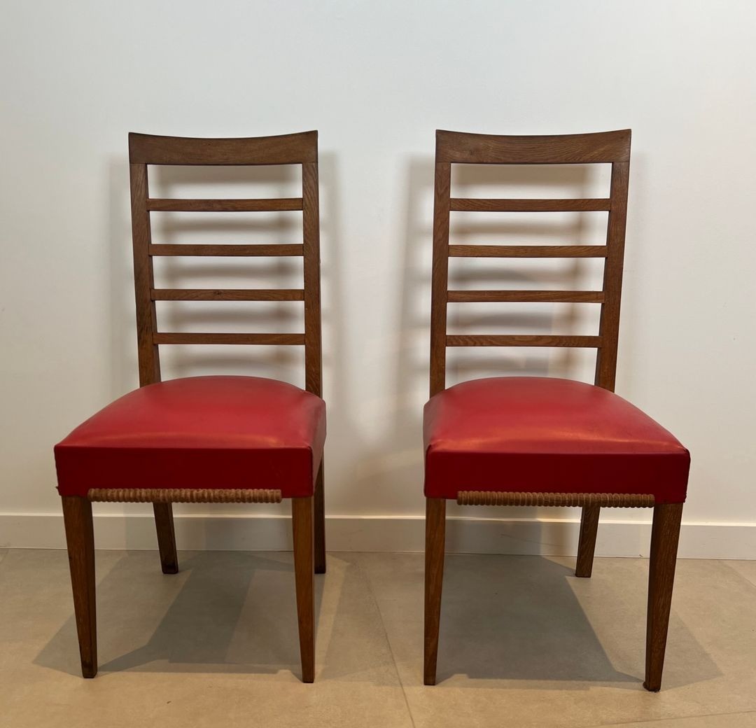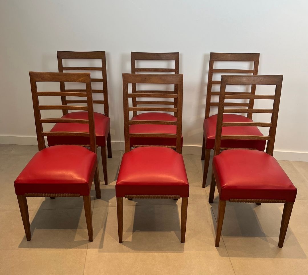 Set of six Art Déco oak dining chairs with red faux-leather seats. French work in the style of André Arbus, circa 1940. W. 45 cm × D. 56 cm × H. 101 cm.