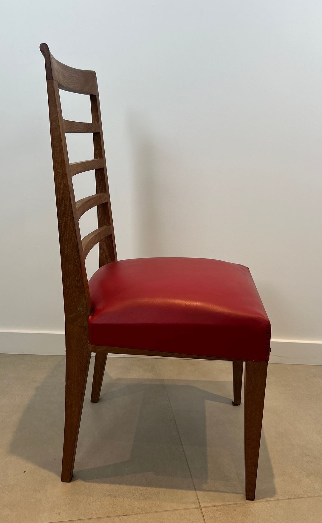 Oak, the wood of French Gothic choir stalls and Normandy farmhouse dressers alike, brings to these chairs a particular quality of permanence and rootedness. Its dense grain receives the clean geometric profiles of Art Déco carving with exceptional authority, the austerity of the form amplified rather than softened by the material. Against the warm amber of the oak, the red faux-leather seats operate as a chromatic intervention — warm, confident, slightly festive — the kind of colour decision that transforms a set of functional objects into something with real personality. Skaï, the imitation leather widely adopted in French interiors of the 1930s and 1940s, was itself a material of democratic aspiration: durable, easily maintained, carrying the silhouette of luxury without its cost. In this suite, all the elements conspire toward a table arranged with pleasure and ready to receive.