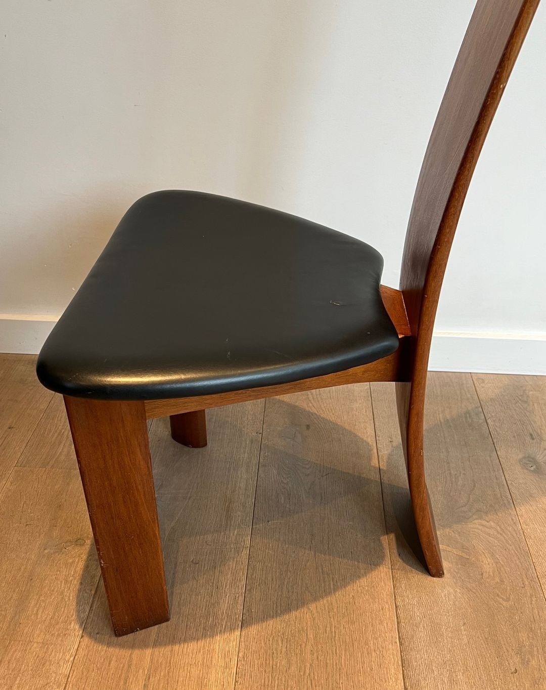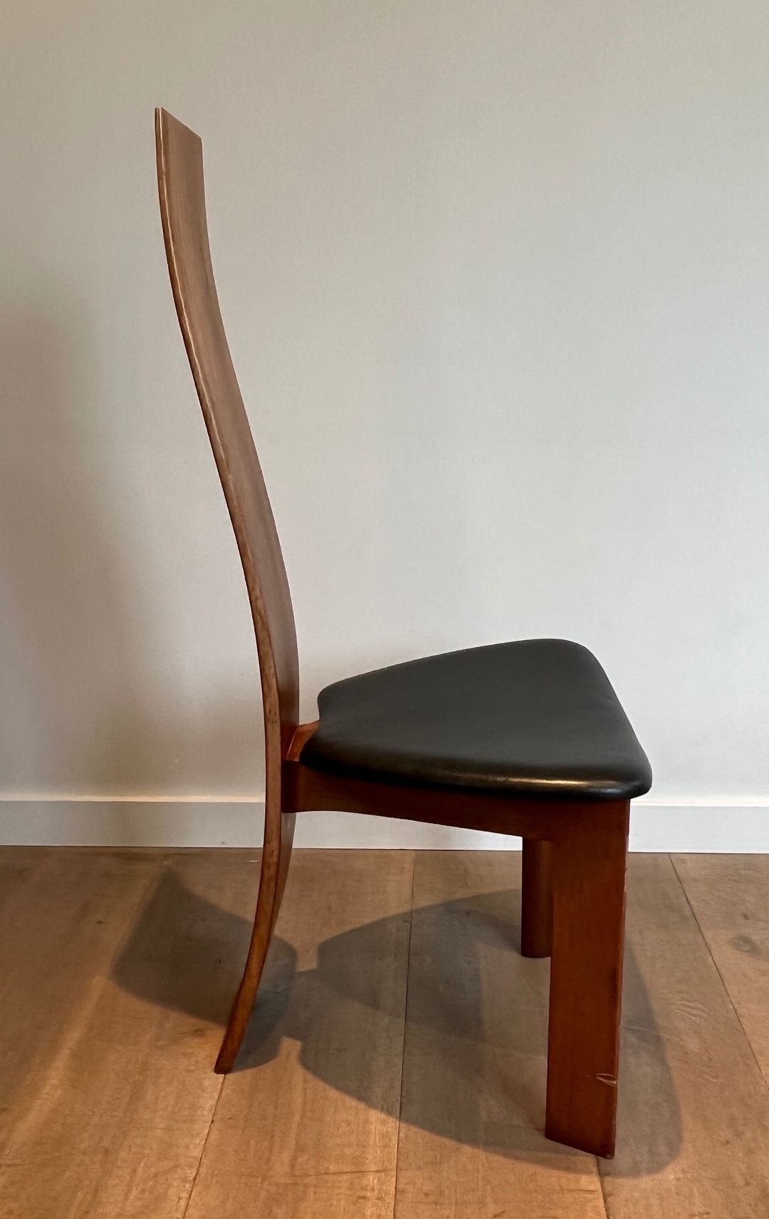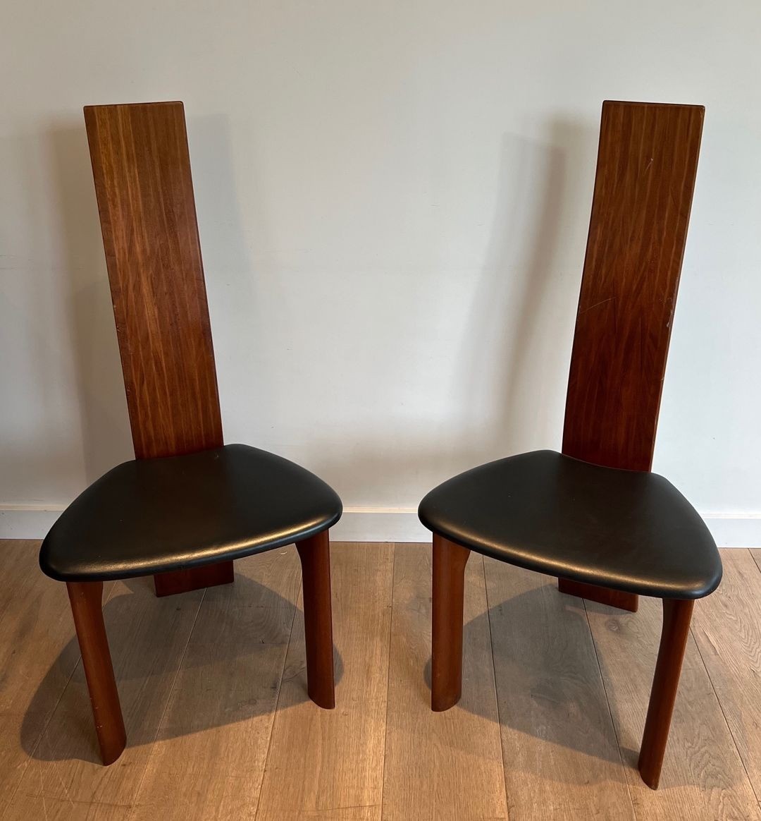 Pair of high-back chairs in exotic wood and black leather, Scandinavian work, circa 1970. Dimensions: W. 52 cm × D. 52 cm × H. 111 cm. Materials: leather and exotic wood.