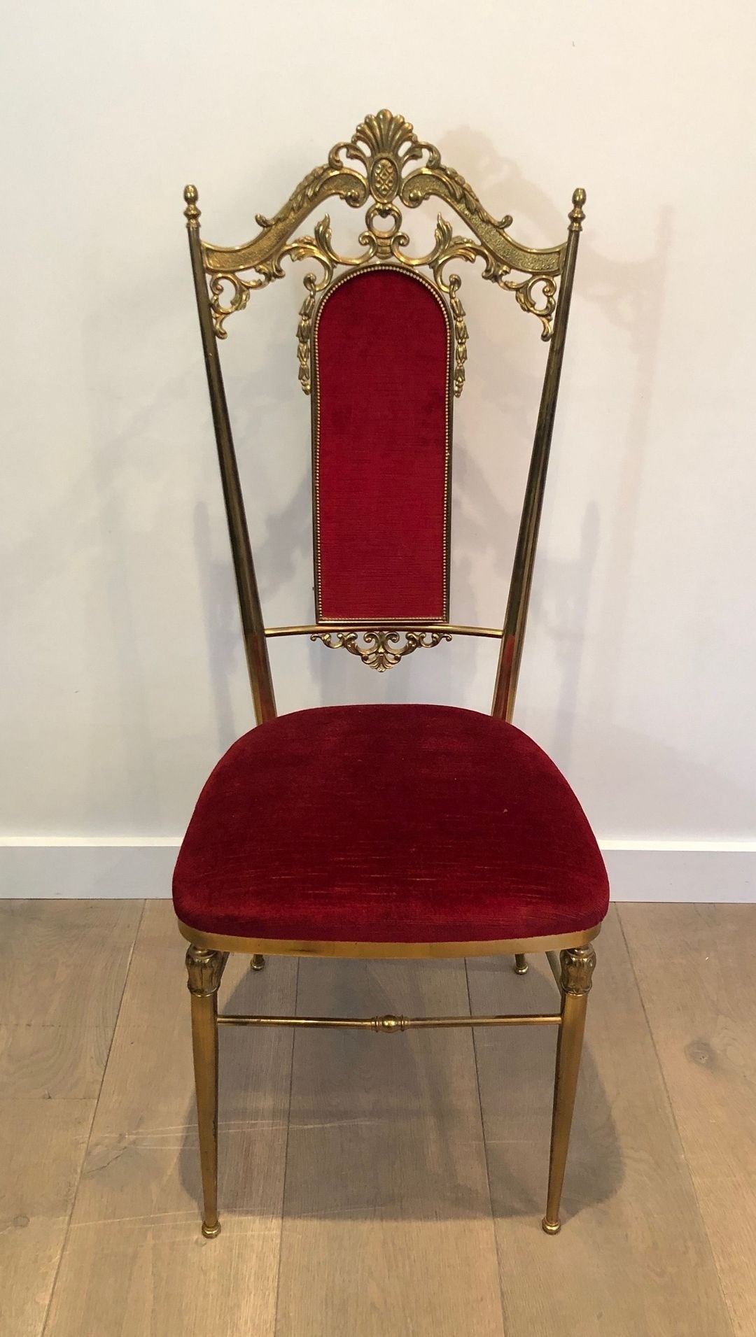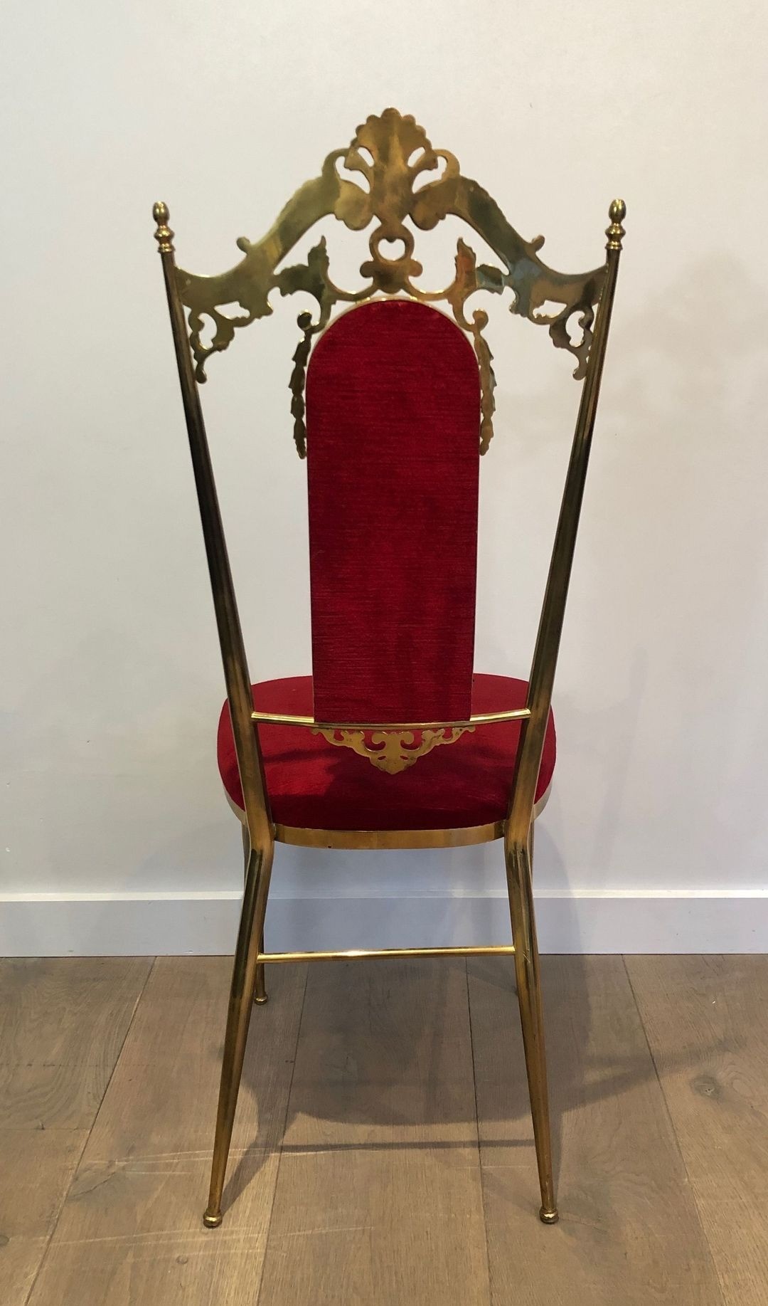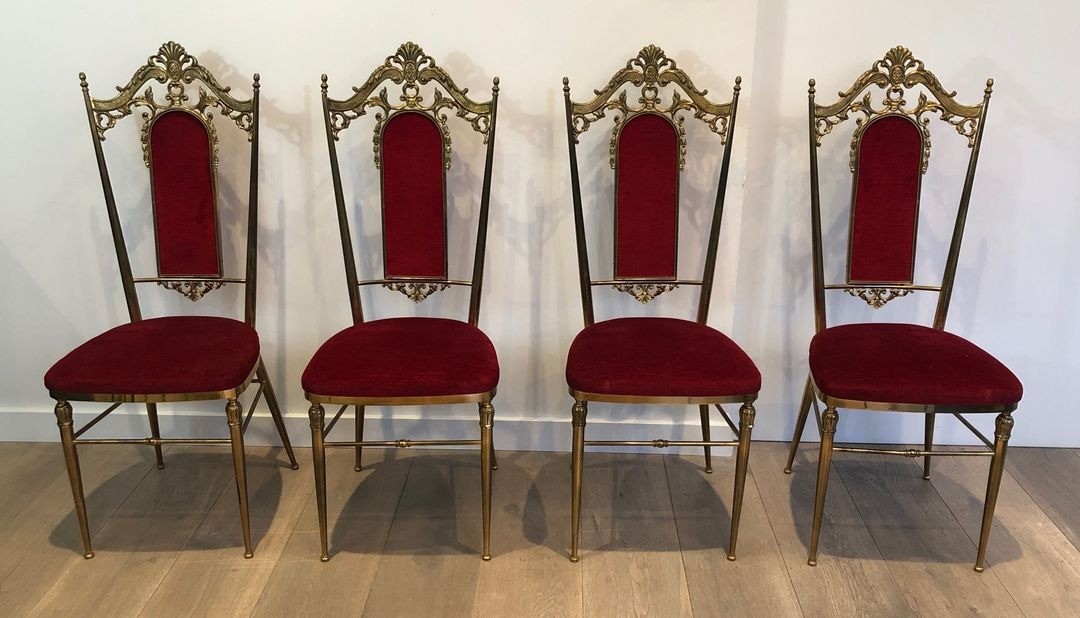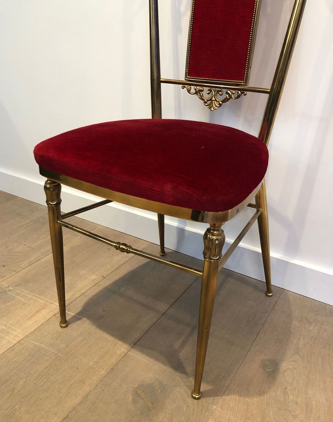 The chairs are distinguished by their tall, slender backs — rising to an imposing 106.5 cm (H. 41.93 in.) — a characteristic proportion of the neoclassical hall and dining chair, designed to project authority and architectural presence. The brass-mounted frames, a hallmark of the Jansen aesthetic, lend warmth and refinement to a design that might otherwise read as severe, the metal catching the light and articulating legs and uprights with a jeweller’s precision. The deep red velvet upholstery completes the palette with an imperial opulence: red and gold, the colours of the Napoleonic Empire, reprised here in the confident vocabulary of mid-century luxury craft.
