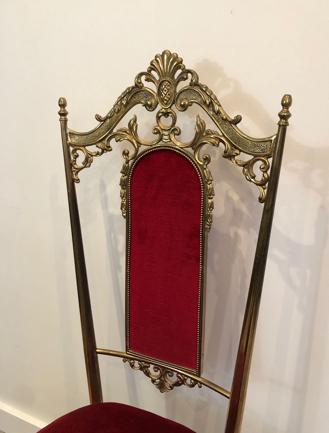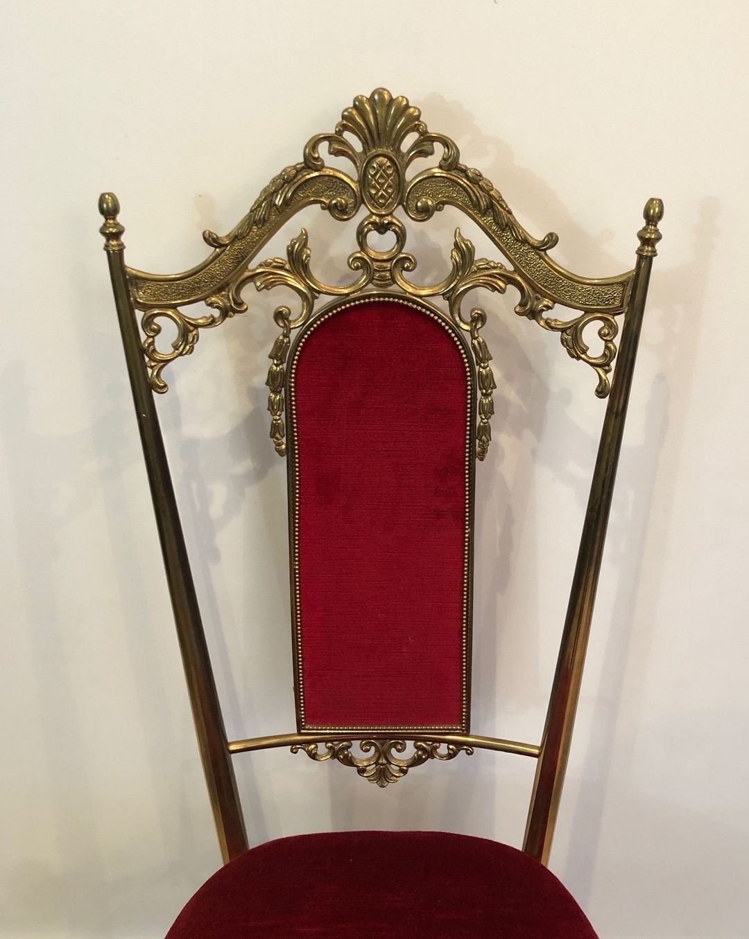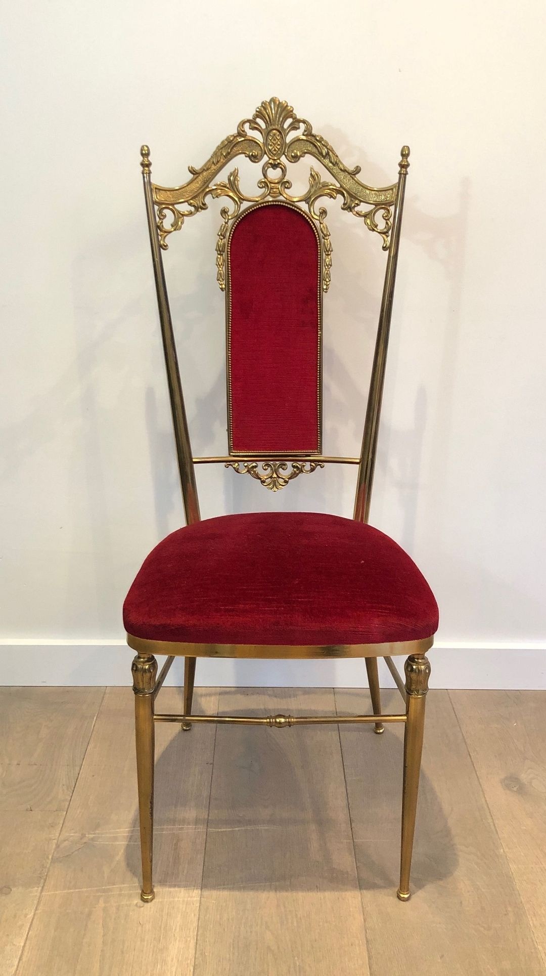 The chairs are distinguished by their tall, slender backs — rising to an imposing 106.5 cm (H. 41.93 in.) — a characteristic proportion of the neoclassical hall and dining chair, designed to project authority and architectural presence. The brass-mounted frames, a hallmark of the Jansen aesthetic, lend warmth and refinement to a design that might otherwise read as severe, the metal catching the light and articulating legs and uprights with a jeweller’s precision. The deep red velvet upholstery completes the palette with an imperial opulence: red and gold, the colours of the Napoleonic Empire, reprised here in the confident vocabulary of mid-century luxury craft.