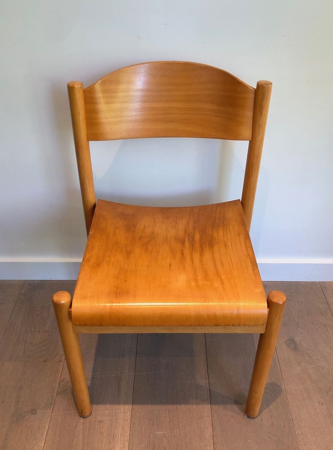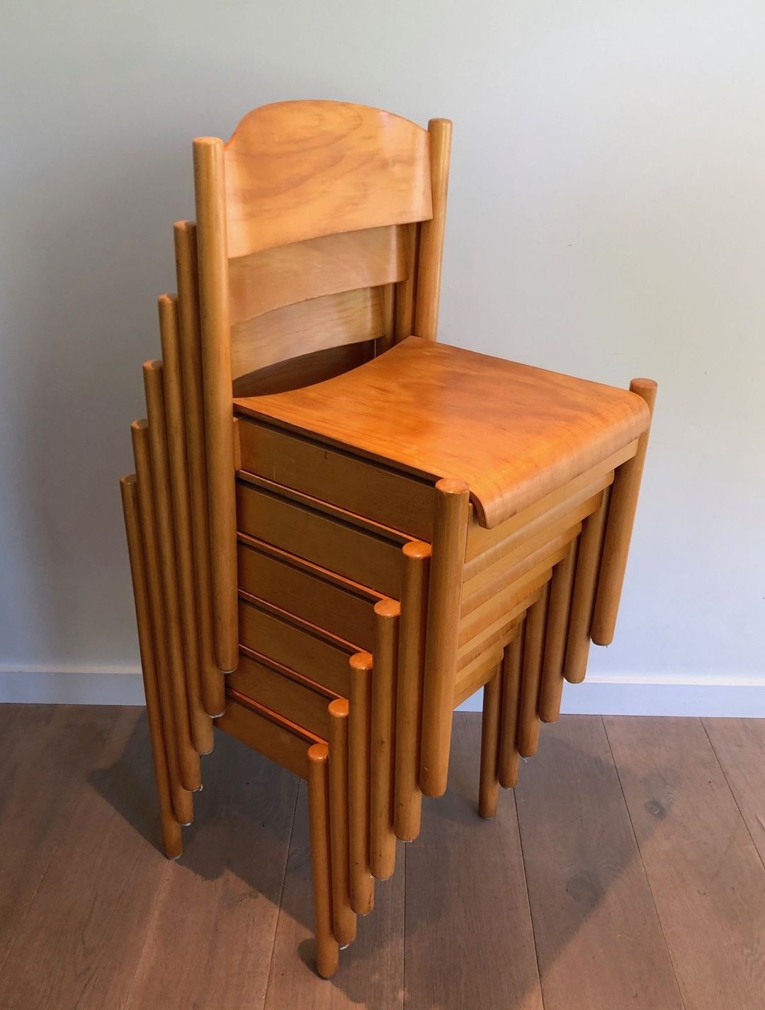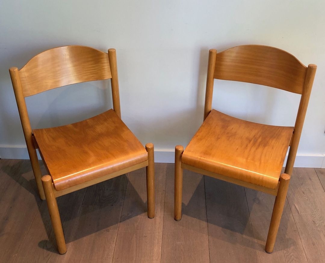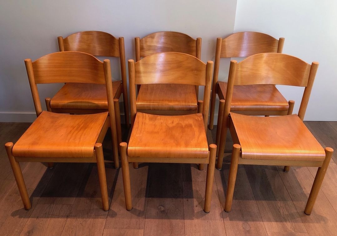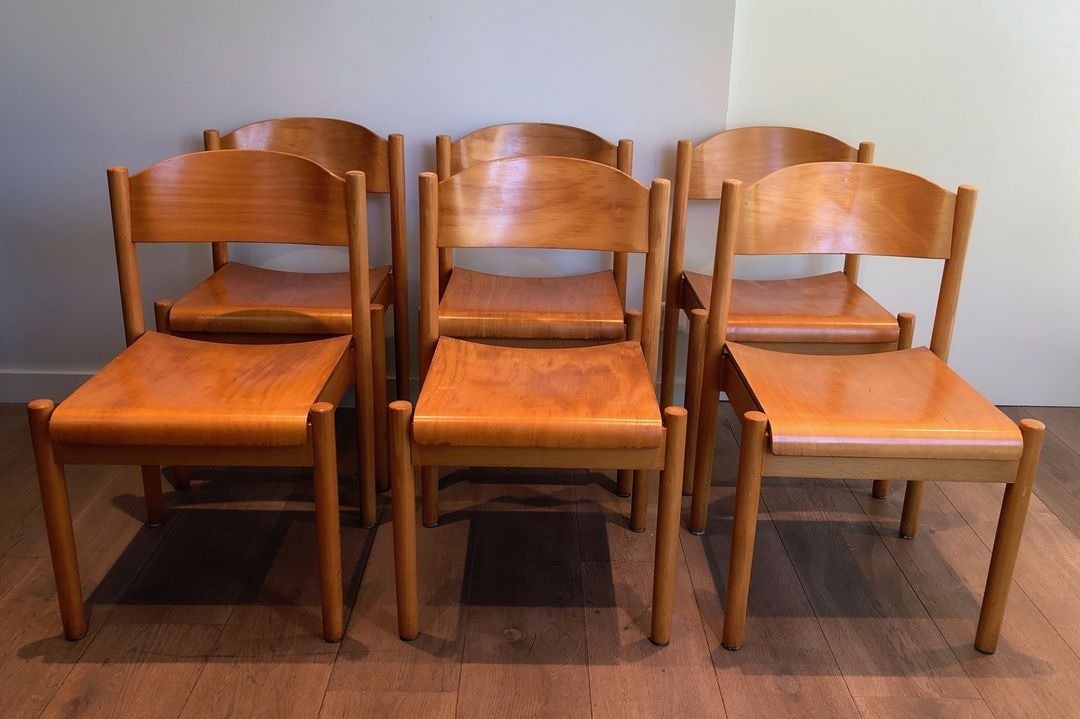 A well-preserved set of six stackable dining chairs in pine and thermoformed wood, by Karl Klipper. German work, circa 1970. W. 50.5 cm × D. 51 cm × H. 80.5 cm each.