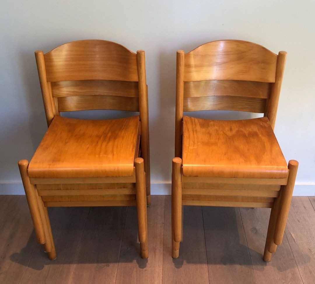 Set of Six Stackable Pine and Thermoformed Wood Chairs by Karl Klipper, circa 1970