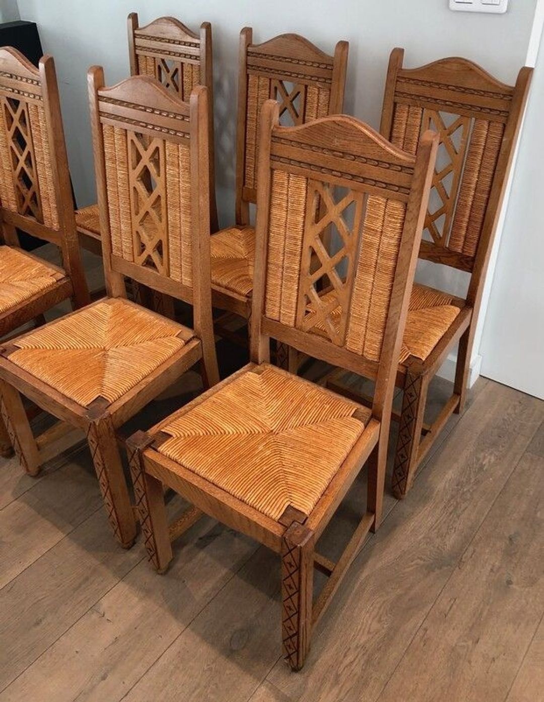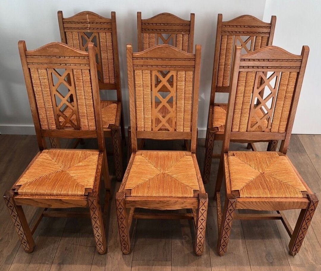 The mid-century French brutalist aesthetic, explored by craftsmen across France in the decade following the Liberation, has enjoyed a significant revival of interest among collectors and interior designers. Sets of six chairs in this tradition are particularly sought after, offering practical utility—sufficient for a full dining table—combined with the expressive formal power of objects conceived as much to be looked at as to be sat upon.