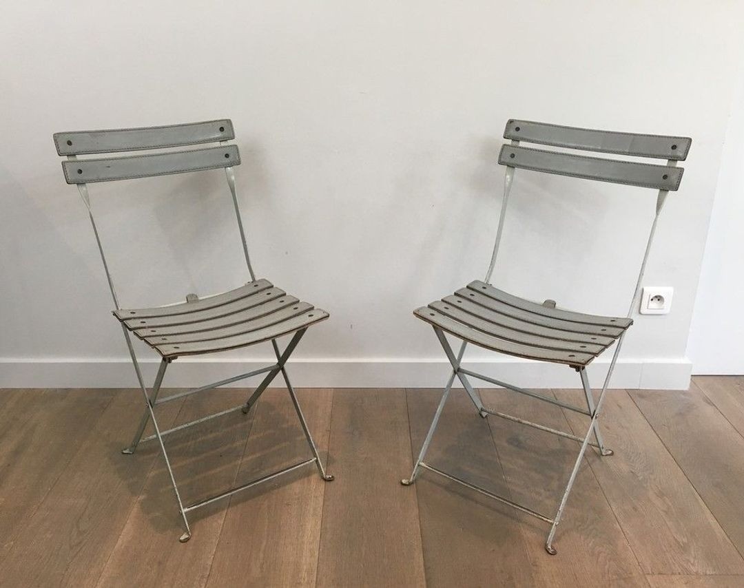 A refined pair of folding chairs in lacquered metal with grey leather-strap seat and back, by Zanotta, circa 1970. W. 43 cm × D. 50 cm × H. 82 cm each.