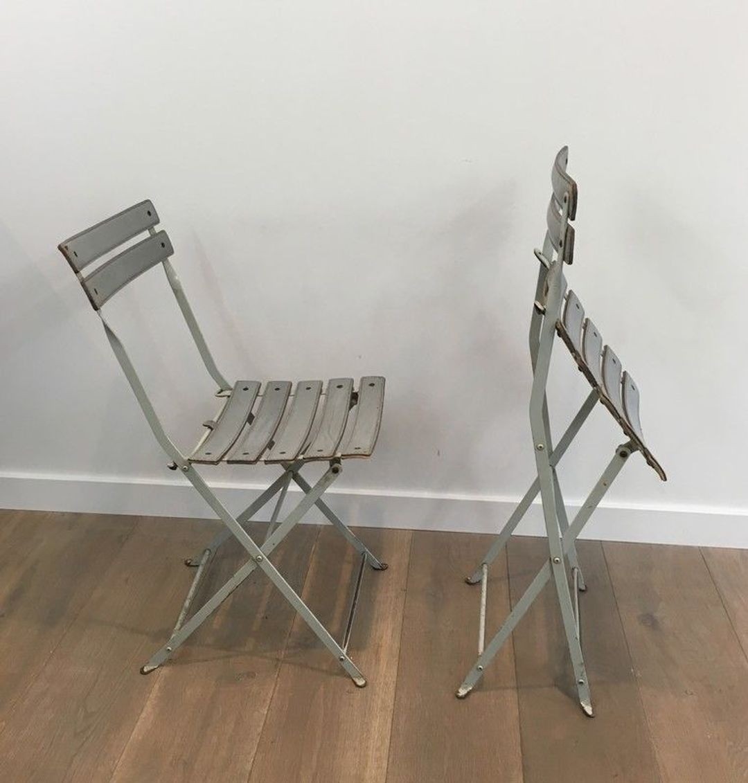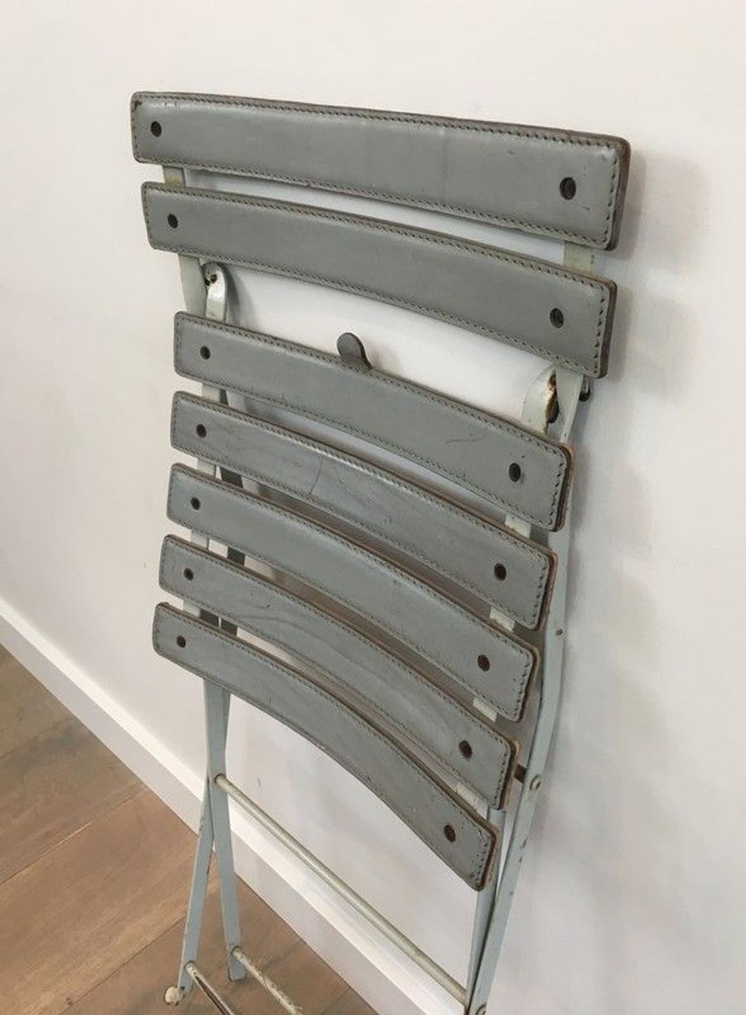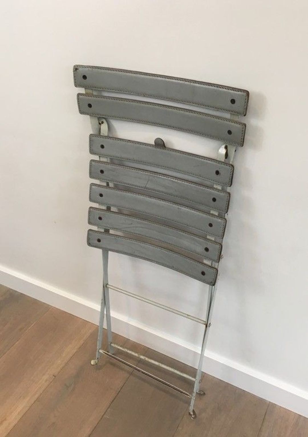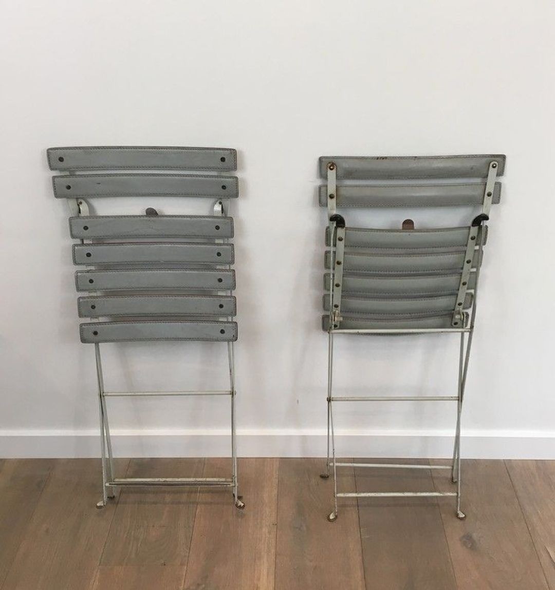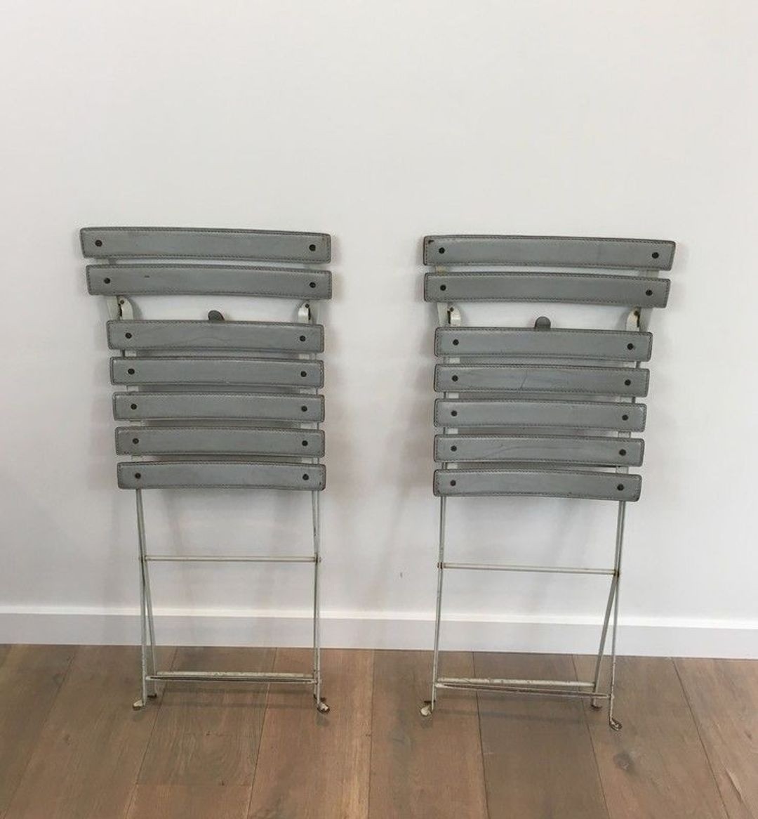 Each chair is constructed from a lacquered metal frame—elegant in its precision, functional in its folding mechanism—onto which grey leather straps are stretched to form the seat and back. This marriage of industrial metal and natural leather is characteristic of the Italian design tradition: a pleasure in the contrast of materials, and a conviction that beauty and utility need never be opposed. The grey leather, now beautifully aged, lends the pair a quiet, lasting sophistication.