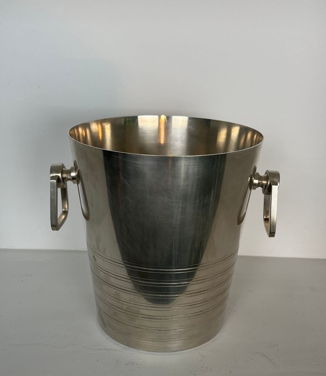 This champagne bucket is an accomplished example of the Art Deco aesthetic applied to the luxury table. Worked in silver-plated metal, the body rises in a confident tapering cone from a narrow base to a wide flared opening — a form that is at once practical, holding a bottle securely in ice, and architecturally assured in its proportions. The upper portion of the body is burnished to a high mirror finish, reflecting its surroundings in the cool, liquid manner of the finest silver of the period.
