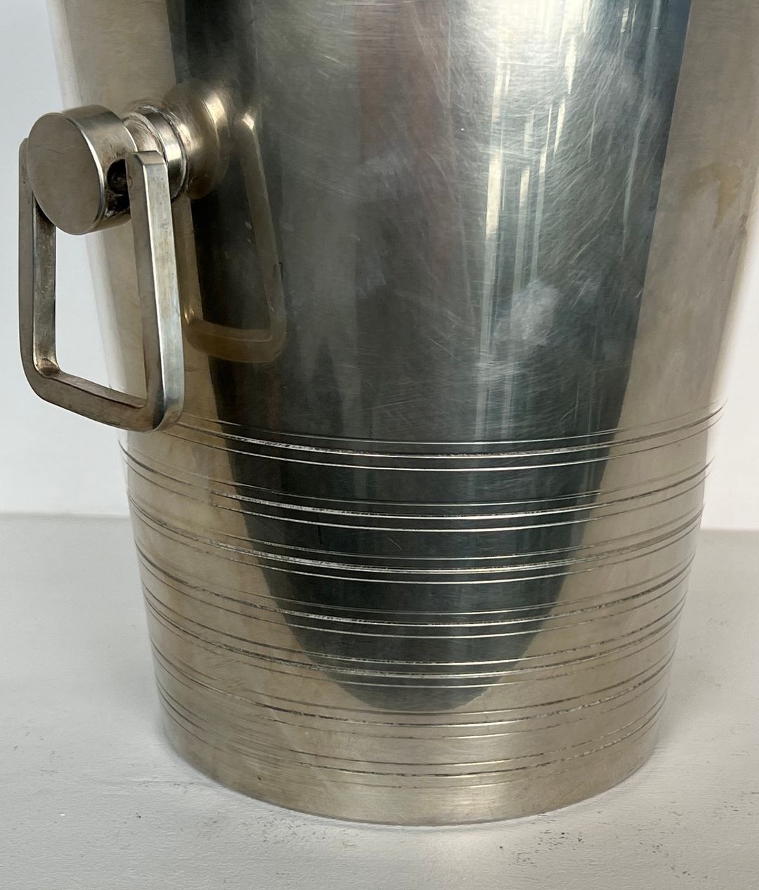 Conical silver-plated champagne bucket in the Art Deco manner, with a polished upper body, a lower section decorated with horizontal reeded bands and two small hinged ring drop-handles on either side. French marked, circa 1930. W. 23 × D. 18.5 × H. 20.5 cm.
