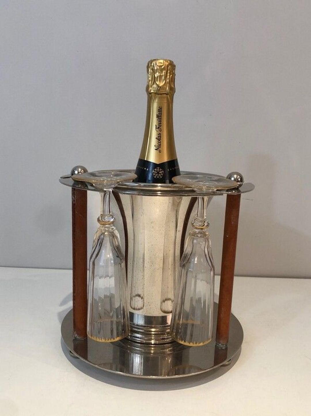 Combined champagne bucket and flute holders of this type are rare. Most champagne services of the period kept the ice bucket and the glasses separate; the integration of both into a single freestanding presentation object requires a considerably more ambitious design solution, and the maker of this piece has resolved it with notable elegance. The service functions perfectly: the bucket chills the bottle while the flutes, held in the ring above, are kept close to hand and displayed to advantage.